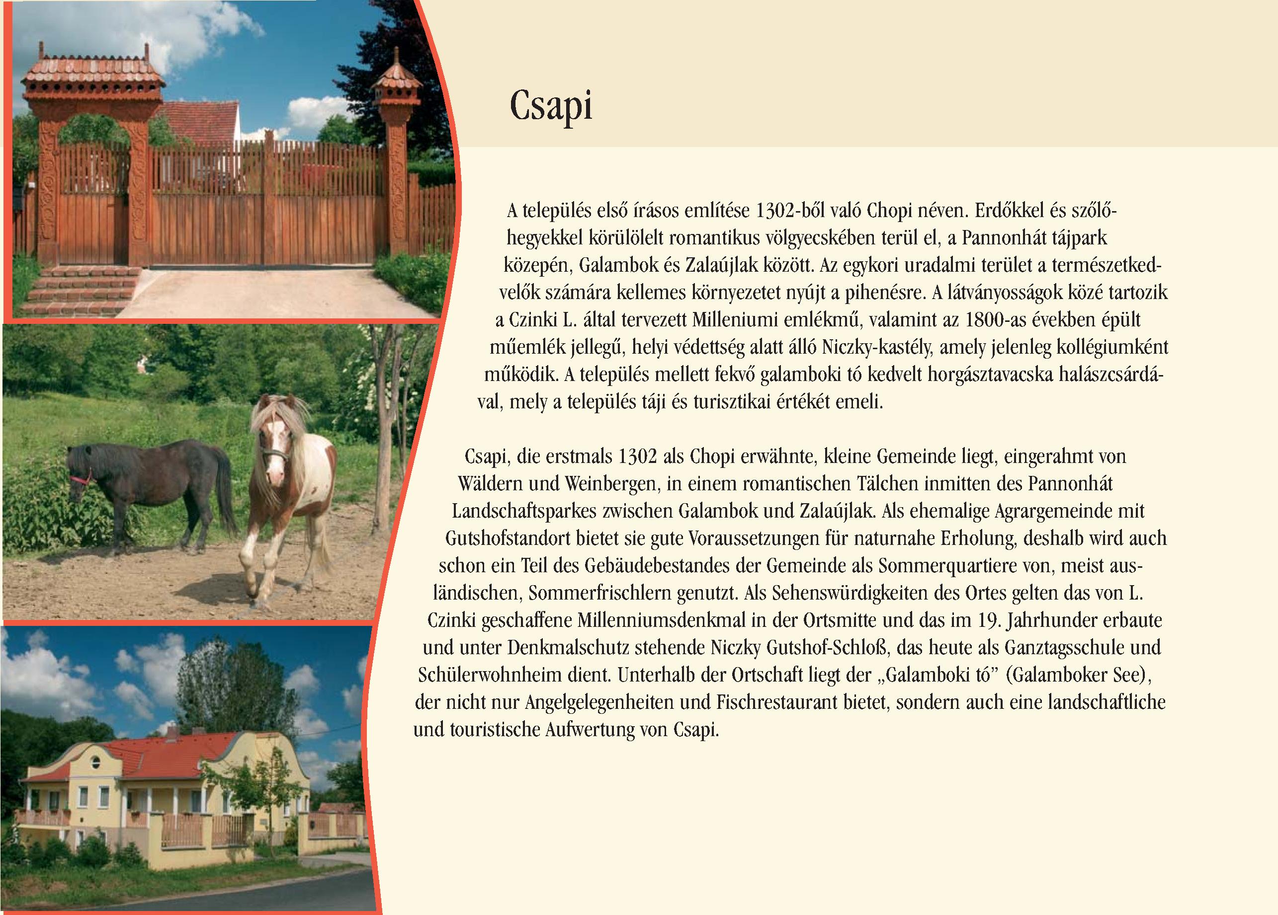 Nyilvános 2284 | 8266 | Csapi | Csapi, die erstmals 1302 als Chopi erwähnte, kleine Gemeinde liegt, eingerahmt von Wäldern und Weinbergen, in einem romantischen Tälchen inmitten des Pannonhát Landschaftsparkes zwischen Galambok und Zalaújlak. Als ehemalige Agrargemeinde mit Gutshofstandort bietet sie gute Voraussetzungen für naturnahe Erholung, deshalb wird auch schon ein Teil des Gebäudebestandes der Gemeinde als Sommerquartiere von, meist ausländischen, Sommerfrischlern genutzt. Als Sehenswürdigkeiten des Ortes gelten das von L. Czinki geschaffene Millenniumsdenkmal in der Ortsmitte und das im 19. Jahrhunder erbaute und unter Denkmalschutz stehende Niczky Gutshof-Schloß, das heute als Ganztagsschule und Schülerwohnheim dient. Unterhalb der Ortschaft liegt der ,,Galamboki tó" (Galamboker See), der nicht nur Angelgelegenheiten und Fischrestaurant bietet, sondern auch eine landschaftliche und touristische Aufwertung von Csapi. Dieses Text stammt von: Pannonhát tájpark prospektus 2006. Web: http://www.pannonhat.hu/ (auch in Deutsch) |