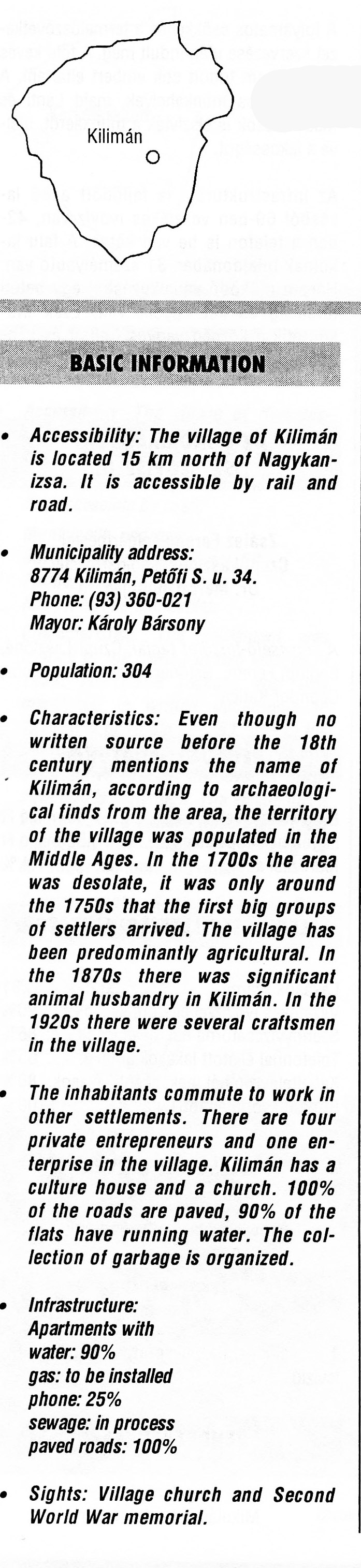 Nyilvános 2061 | 5745 | Kilimán | BASIC INFORMATION Accessibility: The village of Kilimán is located 15 km north of Nagykanizsa. It is accessible by rail and road. Municipality address: 8774 Kilimán, Petőfi S. u. 34. Phone: (93) 360-021 Mayor: Károly Bársony Population: 304 Characteristics: Even though no written source before the 18th century mentions the name of Kilimán, according to archaeological finds from the area, the territory of the village was populated in the Middle Ages. In the 1700s the area was desolate, it was only around the 1750s that the first big groups of settlers arrived. The village has been predominantly agricultural. In the 1870s there was significant animal husbandry in Kilimán. In the 1920s there were several craftsmen in the village. The inhabitants commute to work in other settlements. There are four private entrepreneurs and one enterprise in the village. Kilimán has a culture house and a church. 100% of the roads are paved, 90% of the flats have running water. The collection of garbage is organized. Infrastructure: Apartments with water: 90% gas: to be installed phone: 25% sewage: in process paved roads: 100% Sights: Village church and Second World War memorial. This text came from the following book: Title: Handbook of Zala county (Zala megye kézikönyve) Series: County handbooks of Hungary (Magyarország megyei kézikönyvei) Chief editor: Hóbor József Publisher: (Hatvan), CEBA-Hungary Ltd, 1998 ETO: 908.439.121(035) ; 050.8(439.121) ISBN: 963-9089-18-2 Pages: 488-1040 p. Remark: Closed on: 1998. márc. 31. |
