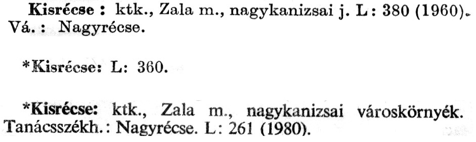 Nyilvános 1706 | 3504 | A szócikkek felismertetett szövege: | (Az első csillag után az 1972-es, a második csillag után az 1981-es kiadású kiegészítő kötetből származó szöveg következik) Kisrécse: ktk., Zala m., nagykanizsai j. L: 380 (1960) Vá. : Nagyrécse. *Kisrécse: L: 360. *Kisrécse: ktk., Zala m., nagykanizsai városkörnyék. Tanácsszékh.: Nagyrécse. L: 261 (1980). A szócikkek a következő lexikonból származnak: Cím: Új magyar lexikon Közreműködő: Berei Andor (1900-1979) (szerk.) Szerz. közl.: [szerk. Berei Andor et al.] Kiadás jelzés: 2. lny. Kiadás: Budapest : Akad. K., 1961-1962 Kötetei: 1., A - C 2., D - F 3., G - J 4., K - Me 5., Mf - R 6., S - Z 7. köt., A-Z Kiegészítő kötet (1972) Kiegészítő kötet, 1962÷1980 (1981) ETO jelzet: 03=945.11 Szakjelzet: 030 Cutter: U 28 Nyelv: magyar Megjegyzés: Bibliogr. a címszavak egy részének végén |