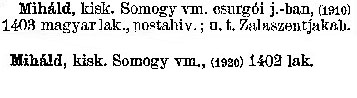 Nyilvános 2082 | 5351 | Miháld | kisk. Somogy vm. csurgói j. -ban, (1910) 1403 magyar lak., postahiv.; u. t. Zalaszentjakab. Miháld kisk. Somogy vm., (1920) 1402 lak. Cím: Révai nagy lexikona Alcím: az ismeretek enciklopédiája Kiadás: Budapest : Révai testvérek, [1911]- Kötetei: 1. köt., A - Arany 2. köt., Arány - Beke 3. köt., Béke - Brutto 4. köt., Bratus - Csát 5. köt., Csata - Duc 6. köt., Duc - Etele 7. köt., Stelka - Földöv 8. köt., Földpálya - Gres 9. köt., Gréc - Herold 10. köt., Hérold - Jób 11. köt., Jób - Nontur 12. köt., Kontúr - Lovas 13. köt., Lovas - Mons 14. köt., Mens - Ottó 15. köt., Ottó - Racine 16. köt., Racine - Sodoma 17. köt., Sodoma - Tarján 18. köt., 19. köt., Vár - Zsüri | Kiegészítés Aachen - Beöthy 20. köt., Kiegészítés: Bér - Zsolt ETO jelzet: 03=945.11 Szakjelzet: 030 Cutter: R 62 Nyelv: magyar |