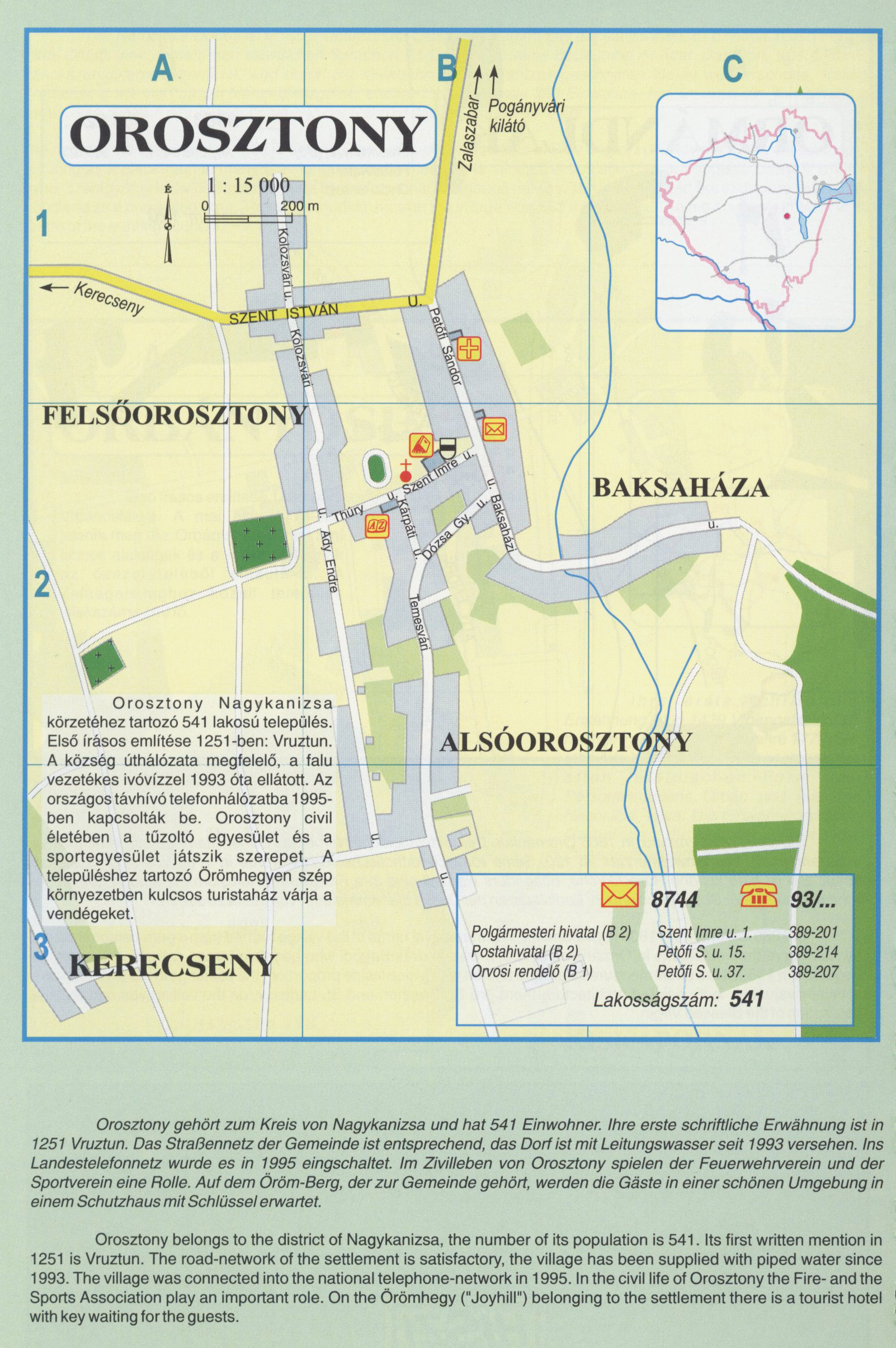 Nyilvános 2412 | 9475 | OROSZTONY | Orosztony Nagykanizsa körzetéhez tartozó 541 lakosú település. Első írásos említése 1251-ben: Vruztun. A község úthálózata megfelelő, a falu. vezetékes ivóvízzel 1993 óta ellátott. Az országos távhívó telefonhálózatba 1995-ben kapcsolták be. Orosztony civil életében a tűzoltó egyesület és a sportegyesület játszik szerepet. A településhez tartozó Örömhegyen szép környezetben kulcsos turistaház várja a vendégeket. Orosztony gehört zum Kreis von Nagykanizsa und hat 541 Einwohner. Ihre erste schriftliche Erwähnung ist in 1251 Vruztun. Das Straßennetz der Gemeinde ist entsprechend, das Dorf ist mit Leitungswasser seit 1993 versehen. Ins Landestelefonnetz wurde es in 1995 eingschaltet. Im Zivilleben von Orosztony spielen der Feuerwehrverein und der Sportverein eine Rolle. Auf dem Öröm-Berg, der zur Gemeinde gehört, werden die Gäste in einer schönen Umgebung in einem Schutzhaus mit Schlüssel erwartet. Orosztony belongs to the district of Nagykanizsa, the number of its population is 541. Its first written mention in 1251 is Vruztun. The road-network of the settlement is satisfactory, the village has been supplied with piped water since 1993. The village was connected into the national telephone-network in 1995. In the civil life of Orosztony the Fire- and the Sports Association play an important role. On the Örömhegy ("Joyhill") belonging to the settlement there is a tourist hotel with key waiting forthe guests. A részlet a következő kiadványból származik/Die Teile stammen vom volgenden Buch/This text came from the following book: Cím/Titel/Title: Zala megye településeinek atlasza - 257 település részletes térképe/Atlas der Komitat Zala - 257 Detailte Siedlungskarten/Zala county\'s Atlas - 257 settlement maps. Közreműködő/contributor: Lackner László (1943) (fotó) Kiadás/Ausgabe/Publisher: Gyula : HISZI-MAP, 1997 Sorozat/Serie/Series: Indulástól - megérkezésig... ETO: 912(439.121-2) ; 908.439.121 Cutter: Z 19 ISBN: 963-610-025-4 Oldalszám/Seiten/Pages: 323, 81 p. Megjegyzés/Note: Lezárva/Abgeschlossen am/Closed am: 1997. máj. 30. |