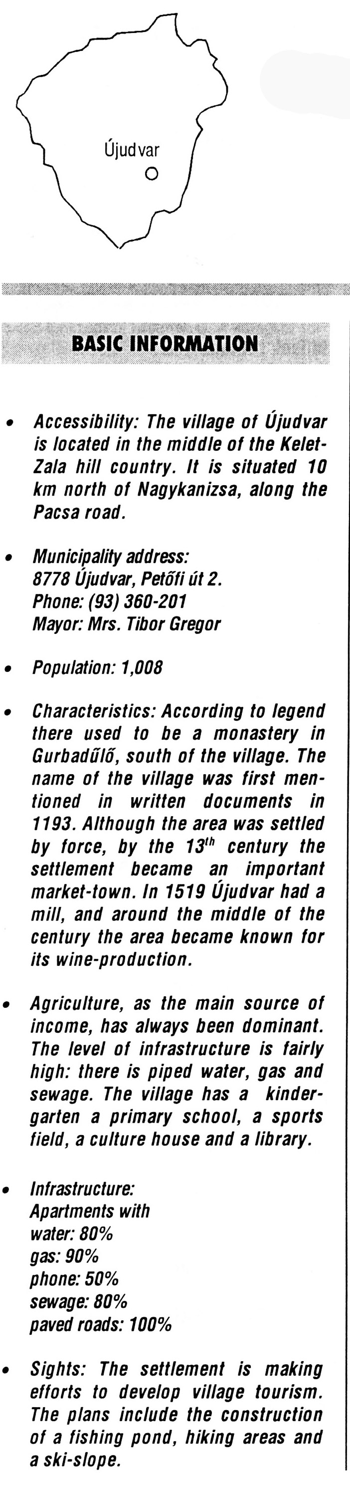 Nyilvános 2049 | 5905 | Újudvar | BASIC INFORMATION Accessibility: The village of Újudvar is located in the middle of the Kelet-Zala hill country. It is situated 10 km north of Nagykanizsa, along the Pacsa road. Municipality address: 8778 Újudvar, Petőfi út 2. Phone: (93) 360-201 Mayor: Mrs. Tibor Gregor Population: 1,008 Characteristics: According to legend there used to be a monastery in Gurbadűlő, south of the village. The name of the village was first mentioned in written documents in 1193. Although the area was settled by force, by the 13th century the settlement became an important market-town. In 1519 Újudvar had a mill, and around the middle of the century the area became known for its wine-production. Agriculture, as the main source of income, has always been dominant. The level of infrastructure is fairly high: there is piped water, gas and sewage. The village has a kindergarten a primary school, a sports field, a culture house and a library. Infrastructure: Apartments with water: 80% gas: 90% phone: 50% sewage: 80% paved roads: 100% Sights: The settlement is making efforts to develop village tourism. The plans include the construction of a fishing pond, hiking areas and a ski-slope. This text came from the following book: Title: Handbook of Zala county (Zala megye kézikönyve) Series: County handbooks of Hungary (Magyarország megyei kézikönyvei) Chief editor: Hóbor József Publisher: (Hatvan), CEBA-Hungary Ltd, 1998 ETO: 908.439.121(035) ; 050.8(439.121) ISBN: 963-9089-18-2 Pages: 488-1040 p. Remark: Closed on: 1998. márc. 31. |