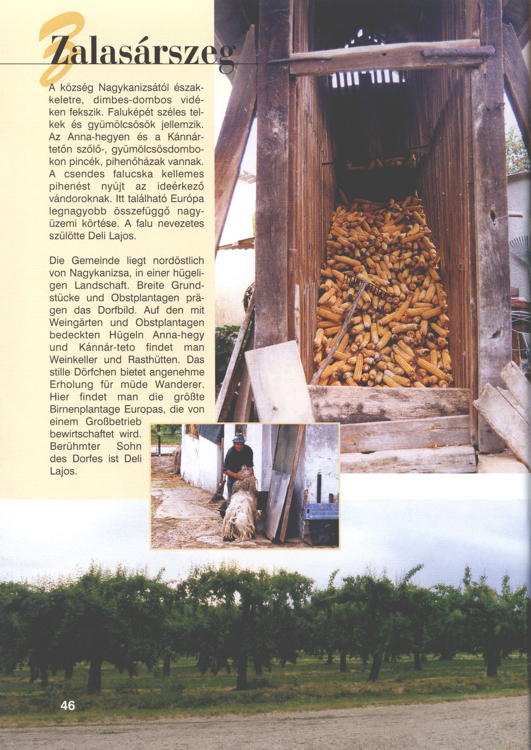 Nyilvános 2053 | 5610 | Zalasárszeg | Die Gemeinde liegt nordöstlich von Nagykanizsa, in einer hügeligen Landschaft. Breite Grundstücke und Obstplantagen prägen das Dorfbild. Auf den mit Weingärten und Obstplantagen bedeckten Hügeln Anna-hegy und Kánnár-tető findet man Weinkeller und Rasthütten. Das stille Dörfchen bietet angenehme Erholung für müde Wanderer. Hier findet man die größte Birnenplantage Europas, die von einem Großbetrieb bewirtschaftet wird. Berühmter Sohn des Dorfes ist Deli Lajos. Dieses Text stammt von: Titel: Hívogató a Régiók Kapujában - Útikönyv Látnivalók Nagykanizsán és Térségében (Einladend in dem Tor des Gebiets - Reisebuch - Sehenswürdigkeiten in Nagykanizsa und Umgebung) Herausgegeben von: Nagykanizsa és a Környező Települések Területfejlesztési Társulása (Verein für Gebietsentwicklung in Nagykanizsa und in ihrer Umgebung) 8800 Nagykanizsa, Petőfi Sándor út 5. Tel.: 06 93/536-453 • 06 93/536-454 Tel ./Fax: 06 93/326-323 E-mail: terstars@axelero.hu www.kanizsaterseg.celodin.hu |