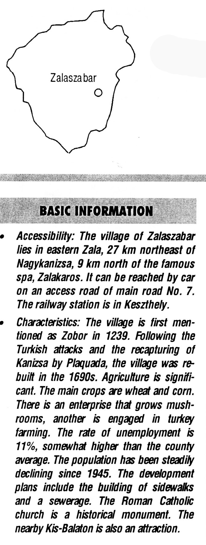 Nyilvános 2190 | 7590 | Zalaszabar | BASIC INFORMATION Accessibility: The village of Zalaszabar lies in eastern Zala, 27 km northeast of Nagykanizsa, 9 km north of the famous spa, Zalakaros. It can be reached by car on an access road of main road No. 7. The railway station is in Keszthely. Characteristics: The village is first mentioned as Zobor in 1239. Following the Turkish attacks and the recapturing of Kanizsa by Plaquada, the village was rebuilt in the 1690s. Agriculture is significant. The main crops are wheat and corn. There is an enterprise that grows mushrooms, another is engaged in turkey farming. The rate of unemployment is 11%, somewhat higher than the county average. The population has been steadily declining since 1945. The development plans include the building of sidewalks and a sewerage. The Roman Catholic church is a historical monument. The nearby Kis-Balaton is also an attraction. This text came from the following book: Title: Handbook of Zala county (Zala megye kézikönyve) Series: County handbooks of Hungary (Magyarország megyei kézikönyvei) Chief editor: Hóbor József Publisher: (Hatvan), CEBA-Hungary Ltd, 1998 ETO: 908.439.121(035) ; 050.8(439.121) ISBN: 963-9089-18-2 Pages: 488-1040 p. Remark: Closed on: 1998. márc. 31. |