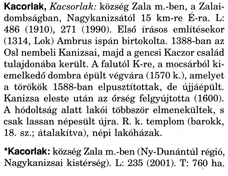 Nyilvános 2301 | 6368 | A szócikkek felismertetett szövege: | (A csillag után a kiegészítő kötetből származó szöveg következik) Kacorlak, Kacsorlak: község Zala m.-ben, a Zalaidombságban, Nagykanizsától 15 km-re É-ra. L: 486 (1910), 271 (1990). Első írásos említésekor (1314, Lok) Ambrus ispán birtokolta. 1388-ban az Osl nembeli Kanizsai, majd a gencsi Kaczor család tulajdonába került. A falutól K-re, a mocsárból kiemelkedő dombra épült végvára (1570 k.), amelyet a törökök 1588-ban elpusztítottak, de újjáépült. Kanizsa eleste után az őrség felgyújtotta (1600). A hódoltság alatt lakói többször elmenekültek, s csak lassan népesült újra. R. k. templom (barokk, 18. sz.; átalakítva), népi lakóházak. *Kacorlak: község Zala m.-ben (Ny-Dunántúl régió, Nagykanizsai kistérség). L: 235 (2001). T: 760 ha. A szócikkek a következő lexikonból származnak: Cím: Magyar nagylexikon Közreműködő: Élesztős László (1949) (szerk.) ; Barabás Éva (1943) (szerk.) ; Berényi Gábor (1946) (szerk.) ; Bárány Lászlóné (szerk.) ; Adelmann-né Kertész Judit (1945) (közrem.) ; Froemel Károlyné Jáky Éva (1936) (közrem.) ; Akadémiai Kiadó és Nyomda Vállala Szerz. közl.: [... Élesztős László főszerk.] ; [szerk. Barabás Éva et al.] ; [bibliogr. Adelmanné Kertész Judit] ; [kész. az Akadémiai Kiadó Magyar Nagylexikon Szerkesztőségében] Kiadás: Budapest : Akad. K., 1993- Kötetei: 1. köt., A - Anc 2. köt., And - Bag 3. köt., Bah - Bij 4. köt., Bik - Bz 5. köt., C - Csem 6. köt., Csen - Ec 7. köt., Ed - Fe 8. köt., Ff - Gyep 9. köt., Gyer - Iq 10. köt., Ir - Kip 11. köt., Kir - Lem 12. köt., Len - Mep 13. köt., Mer - Nyk 14. köt., Nyl - Pom 15. köt., Pon - Sek 16. köt., Sel - Szö 17. köt., Szp - Ung 18. köt., Unh - Z 19. köt., Kiegészítő kötet, A - Z ETO jelzet: 030=945.11 Szakjelzet: 030 Cutter: M 14 ISBN: 963-05-6611-7 [!ISBN 963-05-6615-X] Nyelv: magyar Megjegyzés: Az 5. kötettől kiad. a Magyar Nagylexikon Kiadó ; A 6. kötettől főszerk. Berényi Gábor ; A 6. kötettől szakszerk. Bárány Lászlóné et al. ; A 6. kötettől bibliogr. Froemel Károlyné ; Bibliogr. a szócikkek végén |