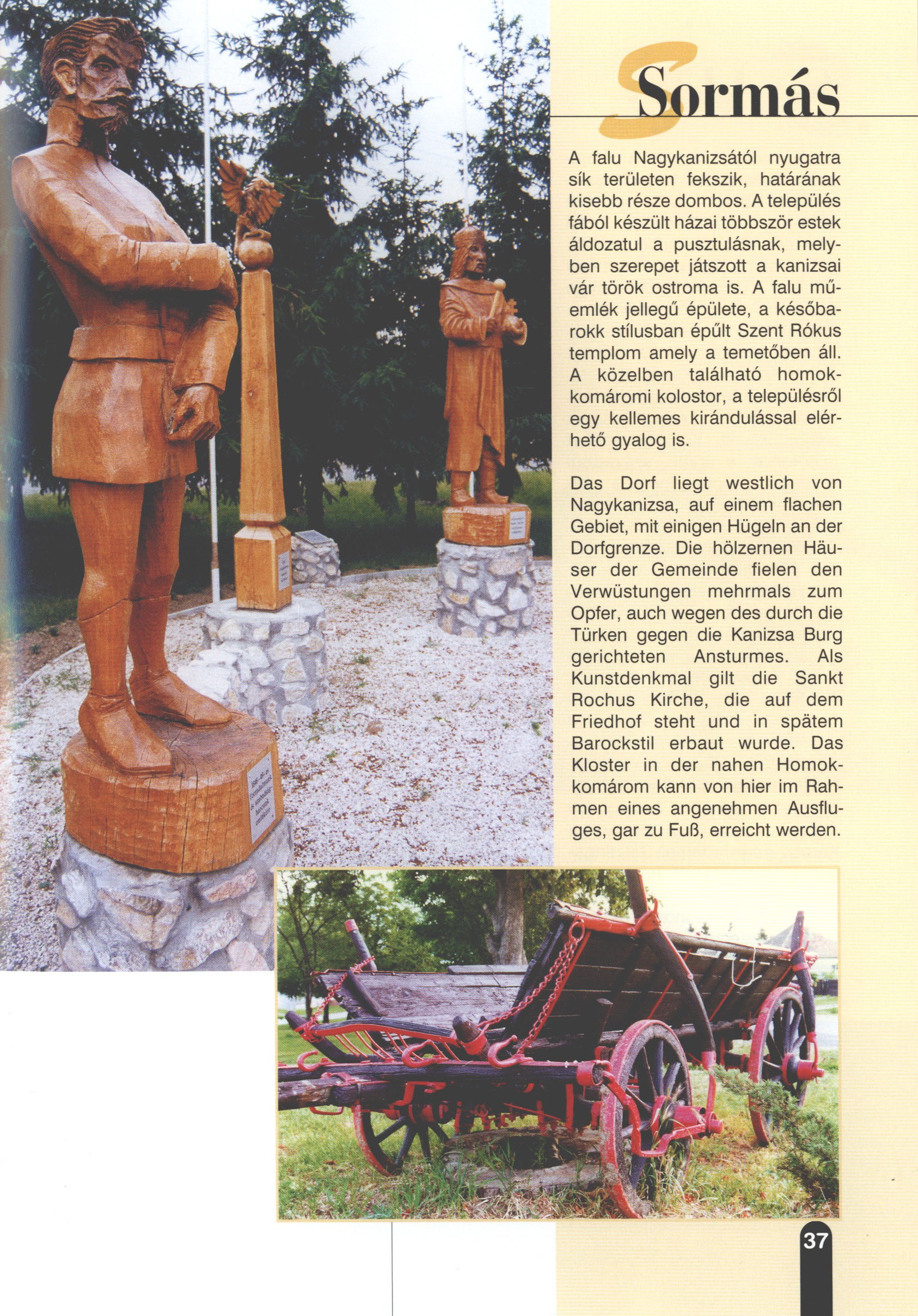Nyilvános 2162 | 7652 | Sormás | Das Dorf liegt westlich von Nagykanizsa, auf einem flachen Gebiet, mit einigen Hügeln an der Dorfgrenze. Die hölzernen Häuser der Gemeinde fielen den Verwüstungen mehrmals zum Opfer, auch wegen des durch die Türken gegen die Kanizsa Burg gerichteten Ansturmes. Als Kunstdenkmal gilt die Sankt Rochus Kirche, die auf dem Friedhof steht und in spätem Barockstil erbaut wurde. Das Kloster in der nahen Homokkomárom kann von hier im Rahmen eines angenehmen Ausfluges, gar zu Fuß, erreicht werden. Dieses Text stammt von: Titel: Hívogató a Régiók Kapujában - Útikönyv Látnivalók Nagykanizsán és Térségében (Einladend in dem Tor des Gebiets - Reisebuch - Sehenswürdigkeiten in Nagykanizsa und Umgebung) Herausgegeben von: Nagykanizsa és a Környező Települések Területfejlesztési Társulása (Verein für Gebietsentwicklung in Nagykanizsa und in ihrer Umgebung) 8800 Nagykanizsa, Petőfi Sándor út 5. Tel.: 06 93/536-453 • 06 93/536-454 Tel ./Fax: 06 93/326-323 E-mail: terstars@axelero.hu www.kanizsaterseg.celodin.hu |