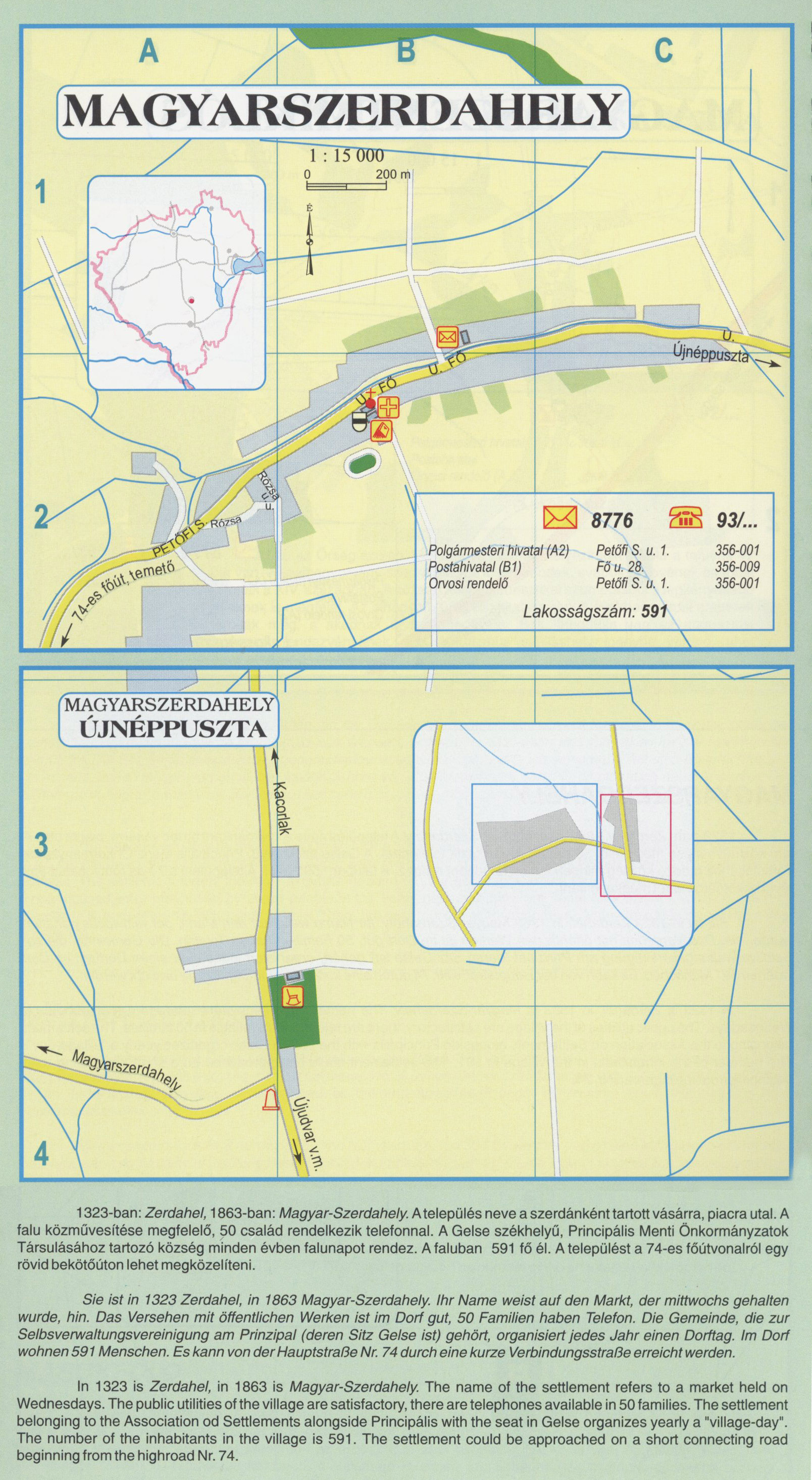 Nyilvános 2397 | 9299 | MAGYARSZERDAHELY | 1323-ban: Zerdahel, 1863-ban: Magyar-Szerdahely. A település neve a szerdánként tartott vásárra, piacra utal. A falu közművesítése megfelelő, 50 család rendelkezik telefonnal. A Gelse székhelyű, Principális Menti Önkormányzatok Társulásához tartozó község minden évben falunapot rendez. A faluban 591 fő él. A települést a 74-es főútvonalról egy rövid bekötőúton lehet megközelíteni. Sie ist in 1323 Zerdahel, in 1863 Magyar-Szerdahely. Ihr Name weist auf den Markt, der mittwochs gehalten wurde, hin. Das Versehen mit öffentlichen Werken ist im Dorf gut, 50 Familien haben Telefon. Die Gemeinde, die zur Selbsverwaltungsvereinigung am Prinzipal (deren Sitz Gelse ist) gehört, organisiert jedes Jahr einen Dorftag. Im Dorf wohnen 591 Menschen. Es kann von der Hauptstraße Nr. 74 durch eine kurze Verbindungsstraße erreicht werden. In 1323 is Zerdahel, in 1863 is Magyar-Szerdahely. The name of the settlement refers to a market held on Wednesdays. The public utilities of the village are satisfactory, there are telephones available in 50 families. The settlement belonging to the Association od Settlements alongside Principális with the seat in Gelse organizes yearly a "village-day". The number of the inhabitants in the village is 591. The settlement could be approached on a short connecting road beginning from the highroad Nr. 74. |