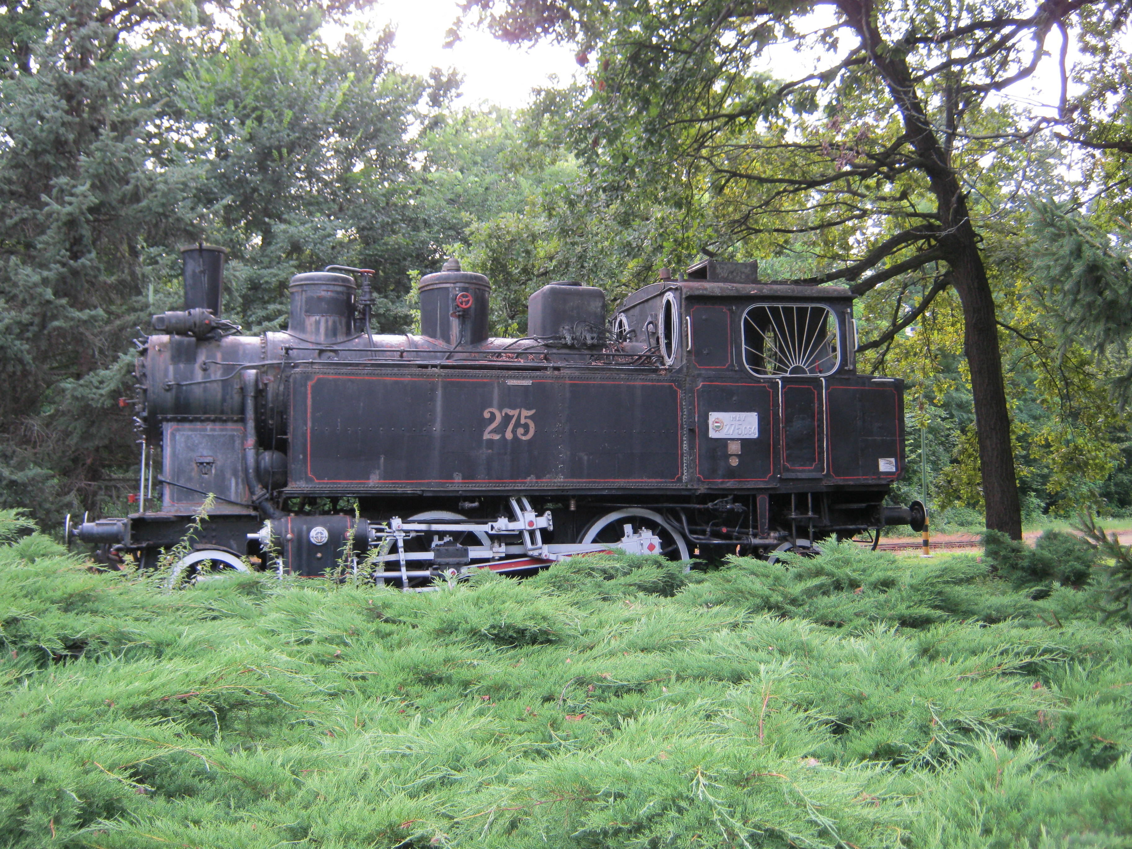 Nyilvános 941 | 3836 | Nyíregyháza-Sóstó, Vasútállomás | Sóstófürdő központjában ma étteremként üzemel a régi vasútállomás műemlékké nyilvánított épülete. 1911-ben ezt is Pazár István tervezte, eklektikus stílusban. Közelében a kisvasút egyik régi mozdonya is látható. A fénykép 2010 augusztus elején készült |