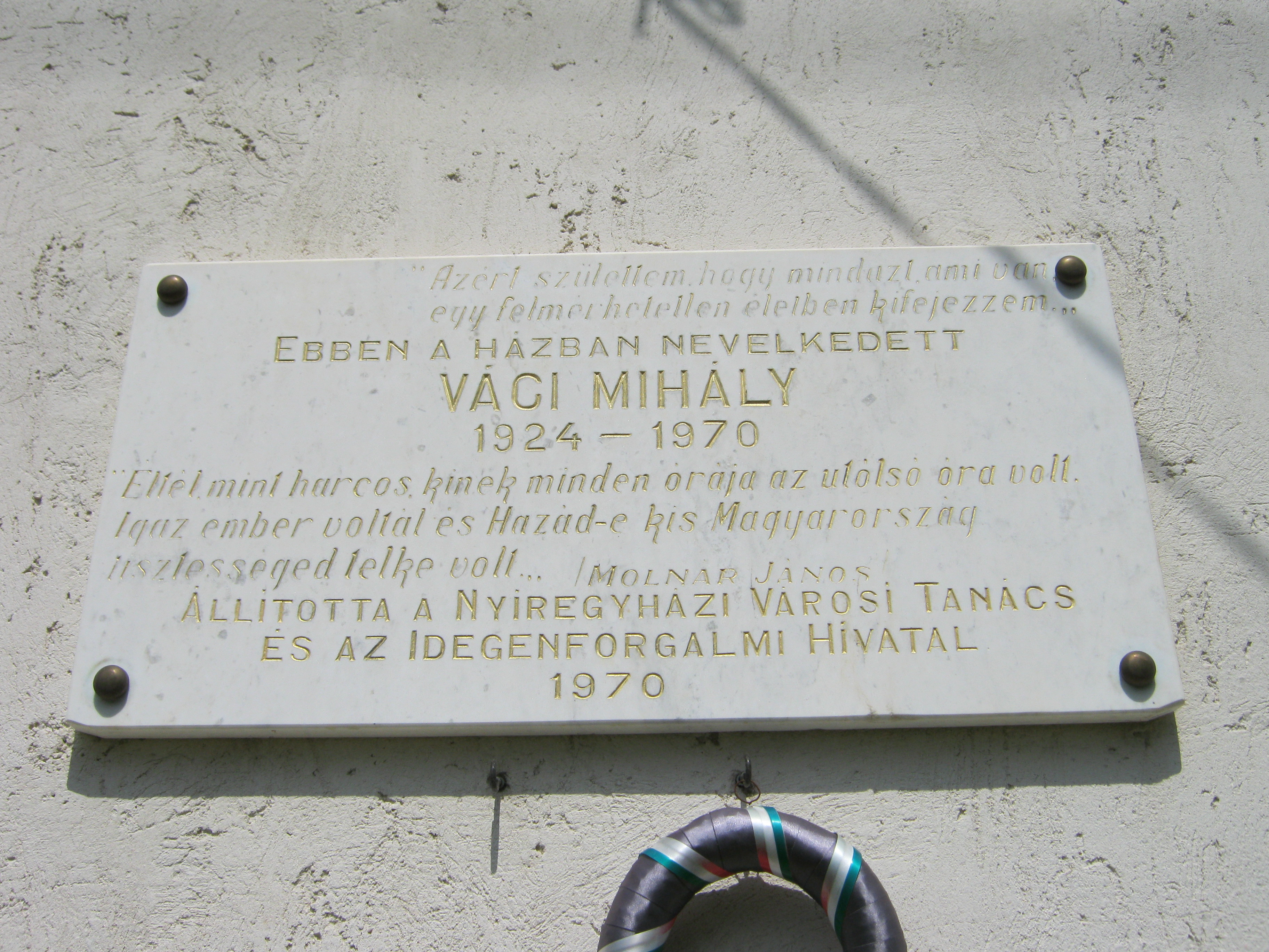 Nyilvános 900 | 1239 | Nyíregyháza, Bartók Béla utca 32. | Mielőtt a Debrecen felé vezető műút átszelné a vasútvonalat, Nyíregyháza központjától távol, a Bartók Béla utcában ma is álló családi házon emléktáblát találunk: "Ebben a házban nevelkedett Váci Mihály". A Szeder utca 59. alatt egykor álló zsúptetős cselédházban született (oda sajnos nem jutottam el, a mai épületet ott is emléktábla jelöli). Életrajzírója, Kovács Sándor Iván így jellemzi gyermekkori környezetét: "Nincs még egy költőnk Illyés Gyula óta, akinek indulását oly meghatározó erővel befolyásolná szülőföld és családi környezet, mint Váci Mihályét. Szülőföldjéről egyszerre hozta magával a nyírségi tájak és a szociális nyomorúság élményét; a tébécé halálos fenyegetésén kívül egyedül ezt jussolta 'névtelen kis cseléd' őseitől, s költészetének és prózájának mindvégig éltető közege ez a kettős inspiráció." A költő 15 éves koráig lakott egy szobában csont-tuberkulózisban szenvedő nagyanyjával. Hat testvére közül csak egy maradt életben. Ebből a közegből származva végezte el a tanítóképzőt (lásd: Nyíregyháza, Széchenyi u. 6.), majd pályáját tanyasi tanítóként kezdte. Váci Mihály nyíregyházi emlékhelyeiről kiváló összefoglalás található itt (2010. 08. 29.): www.vacimihalykor.hu/siremlekek/nyiregyhaza.htm Felh. irod.: Kovács Sándor Iván: Váci Mihály. Bp. Akadémiai Kiadó, 1972 A fénykép 2010 augusztus elején készült. |