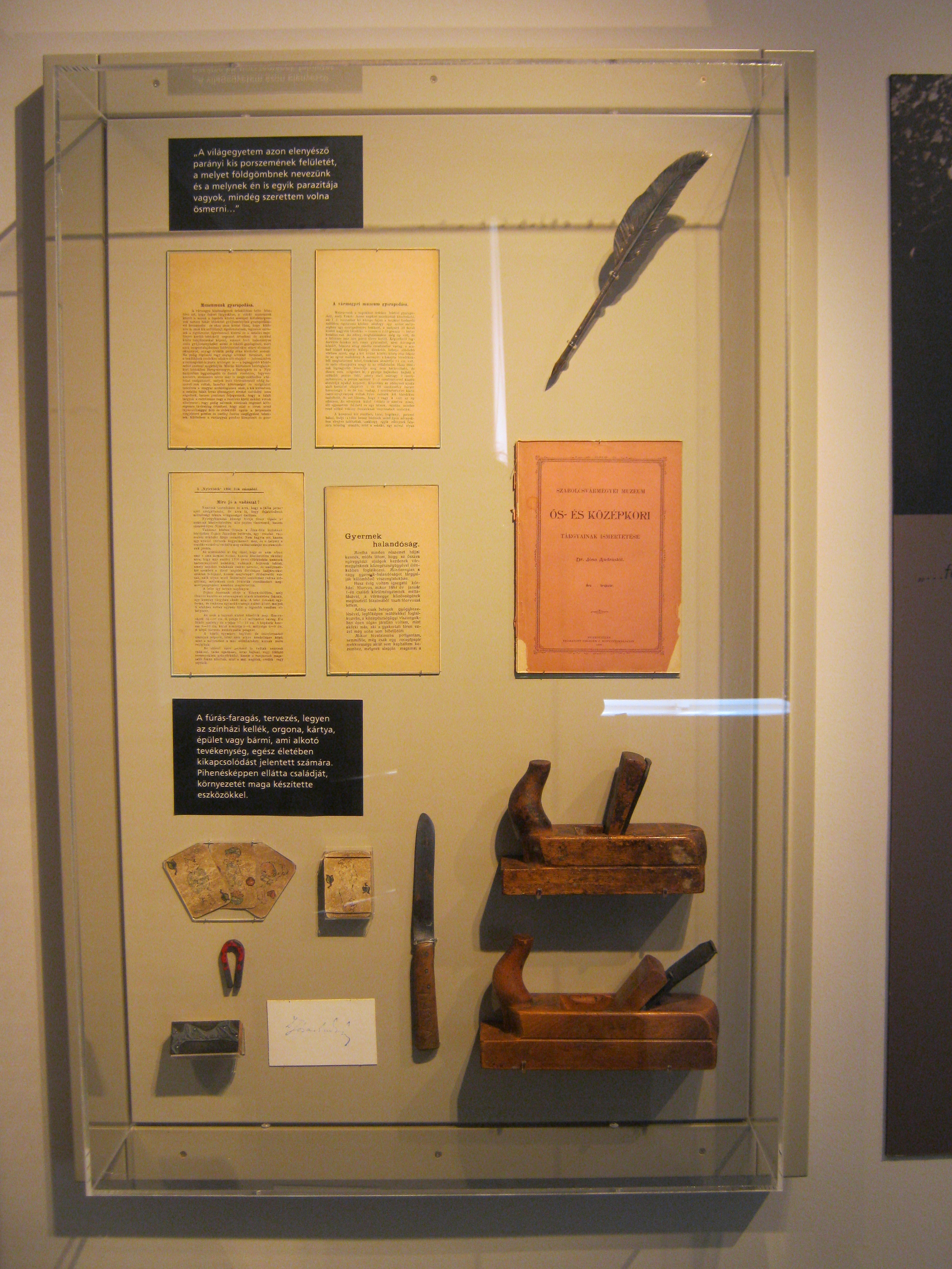 Nyilvános 936 | 1386 | Nyíregyháza, Benczúr tér 21. Jósa András Múzeum | Magyarország egyik legrégibb múzeumát Dr. Jósa András alapította 1868-ban, akinek ma nevét viseli. Jósa András (1834-1918) Szabolcs vármegye legendás orvosa volt. Színes, sokoldalú egyéniségként amatőr régészettel is foglalkozott. A múzeum elődét még korábbi lakóhelyén, Nagykállón (lásd: Nagykálló, Somogyi B. u. 5-7.) szervezte meg Szabolcs Megyei Régészeti Egylet néven, ugyanis akkor még Nagykálló volt a megyeszékhely. Nyíregyháza megyei központtá válása után a gyűjtemény és ő maga is ide költözött (lásd még: Nyíregyháza, Malom u. 3.). Az első kiállítást is ő rendezte 1899-ben, akkor még a vármegyeháza (lásd:Nyíregyháza, Hősök tere 5.) épületében. A képen a Jósa-emlékkiállítás egyik tárlója látható, benne az orvos-muzeológus famegmunkáló szerszámaival. Felh. irod.: Látnivalók Szabolcs-Szatmár-Bereg megyében. Miskolc, Well-PRess, 1999 http://jam.nyirbone.hu A fénykép 2010 augusztus elején készült. |