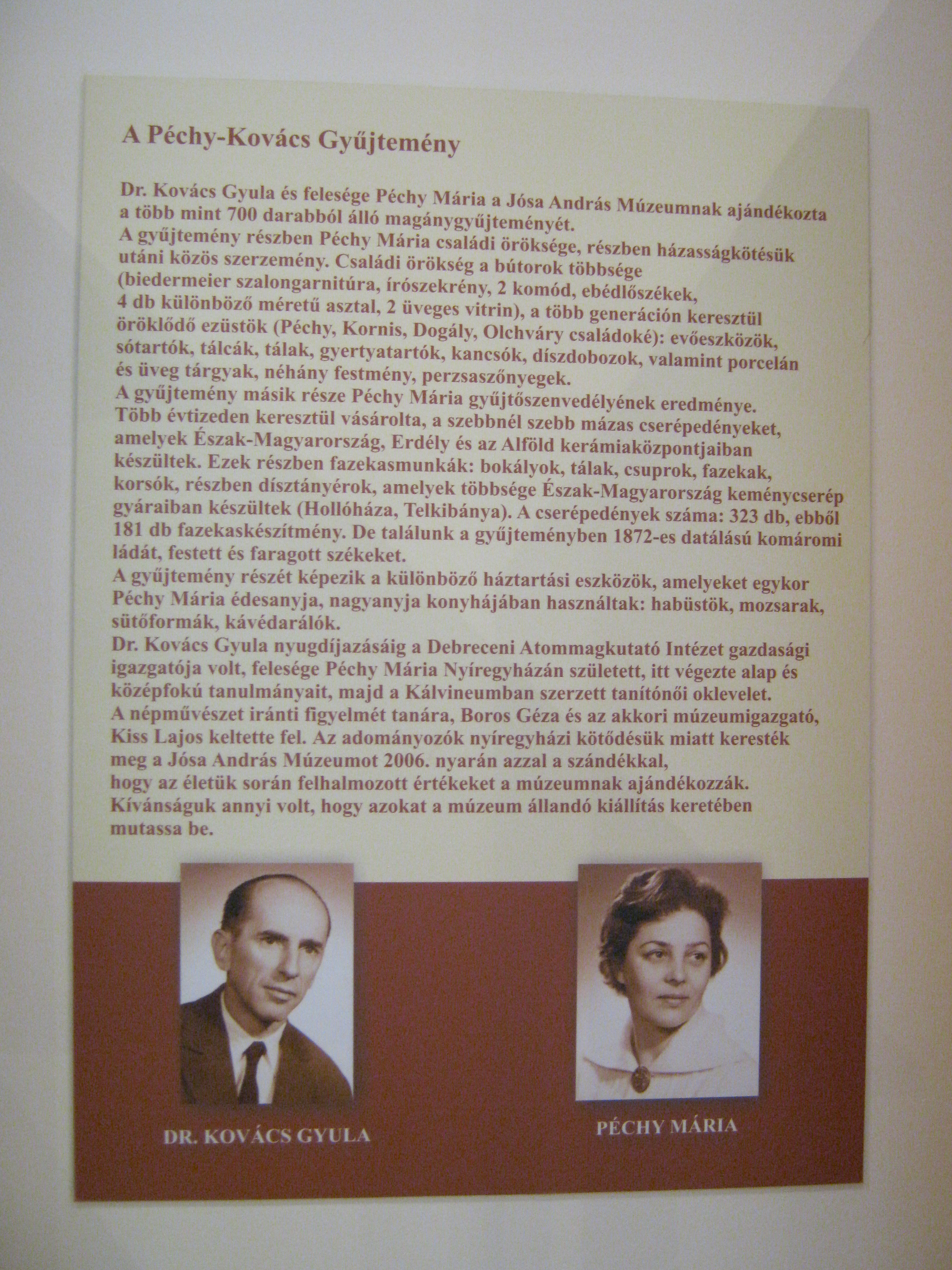 Nyilvános 911 | 1435 | Nyíregyháza, Benczúr tér 21. Jósa András Múzeum | Magyarország egyik legrégibb múzeumát Dr. Jósa András alapította 1868-ban, akinek ma nevét viseli. Egyik állandó kiállítása a Péchy - Kovács-gyűjtemény, dr. Kovács Gyula és felesége, Péchy Mária több, mint 700 darabból álló magánygyűjteménye. Dr. Kovács Gyula nyugdíjazásáig a Debreceni Atommagkutató Intézet gazdasági igazgatója volt, felesége tanítónő. A gyűjtemény egyik részét bútorok (biedermeier szalongarnitúra, ebédlőszékek, írószekrény stb.) és ezüst evőeszközök, tálcák, gyertyatartók és más tárgyak, valamint festmények és perzsaszőnyegek alkotják. A másik rész Péchy Mária gyűjtőszenvedélyének eredménye, aki több évtizeden keresztül vásárolta, a szebbnél szebb mázas cserépedényeket, amelyek Észak-Magyarország, Erdély és az Alföld kerámiaközpontjaiban készültek. Vannak itt különböző háztartási eszközök, amelyeket egykor Péchy Mária édesanyja, nagyanyja használt: habüstök, mozsarak, sütőformák, kávédarálók. Felh. irod.: Látnivalók Szabolcs-Szatmár-Bereg megyében. Miskolc, Well-PRess, 1999 http://jam.nyirbone.hu A fénykép 2010 augusztus elején készült. |