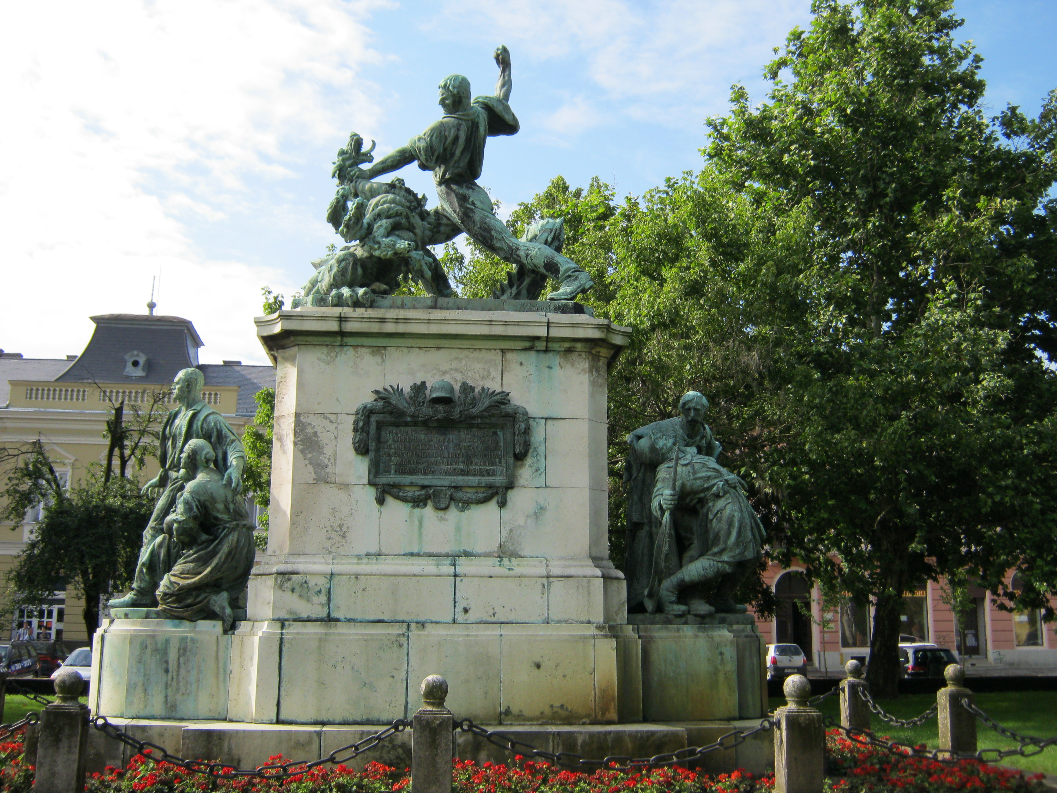 Nyilvános 936 | 1776 | Nyíregyháza, Hősök tere: Hősök emlékműve | A nagyméretű, angolpark jellegű Hősök tere a déli részén álló szoborkompozícióról kapta nevét. A Hősök című szoborcsoport Kisfaludi Stróbl Zsigmond műve. 1928-ban állították fel az első világháború hőseire és áldozataira emlékezve. Korábban helyén a Bessenyei Györgyöt ábrázoló szobor állt, amelyet ekkor költöztettek mai helyére (lásd: Nyíregyháza, Bessenyei tér). A szoborcsoport fő alakja a sárkánnyal küzdő hős, két mellékalakja (indulás a harcba és a vég) tartalmilag szorosan kapcsolódik a központi figurához. Felh. irod.: Látnivalók Szabolcs-Szatmár megyében. Miskolc, Well-PRess, 1999 A fénykép 2010 augusztus elején készült. |