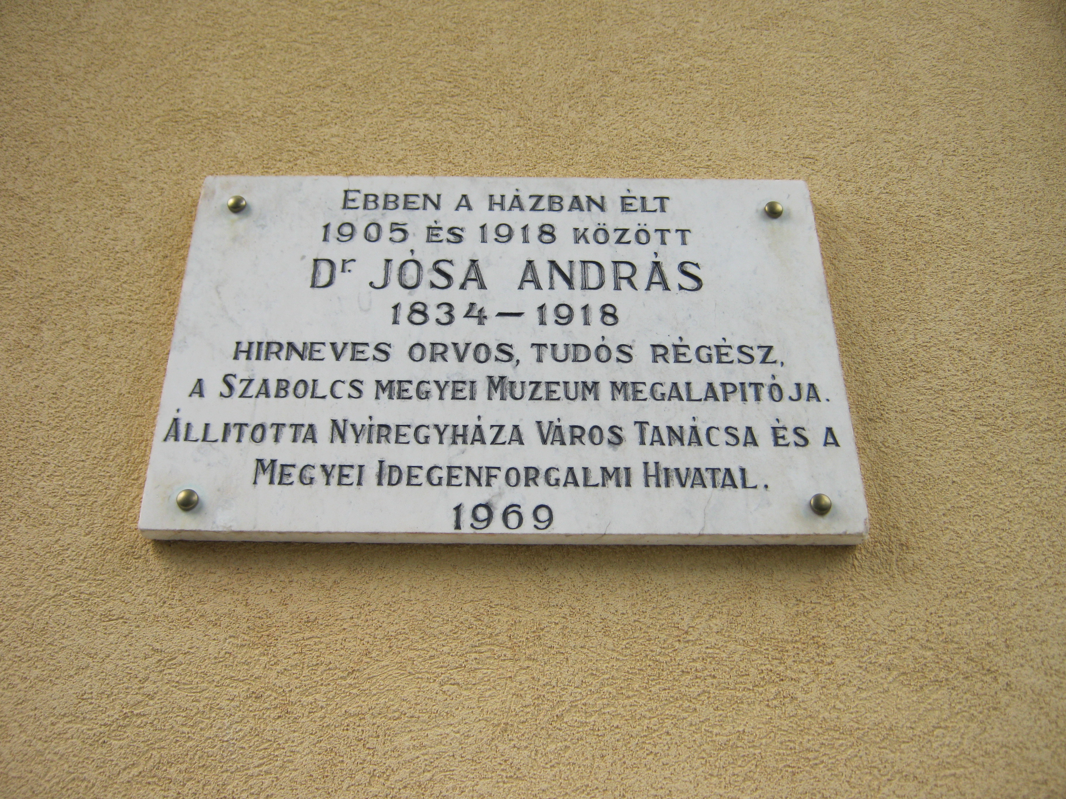 Nyilvános 887 | 1255 | Nyíregyháza, Malom utca 3. | Ebben a házban élt 1905 és 1918 között dr. Jósa András neves orvos, tudós régész, a megyei múzeum megalapítója. (Lásd még: Nyíregyháza, Benczúr tér 21 és Nagykálló, Somogyi Béla utca 5-7.). A fénykép 2010 augusztus elején készült. |