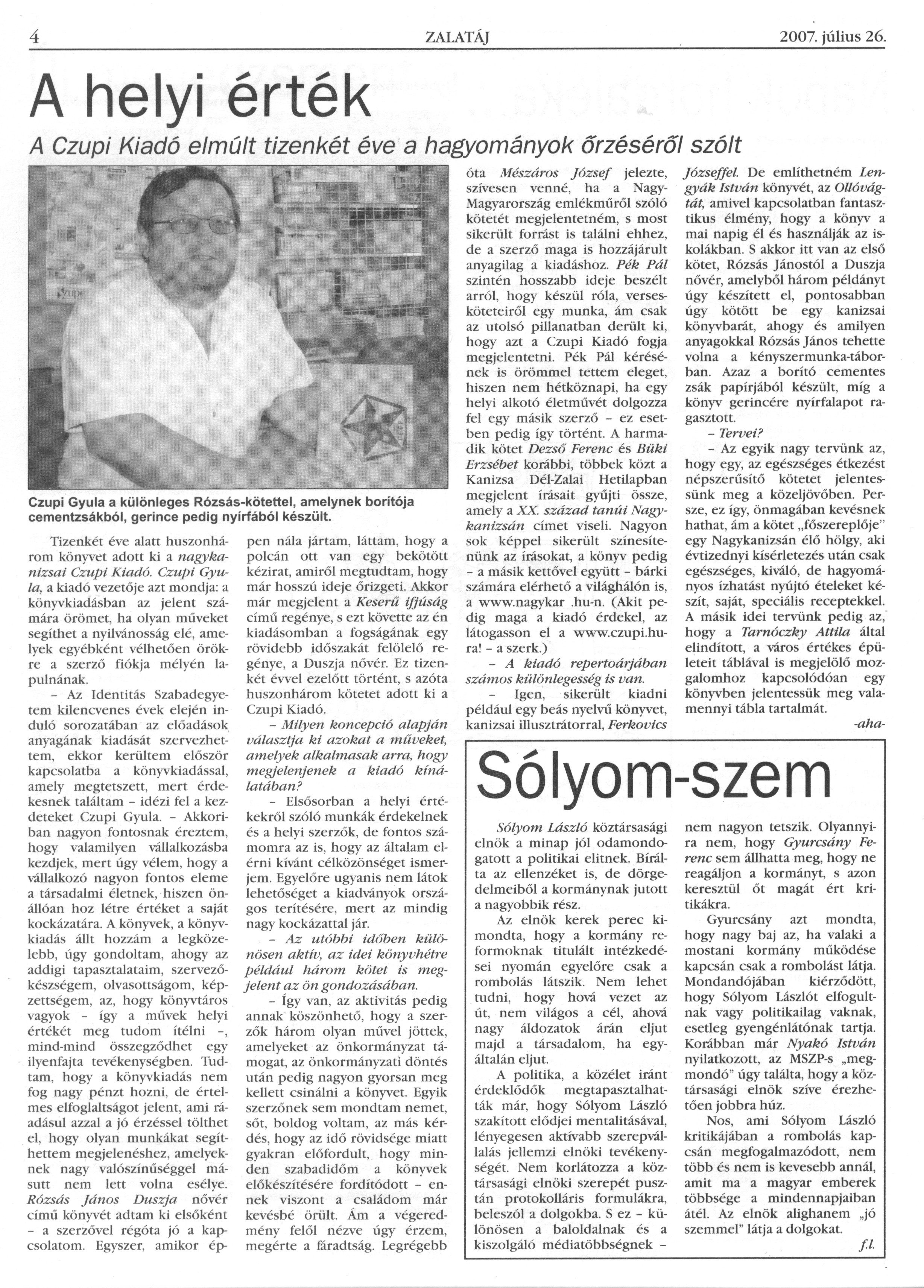 Nyilvános 1194 | 2644 | Zalatáj 2007. július 26. 650. szám 4. oldal | A helyi érték A Czupi Kiadó elmúlt tizenkét éve a hagyományok őrzéséről szólt Czupi Gyula a különleges Rózsás-kötettel, amelynek borítója cementzsákból, gerince pedig nyírfából készült. Tizenkét éve alatt huszonhárom könyvet adott ki a nagykanizsai Czupi Kiadó. Czupi Gyula, a kiadó vezetője azt mondja: a könyvkiadásban az jelent számára örömet, ha olyan műveket segíthet a nyilvánosság elé, amelyek egyébként vélhetően örökre a szerző fiókja mélyén lapulnának. – Az Identitás Szabadegyetem kilencvenes évek elején induló sorozatában az előadások anyagának kiadását szervezhettem, ekkor kerültem először kapcsolatba a könyvkiadással, amely megtetszett, mert érdekesnek találtam – idézi fel a kezdeteket Czupi Gyula. – Akkoriban nagyon fontosnak éreztem, hogy valamilyen vállalkozásba kezdjek, mert úgy vélem, hogy a vállalkozó nagyon fontos eleme a társadalmi életnek, hiszen önállóan hoz létre értéket a saját kockázatára. A könyvek, a könyvkiadás állt hozzám a legközelebb, úgy gondoltam, ahogy az addigi tapasztalataim, szervezőkészségem, olvasottságom, képzettségem, az, hogy könyvtáros vagyok – így a művek helyi értékét meg tudom ítélni –, mind-mind összegződhet egy ilyenfajta tevékenységben. Tudtam, hogy a könyvkiadás nem fog nagy pénzt hozni, de értelmes elfoglaltságot jelent, ami ráadásul azzal a jó érzéssel tölthet el, hogy olyan munkákat segíthettem megjelenéshez, amelyeknek nagy valószínűséggel másutt nem lett volna esélye. Rózsás János Duszja nővér című könyvét adtam ki elsőként – a szerzővel régóta jó a kapcsolatom. Egyszer, amikor éppen nála jártam, láttam, hogy a polcán ott van egy bekötött kézirat, amiről megtudtam, hogy már hosszú ideje őrizgeti. Akkor már megjelent a Keserű ifjúság című regénye, s ezt követte az én kiadásomban a fogságának egy rövidebb időszakát felölelő regénye, a Duszja nővér. Ez tizenkét évvel ezelőtt történt, s azóta huszonhárom kötetet adott ki a Czupi Kiadó. – Milyen koncepció alapján választja ki azokat a műveket, amelyek alkalmasak arra, hogy megjelenjenek a kiadó kínálatában? – Elsősorban a helyi értékekről szóló munkák érdekelnek és a helyi szerzők, de fontos számomra az is, hogy az általam elérni kívánt célközönséget ismerjem. Egyelőre ugyanis nem látok lehetőséget a kiadványok országos terítésére, mert az mindig nagy kockázattal jár. – Az utóbbi időben különösen aktív, az idei könyvhétre például három kötet is megjelent az ön gondozásában. – Így van, az aktivitás pedig annak köszönhető, hogy a szerzők három olyan művel jöttek, amelyeket az önkormányzat támogat, az önkormányzati döntés után pedig nagyon gyorsan meg kellett csinálni a könyvet. Egyik szerzőnek sem mondtam nemet, sőt, boldog voltam, az más kérdés, hogy az idő rövidsége miatt gyakran előfordult, hogy minden szabadidőm a könyvek előkészítésére fordítódott – ennek viszont a családom már kevésbé örült. Ám a végeredmény felől nézve úgy érzem, megérte a fáradtság. Legrégebb óta Mészáros József jelezte, szívesen venné, ha a Nagy-Magyarország emlékműről szóló kötetét megjelentetném, s most sikerült forrást is találni ehhez, de a szerző maga is hozzájárult anyagilag a kiadáshoz. Pék Pál szintén hosszabb ideje beszélt arról, hogy készül róla, versesköteteiről egy munka, ám csak az utolsó pillanatban derült ki, hogy azt a Czupi Kiadó fogja megjelentetni. Pék Pál kérésének is örömmel tettem eleget, hiszen nem hétköznapi, ha egy helyi alkotó életművét dolgozza fel egy másik szerző – ez esetben pedig így történt. A harmadik kötet Dezső Ferenc és Büki Erzsébet korábbi, többek közt a Kanizsa Dél-Zalai Hetilapban megjelent írásait gyűjti össze, amely a XX. század tanúi Nagykanizsán címet viseli. Nagyon sok képpel sikerült színesítenünk az írásokat, a könyv pedig – a másik kettővel együtt – bárki számára elérhető a világhálón is, a www.nagykar.hu-n. (Akit pedig maga a kiadó érdekel, az látogasson el a www.czupi.hu-ra! – a szerk.) – A kiadó repertoárjában számos különlegesség is van. – Igen, sikerült kiadni például egy beás nyelvű könyvet, kanizsai illusztrátorral, Ferkovics Józseffel. De említhetném Lengyák István könyvét, az Ollóvágtát, amivel kapcsolatban fantasztikus élmény, hogy a könyv a mai napig él és használják az iskolákban. S akkor itt van az első kötet, Rózsás Jánostól a Duszja nővér, amelyből három példányt úgy készített el, pontosabban úgy kötött be egy kanizsai könyvbarát, ahogy és amilyen anyagokkal Rózsás János tehette volna a kényszermunka-táborban. Azaz a borító cementes zsák papírjából készült, míg a könyv gerincére nyírfalapot ragasztott. – Tervei? – Az egyik nagy tervünk az, hogy egy, az egészséges étkezést népszerűsítő kötetet jelentessünk meg a közeljövőben. Persze, ez így, önmagában kevésnek hathat, ám a kötet „főszereplője” egy Nagykanizsán élő hölgy, aki évtizednyi kísérletezés után csak egészséges, kiváló, de hagyományos ízhatást nyújtó ételeket készít, saját, speciális receptekkel. A másik idei tervünk pedig az, hogy a Tarnóczky Attila által elindított, a város értékes épületeit táblával is megjelölő mozgalomhoz kapcsolódóan egy könyvben jelentessük meg valamennyi tábla tartalmát. -aha- |