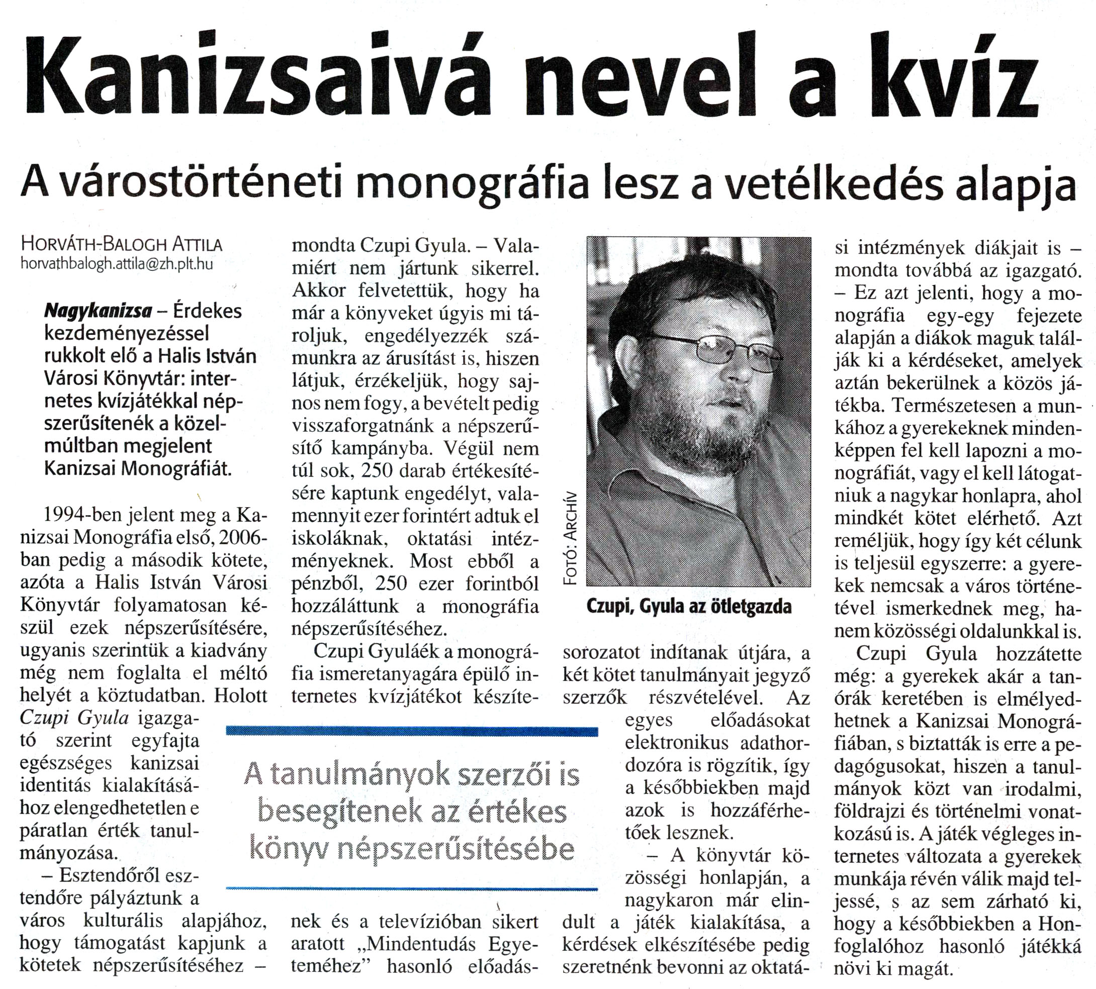 Nyilvános 1235 | 1975 | Zalai Hírlap 2008.09.29. 228. szám 7. oldal - Kanizsaivá nevel a kvíz | A cikk szövege: Kanizsaivá nevel a kvíz A várostörténeti monográfia lesz a vetélkedés alapja A tanulmányok szerzői is besegítenek az értékes könyv népszerűsítésébe Horváth-Balogh Attila horvathbalogh.attila@zh.plt.hu Nagykanizsa - Érdekes kezdeményezéssel rukkolt elő a Halis István Városi Könyvtár: internetes kvízjátékkal népszerűsítenék a közelmúltban megjelent Kanizsai Monográfiát. 1994-ben jelent meg a Kanizsai Monográfia első, 2006-ban pedig a második kötete, azóta a Halis István Városi Könyvtár folyamatosan készül ezek népszerűsítésére, ugyanis szerintük a kiadvány még nem foglalta el méltó helyét a köztudatban. Holott Czupi Gyula igazgató szerint egyfajta egészséges kanizsai identitás kialakításához elengedhetetlen e páratlan érték tanulmányozása. - Esztendőről esztendőre pályáztunk a város kulturális alapjához, hogy támogatást kapjunk a kötetek népszerűsítéséhez - mondta Czupi Gyula. - Valamiért nem jártunk sikerrel. Akkor felvetettük, hogy ha már a könyveket úgyis mi tároljuk, engedélyezzék számunkra az árusítást is, hiszen látjuk, érzékeljük, hogy sajnos nem fogy, a bevételt pedig visszaforgatnánk a népszerűsítő kampányba. Végül nem túl sok, 250 darab értékesítésére kaptunk engedélyt, valamennyit ezer forintért adtuk el iskoláknak, oktatási intézményeknek. Most ebből a pénzből, 250 ezer forintból hozzáláttunk a monográfia népszerűsítéséhez. Czupi Gyuláék a monográfia ismeretanyagára épülő internetes kvízjátékot készíte- nek és a televízióban sikert aratott „Mindentudás Egyeteméhez" hasonló előadás- Czupi, Gyula az ötletgazda sorozatot indítanak útjára, a két kötet tanulmányait jegyző szerzők részvételével. Az egyes előadásokat elektronikus adathordozóra is rögzítik, így a későbbiekben majd azok is hozzáférhetőek lesznek. - A könyvtár közösségi honlapján, a nagykaron már elindult a játék kialakítása, a kérdések elkészítésébe pedig szeretnénk bevonni az oktatá- si intézmények diákjait is -mondta továbbá az igazgató. - Ez azt jelenti, hogy a monográfia egy-egy fejezete alapján a diákok maguk találják ki a kérdéseket, amelyek aztán bekerülnek a közös játékba. Természetesen a munkához a gyerekeknek mindenképpen fel kell lapozni a monográfiát, vagy el kell látogatniuk a nagykar honlapra, ahol mindkét kötet elérhető. Azt reméljük, hogy így két célunk is teljesül egyszerre: a gyerekek nemcsak a város történetével ismerkednek meg, hanem közösségi oldalunkkal is. Czupi Gyula hozzátette még: a gyerekek akár a tanórák keretében is elmélyedhetnek a Kanizsai Monográfiában, s biztatták is erre a pedagógusokat, hiszen a tanulmányok közt van irodalmi, földrajzi és történelmi vonatkozású is. A játék végleges internetes változata a gyerekek munkája révén válik majd teljessé, s az sem zárható ki, hogy a későbbiekben a Honfoglalóhoz hasonló játékká növi ki magát. |