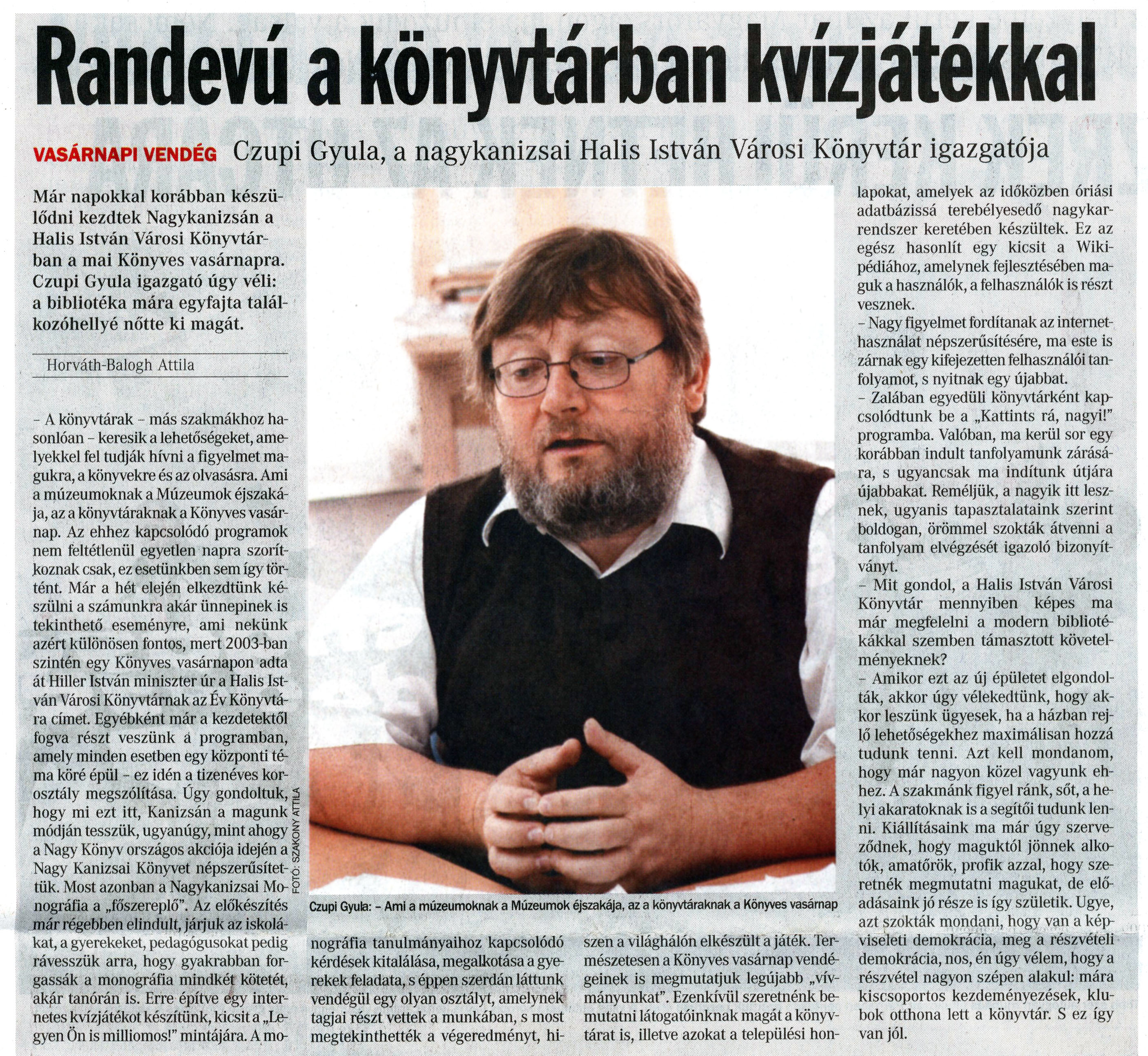 Nyilvános 1044 | 1686 | Vasárnapi Zalai Hírlap 2008. október 12. 041. szám 3. oldal - Randevú a könyvtárban kvízjátékkal | A cikk szövege: Randevú a könyvtárban kvízjátékkal vasárnapi vendég Czupi Gyula, a nagykanizsai Halis István Városi Könyvtár igazgatója Már napokkal korábban készülődni kezdtek Nagykanizsán a Halis István Városi Könyvtárban a mai Könyves vasárnapra. Czupi Gyula igazgató úgy véli: a bibliotéka mára egyfajta találkozóhellyé nőtte ki magát. Horváth-Balogh Attila - A könyvtárak - más szakmákhoz hasonlóan - keresik a lehetőségeket, amelyekkel fel tudják hívni a figyelmet magukra, a könyvekre és az olvasásra. Ami a múzeumoknak a Múzeumok éjszakája, az a könyvtáraknak a Könyves vasárnap. Az ehhez kapcsolódó programok nem feltétlenül egyetlen napra szorítkoznak csak, ez esetünkben sem így történt. Már a hét elején elkezdtünk készülni a számunkra akár ünnepinek is tekinthető eseményre, ami nekünk azért különösen fontos, mert 2003-ban szintén egy Könyves vasárnapon adta át Hiller István miniszter úr a Halis István Városi Könyvtárnak az Év Könyvtára címet. Egyébként már a kezdetektől fogva részt veszünk a programban, amely minden esetben egy központi téma köré épül - ez idén a tizenéves korosztály megszólítása. Úgy gondoltuk, hogy mi ezt itt, Kanizsán a magunk módján tesszük, ugyanúgy, mint ahogy a Nagy Könyv országos akciója idején a Nagy Kanizsai Könyvet népszerűsítettük. Most azonban a Nagykanizsai Monográfia a „főszereplő". Az előkészítés már régebben elindult, járjuk az iskolákat, a gyerekeket, pedagógusokat pedig rávesszük arra, hogy gyakrabban forgassák a monográfia mindkét kötetét, akár tanórán is. Erre építve égy internetes kvízjátékot készítünk, kicsit a „Legyen Ön is milliomos!" mintájára. A mo- Czupi Gyula: - Ami a múzeumoknak a Múzeumok éjszakája, az a könyvtáraknak a Könyves vasárnap nográfia tanulmányaihoz kapcsolódó kérdések kitalálása, megalkotása a gyerekek feladata, s éppen szerdán láttunk vendégül egy olyan osztályt, amelynek tagjai részt vettek a munkában, s most megtekinthették a végeredményt, hi- szen a világhálón elkészült a játék. Természetesen a Könyves vasárnap vendégeinek is megmutatjuk legújabb „vívmányunkat". Ezenkívül szeretnénk bemutatni látogatóinknak magát a könyvtárat is, illetve azokat a települési hon- lapokat, amelyek az időközben óriási adatbázissá terebélyesedő nagykarrendszer keretében készültek. Ez az egész hasonlít egy kicsit a Wikipédiához, amelynek fejlesztésében maguk a használók, a felhasználók is részt vesznek. - Nagy figyelmet fordítanak az internethasználat népszerűsítésére, ma este is zárnak egy kifejezetten felhasználói tanfolyamot, s nyitnak egy újabbat. - Zalában egyedüli könyvtárként kapcsolódtunk be a „Kattints rá, nagyi!" programba. Valóban, ma kerül sor egy korábban indult tanfolyamunk zárására, s ugyancsak ma indítunk útjára újabbakat Reméljük, a nagyik itt lesznek, ugyanis tapasztalataink szerint boldogan, örömmel szokták átvenni a tanfolyam elvégzését igazoló bizonyítványt. - Mit gondol, a Halis István Városi Könyvtár mennyiben képes ma már megfelelni a modern bibliotékákkal szemben támasztott követelményeknek? - Amikor ezt az új épületet elgondolták, akkor úgy vélekedtünk, hogy akkor leszünk ügyesek, ha a házban rejlő lehetőségekhez maximálisan hozzá tudunk tenni. Azt kell mondanom, hogy már nagyon közel vagyunk ehhez. A szakmánk figyel ránk, sőt, a helyi akaratoknak is a segítői tudunk lenni. Kiállításaink ma már úgy szerveződnek, hogy maguktól jönnek alkotók, amatőrök, profik azzal, hogy szeretnék megmutatni magukat, de előadásaink jó része is így születik. Ugye, azt szokták mondani, hogy van a képviseleti demokrácia, meg a részvételi demokrácia, nos, én úgy vélem, hogy a részvétel nagyon szépen alakul: mára kiscsoportos kezdeményezések, klubok otthona lett a könyvtár. S ez így van jól. |