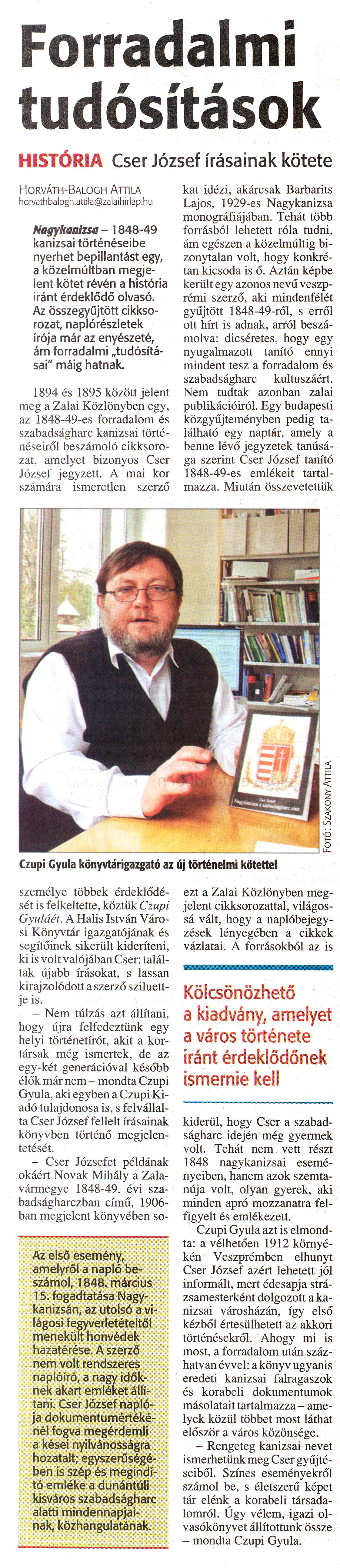 Nyilvános 1052 | 1234 | Zalai Hírlap 2009. április 29. 100. szám 7. oldal | Forradalmi tudósítások A cikk szövege: Forradalmi tudósítások HISTÓRIA Cser József írásainak kötete Czupi Gyula könyvtárigazgató az új történelmi kötettel Horváth-Balogh Attila horvathbalogh.attila@zalaihirlap.hu Nagykanizsa - 1848-49 kanizsai történéseibe nyerhet bepillantást egy, a közelmúltban megjelent kötet révén a história iránt érdeklődő olvasó. Az összegyűjtött cikksorozat, naplórészletek írója már az enyészeté, ám forradalmi „tudósításai" máig hatnak. 1894 és 1895 között jelent meg a Zalai Közlönyben egy, az 1848-49-es forradalom és szabadságharc kanizsai történéseiről beszámoló cikksorozat, amelyet bizonyos Cser József jegyzett. A mai kor számára ismeretlen szerző személye többek érdeklődését is felkeltette, köztük Czupi Gyuláét. A Halis István Városi Könyvtár igazgatójának és segítőinek sikerült kideríteni, ki is volt valójában Cser: találtak újabb írásokat, s lassan kirajzolódott a szerző sziluettje is. - Nem túlzás azt állítani, hogy újra felfedeztünk egy helyi történetírót, akit a kortársak még ismertek, de az egy-két generációval később élők már nem - mondta Czupi Gyula, aki egyben a Czupi Kiadó tulajdonosa is, s felvállalta Cser József fellelt írásainak könyvben történő megjelentetését. - Cser Józsefet példának okáért Novak Mihály a Zalavármegye 1848-49. évi sza-badságharczban című, 1906-ban megjelent könyvében sokat idézi, akárcsak Barbarits Lajos, 1929-es Nagykanizsa monográfiájában. Tehát több forrásból lehetett róla tudni, ám egészen a közelmúltig bizonytalan volt, hogy konkrétan kicsoda is ő. Aztán képbe került egy azonos nevű veszprémi szerző, aki mindenfélét gyűjtött 1848-49-ről, s erről ott hírt is adnak, arról beszámolva: dicséretes, hogy egy nyugalmazott tanító ennyi mindent tesz a forradalom és szabadságharc kultuszáért. Nem tudtak azonban zalai publikációiról. Egy budapesti közgyűjteményben pedig található egy naptár, amely a benne lévő jegyzetek tanúsága szerint Cser József tanító 1848-49-es emlékeit tartalmazza. Miután összevetettük ezt a Zalai Közlönyben megjelent cikksorozattal, világossá vált, hogy a naplóbejegyzések lényegében a cikkek vázlatai. A forrásokból az is kiderül, hogy Cser a szabadságharc idején még gyermek volt. Tehát nem vett részt 1848 nagykanizsai eseményeiben, hanem azok szemtanúja volt, olyan gyerek, aki minden apró mozzanatra felfigyelt és emlékezett. Czupi Gyula azt is elmondta: a vélhetően 1912 környékén Veszprémben elhunyt Cser József azért lehetett jól informált, mert édesapja strázsamesterként dolgozott a kanizsai városházán, így első kézből értesülhetett az akkori történésekről. Ahogy mi is most, a forradalom után százhatvan évvel: a könyv ugyanis eredeti kanizsai falragaszok és korabeli dokumentumok másolatait tartalmazza - amelyek közül többet most láthat először a város közönsége. - Rengeteg kanizsai nevet ismerhetünk meg Cser gyűjtéseiből. Színes eseményekről számol be, s életszerű képet tár elénk a korabeli társadalomról. Úgy vélem, igazi olvasókönyvet állítottunk össze - mondta Czupi Gyula. Kölcsönözhető a kiadvány, amelyet a város története iránt érdeklődőnek ismernie kell Az első esemény, amelyről a napló beszámol, 1848. március 15. fogadtatása Nagykanizsán, az utolsó a világosi fegyverletételtől menekült honvédek hazatérése. A szerző nem volt rendszeres naplóíró, a nagy időknek akart emléket állítani. Cser József naplója dokumentumértékénél fogva megérdemli a kései nyilvánosságra hozatalt; egyszerűségében is szép és megindító emléke a dunántúli kisváros szabadságharc alatti mindennapjainak, közhangulatának. |