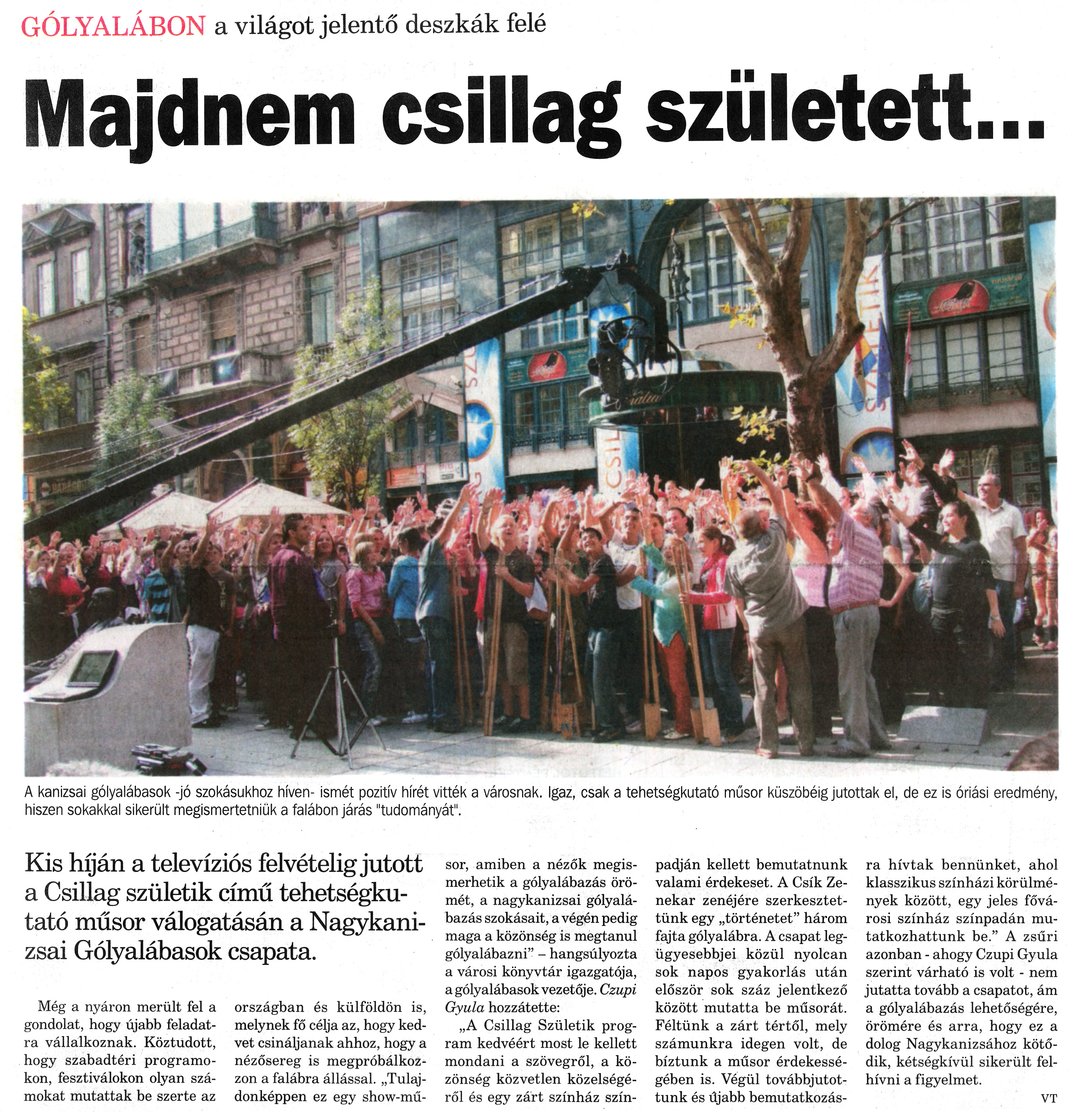 Nyilvános 1547 | 2446 | Nagykanizsai Maraton 2009.10.09. 040. szám 1. oldal - Majdnem csillag született | A cikk szövege: GÓLYALÁBON a világot jelentő deszkák felé Majdnem csillag született... Kis híján a televíziós felvételig jutott a Csillag születik című tehetségkutató műsor válogatásán a Nagykanizsai Gólyalábasok csapata. A kanizsai gólyalábasok - jó szokásukhoz híven - ismét pozitív hírét vitték a városnak. Igaz, csak a tehetségkutató műsor küszöbéig jutottak el, de ez is óriási eredmény, hiszen sokakkal sikerült megismertetniük a falábon járás "tudományát". Még a nyáron merült fel a gondolat, hogy újabb feladatra vállalkoznak. Köztudott, hogy szabadtéri programokon, fesztiválokon olyan számokat mutattak be szerte az országban és külföldön is, melynek fő célja az, hogy kedvet csináljanak ahhoz, hogy a nézősereg is megpróbálkozzon a falábra állással. „Tulajdonképpen ez egy show-műsor, amiben a nézők megismerhetik a gólyalábazás örömét, a nagykanizsai gólyalábazás szokásait, a végén pedig maga a közönség is megtanul gólyalábazni" - hangsúlyozta a városi könyvtár igazgatója, a gólyalábasok vezetője. Czupi Gyula hozzátette: „A Csillag Születik program kedvéért most le kellett mondani a szövegről, a közönség közvetlen közelségéről és egy zárt színház színpadján kellett bemutatnunk valami érdekeset. A Csík Zenekar zenéjére szerkesztettünk egy „történetet" három fajta gólyalábra. A csapat legügyesebbjei közül nyolcan sok napos gyakorlás után először sok száz jelentkező között mutatta be műsorát. Féltünk a zárt tértől, mely számunkra idegen volt, de bíztunk a műsor érdekességében is. Végül továbbjutottunk és újabb bemutatkozásra hívtak bennünket, ahol klasszikus színházi körülmények között, egy jeles fővárosi színház színpadán mutatkozhattunk be." A zsűri azonban - ahogy Czupi Gyula szerint várható is volt - nem jutatta tovább a csapatot, ám a gólyalábazás lehetőségére, örömére és arra, hogy ez a dolog Nagykanizsához kötődik, kétségkívül sikerült felhívni a figyelmet. VT |