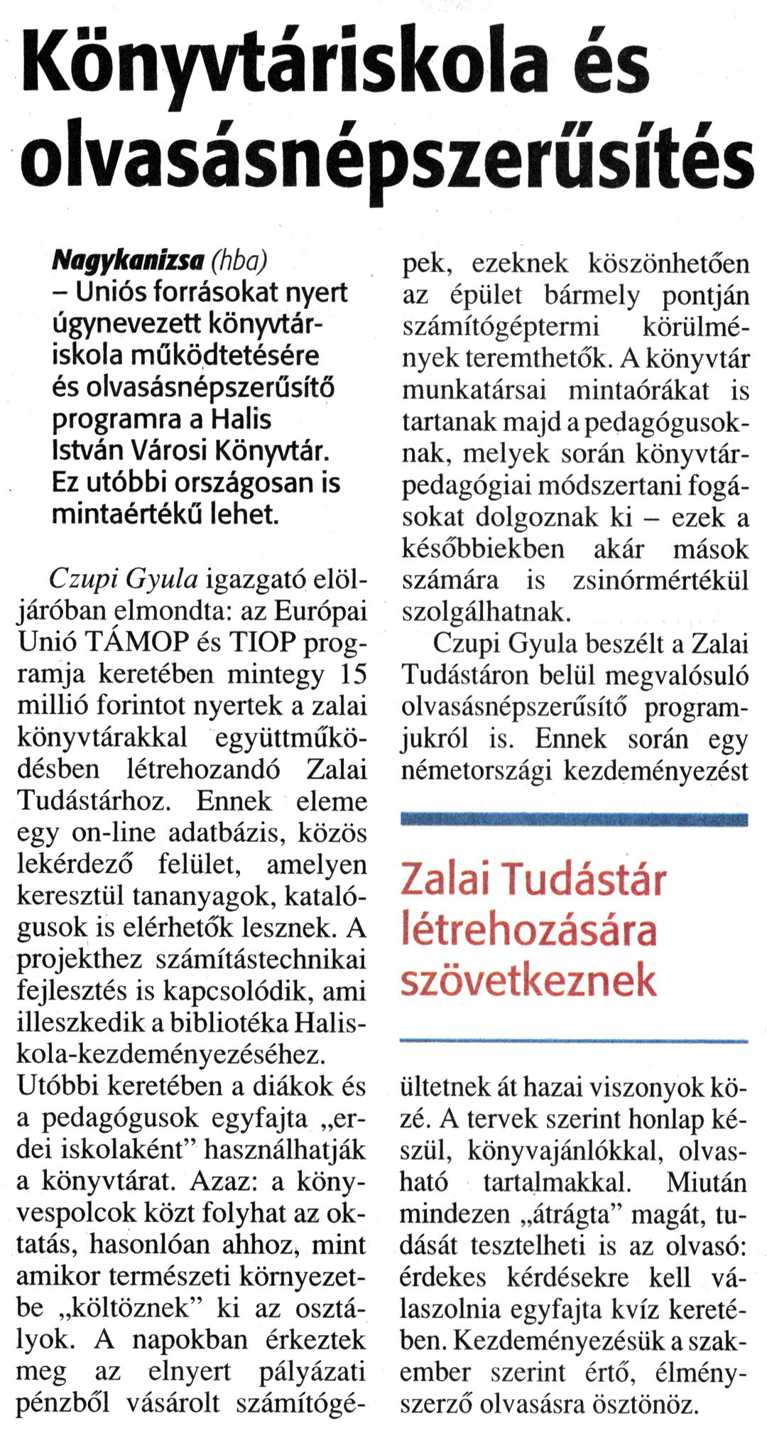 Nyilvános 1037 | 1461 | Zalai Hírlap 2010. április 1. 76. szám 4. oldal - Könyvtáriskola és olvasásnépszerűsítés | A cikk szövege: Könyvtáriskola és olvasásnépszerűsítés Zalai Tudástár létrehozására szövetkeznek Nagykanizsa (hba) - Uniós forrásokat nyert úgynevezett könyvtáriskola működtetésére és olvasásnépszerűsítő programra a Halis István Városi Könyvtár. Ez utóbbi országosan is mintaértékű lehet. Czupi Gyula igazgató elöljáróban elmondta: az Európai Unió TÁMOP és TIOP programja keretében mintegy 15 millió forintot nyertek a zalai könyvtárakkal együttműködésben létrehozandó Zalai Tudástárhoz. Ennek eleme egy on-line adatbázis, közös lekérdező felület, amelyen keresztül tananyagok, katalógusok is elérhetők lesznek. A projekthez számítástechnikai fejlesztés is kapcsolódik, ami illeszkedik a bibliotéka Haliskola-kezdeményezéséhez. Utóbbi keretében a diákok és a pedagógusok egyfajta „erdei iskolaként" használhatják a könyvtárat. Azaz: a könyvespolcok közt folyhat az oktatás, hasonlóan ahhoz, mint amikor természeti környezetbe „költöznek" ki az osztályok. A napokban érkeztek meg az elnyert pályázati pénzből vásárolt számítógépek, ezeknek köszönhetően az épület bármely pontján számítógéptermi körülmények teremthetők. A könyvtár munkatársai mintaórákat is tartanak majd a pedagógusoknak, melyek során könyvtárpedagógiai módszertani fogásokat dolgoznak ki - ezek a későbbiekben akár mások számára is zsinórmértékül szolgálhatnak. Czupi Gyula beszélt a Zalai Tudástáron belül megvalósuló olvasásnépszerűsítő programjukról is. Ennek során egy németországi kezdeményezést ültetnek át hazai viszonyok közé. A tervek szerint honlap készül, könyvajánlókkal, olvasható tartalmakkal. Miután mindezen „átrágta" magát, tudását tesztelheti is az olvasó: érdekes kérdésekre kell válaszolnia egyfajta kvíz keretében. Kezdeményezésük a szakember szerint értő, élményszerző olvasásra ösztönöz. |