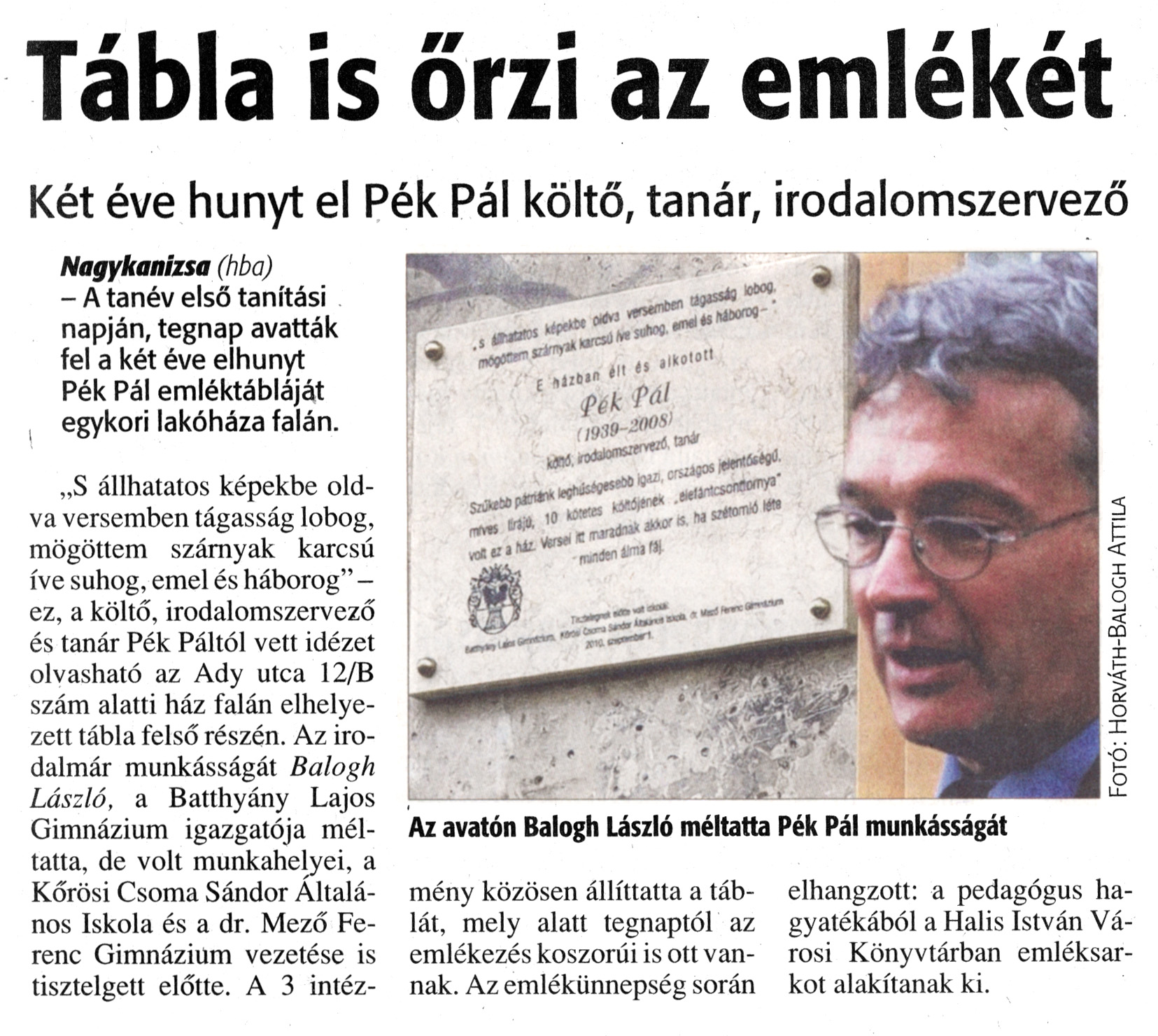 Nyilvános 1016 | 1193 | Zalai Hírlap 2010. szeptember 2. 204. szám 4. oldal - Tábla is őrzi emlékét | A cikk szövege: Tábla is őrzi az emlékét Két éve hunyt el Pék Pál költő, tanár, irodalomszervező Nagykanizsa (hba) - A tanév első tanítási napján, tegnap avatták fel a két éve elhunyt Pék Pál emléktábláját egykori lakóháza falán. „S állhatatos képekbe oldva versemben tágasság lobog, mögöttem szárnyak karcsú íve suhog, emel és háborog" -ez, a költő, irodalomszervező és tanár Pék Páltól vett idézet olvasható az Ady utca 12/B szám alatti ház falán elhelyezett tábla felső részén. Az irodalmár munkásságát Balogh László, a Batthyány Lajos Gimnázium igazgatója méltatta, de volt munkahelyei, a Kőrösi Csoma Sándor Általános Iskola és a dr. Mező Ferenc Gimnázium vezetése is tisztelgett előtte. A 3 intézmény közösen állíttatta a táblát, mely alatt tegnaptól az emlékezés koszorúi is ott vannak. Az emlékünnepség során elhangzott: a pedagógus hagyatékából a Halis István Városi Könyvtárban emléksarkot alakítanak ki. Az avatón Balogh László méltatta Pék Pál munkásságát Fotó: Horváth-Balogh Attila |