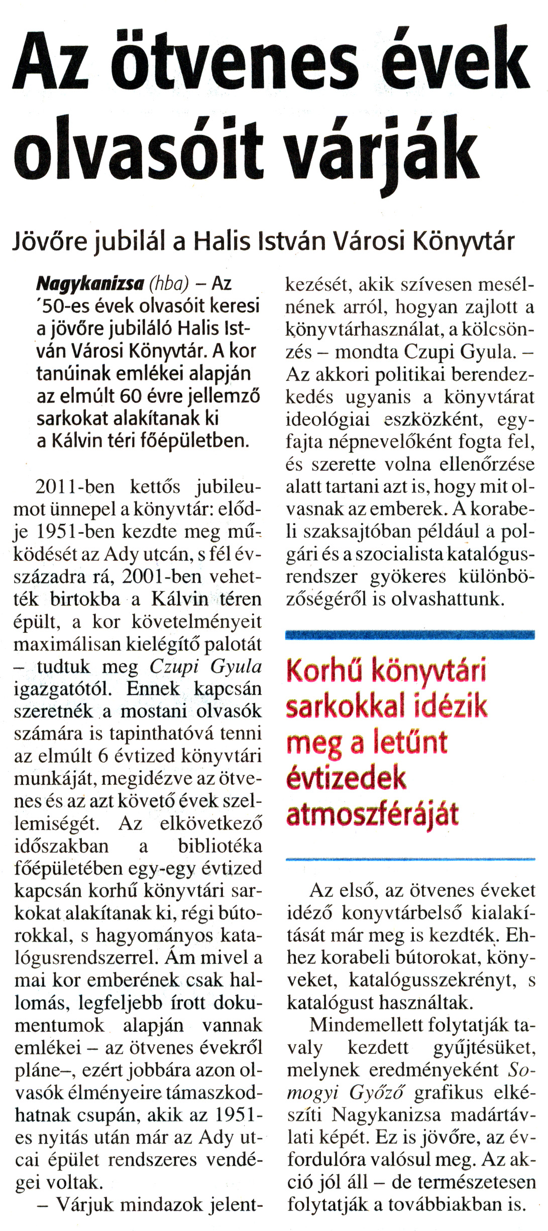 Nyilvános 1069 | 1442 | Zalai Hírlap 2010. szeptember 21. 220. szám 7. oldal - Az ötvenes évek olvasóit várják | A cikk szövege: Az ötvenes évek olvasóit várják Jövőre jubilál a Halis István Városi Könyvtár Nagykanizsa (hba) - Az \'50-es évek olvasóit keresi a jövőre jubiláló Halis István Városi Könyvtár. A kor tanúinak emlékei alapján az elmúlt 60 évre jellemző sarkokat alakítanak ki a Kálvin téri főépületben. 2011-ben kettős jubileumot ünnepel a könyvtár: elődje 1951-ben kezdte meg működését az Ady utcán, s fél évszázadra rá, 2001-ben vehették birtokba a Kálvin téren épült, a kor követelményeit maximálisan kielégítő palotát - tudtuk meg Czupi Gyula igazgatótól. Ennek kapcsán szeretnék a mostani olvasók számára is tapinthatóvá tenni az elmúlt 6 évtized könyvtári munkáját, megidézve az ötvenes és az azt követő évek szellemiségét. Az elkövetkező időszakban a bibliotéka főépületében egy-egy évtized kapcsán korhű könyvtári sarkokat alakítanak ki, régi bútorokkal, s hagyományos katalógusrendszerrel. Ám mivel a mai kor emberének csak hallomás, legfeljebb írott dokumentumok alapján vannak emlékei - az ötvenes évekről pláne -, ezért jobbára azon olvasók élményeire támaszkodhatnak csupán, akik az 1951-es nyitás után már az Ady utcai épület rendszeres vendégei voltak. - Várjuk mindazok jelentkezését, akik szívesen mesélnének arról, hogyan zajlott a könyvtárhasználat, a kölcsönzés - mondta Czupi Gyula. -Az akkori politikai berendezkedés ugyanis a könyvtárat ideológiai eszközként, egyfajta népnevelőként fogta fel, és szerette volna ellenőrzése alatt tartani azt is, hogy mit olvasnak az emberek. A korabeli szaksajtóban például a polgári és a szocialista katalógusrendszer gyökeres különbözőségéről is olvashattunk. Korhű könyvtári sarkokkal idézik meg a letűnt évtizedek atmoszféráját Az első, az ötvenes éveket idéző könyvtárbelső kialakítását már meg is kezdték. Ehhez korabeli bútorokat, könyveket, katalógusszekrényt, s katalógust használtak. Mindemellett folytatják tavaly kezdett gyűjtésüket, melynek eredményeként Somogyi Győző grafikus elkészíti Nagykanizsa madártávlati képét. Ez is jövőre, az évfordulóra valósul meg. Az akció jól áll - de természetesen folytatják a továbbiakban is. |