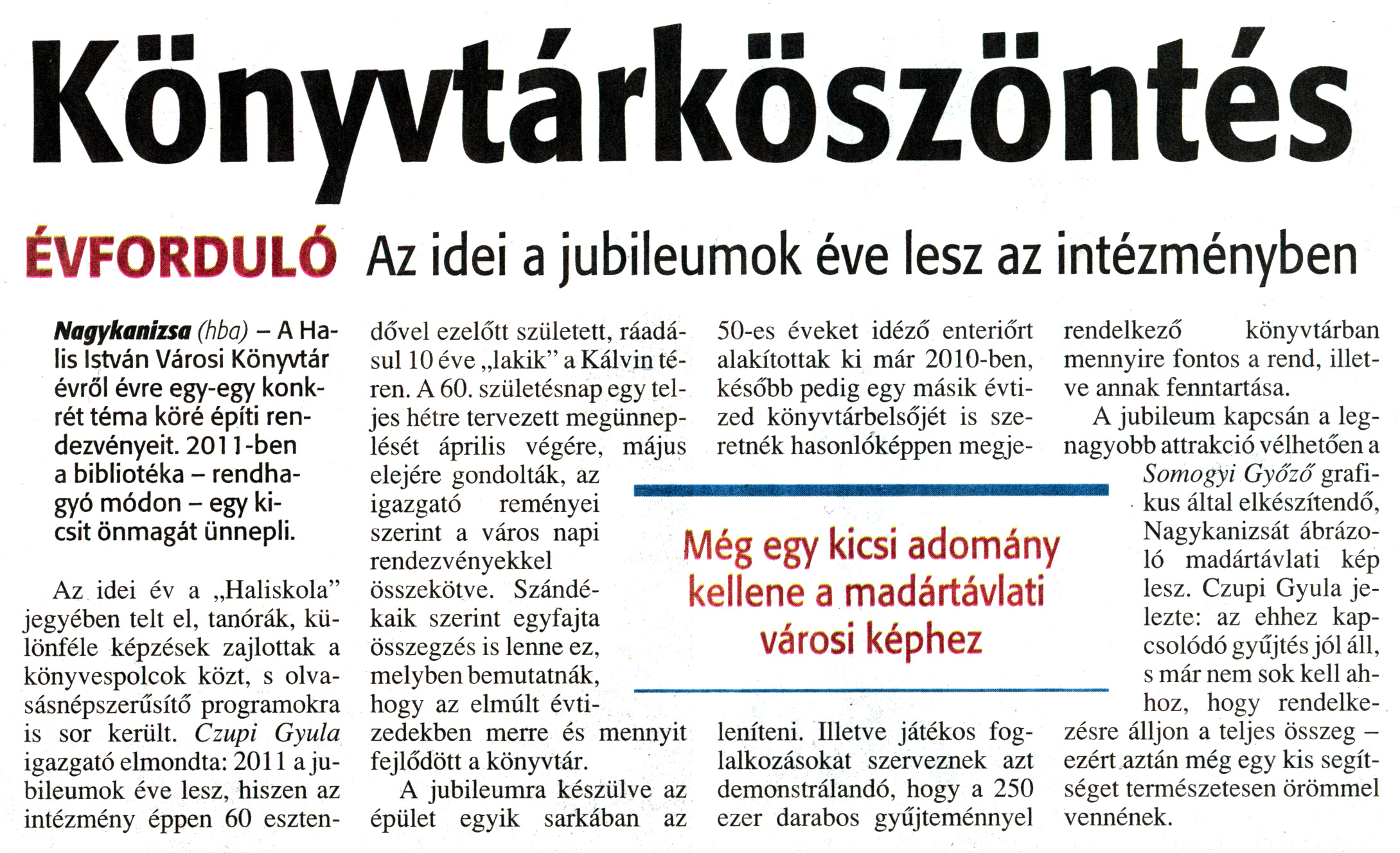 Nyilvános 1777 | 5513 | Zalai Hírlap 2011. január 3. 1. szám 7. oldal - Könyvtárköszöntés | A cikk szövege: Könyvtárköszöntés ÉVFORDULÓ Az idei a jubileumok éve lesz az intézményben Még egy kicsi adomány kellene a madártávlati városi képhez Nagykanizsa (hba) - A Halis István Városi Könyvtár évről évre egy-egy konkrét téma köré építi rendezvényeit. 2011-ben a bibliotéka - rendhagyó módon - egy kicsit önmagát ünnepli. Az idei év a „Haliskola" jegyében telt el, tanórák, különféle képzések zajlottak a könyvespolcok közt, s olvasásnépszerűsítő programokra is sor került. Czupi Gyula igazgató elmondta: 2011 a jubileumok éve lesz, hiszen az intézmény éppen 60 esztendővel ezelőtt született, ráadásul 10 éve „lakik" a Kálvin téren. A 60. születésnap egy teljes hétre tervezett megünneplését április végére, május elejére gondolták, az igazgató reményei szerint a város napi rendezvényekkel összekötve. Szándékaik szerint egyfajta összegzés is lenne ez, melyben bemutatnák, hogy az elmúlt évtizedekben merre és mennyit fejlődött a könyvtár. A jubileumra készülve az épület egyik sarkában az 50-es éveket idéző enteriőrt alakítottak ki már 2010-ben, később pedig egy másik évtized könyvtárbelsőjét is szeretnék hasonlóképpen megjeleníteni. Illetve játékos foglalkozásokat szerveznek azt demonstrálandó, hogy a 250 ezer darabos gyűjteménnyel rendelkező könyvtárban mennyire fontos a rend, illetve annak fenntartása. A jubileum kapcsán a legnagyobb attrakció vélhetően a Somogyi Győző grafikus által elkészítendő, Nagykanizsát ábrázoló madártávlati kép lesz. Czupi Gyula jelezte: az ehhez kapcsolódó gyűjtés jól áll, s már nem sok kell ahhoz, hogy rendelkezésre álljon a teljes összeg - ezért aztán még egy kis segítséget természetesen örömmel vennének. |