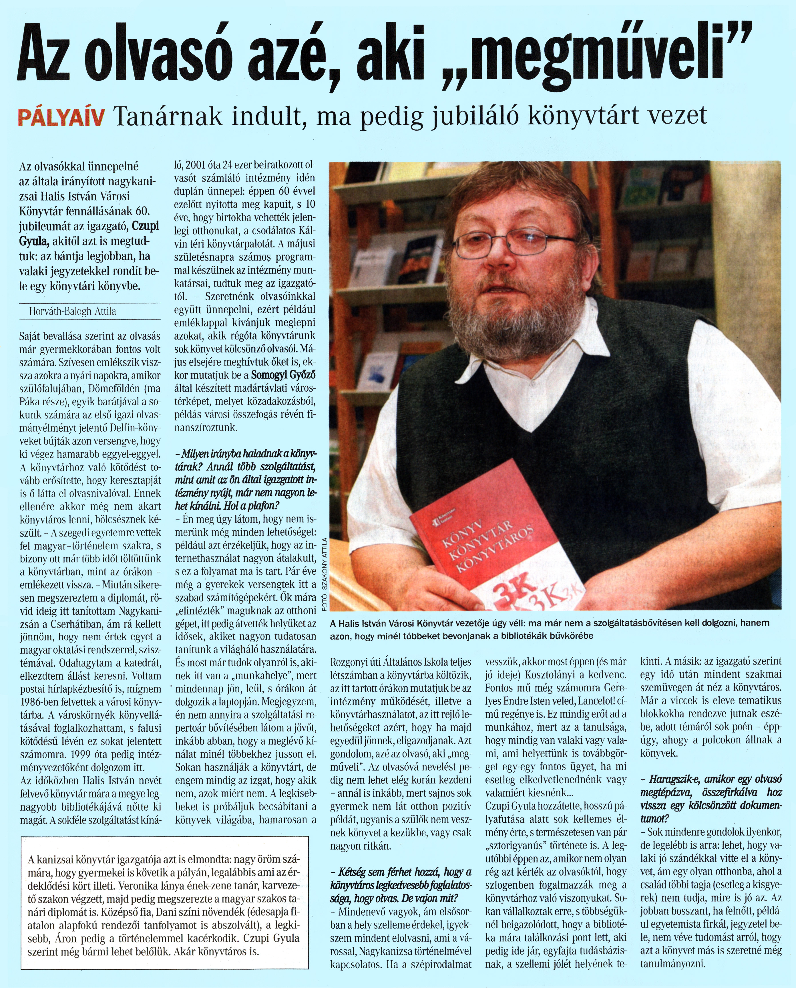 Nyilvános 1858 | 6014 | Vasárnapi Zalai Hírlap 2011. április 10. 15. szám 5. oldal - Az olvasó azé, aki megműveli | A cikk szövege: Az olvasó azé, aki „megműveli" PÁLYAÍV Tanárnak indult, ma pedig jubiláló könyvtárt vezet Az olvasókkal ünnepelné az általa irányított nagykanizsai Halis István Városi Könyvtár fennállásának 60. jubileumát az igazgató, Czupi Gyula, akitől azt is megtudtuk: az bántja legjobban, ha valaki jegyzetekkel rondít bele egy könyvtári könyvbe. Horváth-Balogh Attila Saját bevallása szerint az olvasás már gyermekkorában fontos volt számára. Szívesen emlékszik vissza azokra a nyári napokra, amikor szülőfalujában, Dömeföldén (ma Páka része), egyik barátjával a sokunk számára az első igazi olvasmányélményt jelentő Delfin-könyveket bújták azon versengve, hogy ki végez hamarabb eggyel-eggyel. A könyvtárhoz való kötődést tovább erősítette, hogy keresztapját is ő látta el olvasnivalóval. Ennek ellenére akkor még nem akart könyvtáros lenni, bölcsésznek készült. - A szegedi egyetemre vettek fel magyar-történelem szakra, s bizony ott már több időt töltöttünk a könyvtárban, mint az órákon -emlékezett vissza. - Miután sikeresen megszereztem a diplomát, rövid ideig itt tanítottam Nagykanizsán a Cserhátiban, ám rá kellett jönnöm, hogy nem értek egyet a magyar oktatási rendszerrel, szisztémával. Odahagytam a katedrát, elkezdtem állást keresni. Voltam postai hírlapkézbesítő is, mígnem 1986-ben felvettek a városi könyvtárba. A városkörnyék könyvellátásával foglalkozhattam, s falusi kötődésű lévén ez sokat jelentett számomra. 1999 óta pedig intézményvezetőként dolgozom itt. Az időközben Halis István nevét felvevő könyvtár mára a megye legnagyobb bibliotékájává nőtte ki magát. A sokféle szolgáltatást kínáló, 2001 óta 24 ezer beiratkozott olvasót számláló intézmény idén duplán ünnepel: éppen 60 évvel ezelőtt nyitotta meg kapuit, s 10 éve, hogy birtokba vehették jelenlegi otthonukat, a csodálatos Kálvin téri könyvtárpalotát. A májusi születésnapra számos programmal készülnek az intézmény munkatársai, tudtuk meg az igazgatótól. - Szeretnénk olvasóinkkal együtt ünnepelni, ezért például emléklappal kívánjuk meglepni azokat, akik régóta könyvtárunk sok könyvet kölcsönző olvasói. Május elsejére meghívtuk őket is, ekkor mutatjuk be a Somogyi Győző által készített madártávlati várostérképet, melyet közadakozásból, példás városi összefogás révén finanszíroztunk. - Milyen irányba haladnak a könyvtárak? Annál több szolgáltatást, mint amit az ön által igazgatott intézmény nyújt, már nem nagyon lehet kínálni Hol a plafon? - Én meg úgy látom, hogy nem ismerünk még minden lehetőséget: például azt érzékeljük, hogy az internethasználat nagyon átalakult, s ez a folyamat ma is tart. Pár éve még a gyerekek versengtek itt a szabad számítógépekért. Ők mára „elintézték" maguknak az otthoni gépet, itt pedig átvették helyüket az idősek, akiket nagyon tudatosan tanítunk a világháló használatára. És most már tudok olyanról is, akinek itt van a „munkahelye", mert mindennap jön, leül, s órákon át dolgozik a laptopján. Megjegyzem, én nem annyira a szolgáltatási repertoár bővítésében látom a jövőt, inkább abban, hogy a meglévő kínálat minél többekhez jusson el. Sokan használják a könyvtárt, de engem mindig az izgat, hogy akik nem, azok miért nem. A legkisebbeket is próbáljuk becsábítani a könyvek világába, hamarosan a Rozgonyi úti Általános Iskola teljes létszámban a könyvtárba költözik, az itt tartott órákon mutatjuk be az intézmény működését, illetve a könyvtárhasználatot, az itt rejlő lehetőségeket azért, hogy ha majd egyedül jönnek, eligazodjanak. Azt gondolom, azé az olvasó, aki „megműveli". Az olvasóvá nevelést pedig nem lehet elég korán kezdeni - annál is inkább, mert sajnos sok gyermek nem lát otthon pozitív példát, ugyanis a szülők nem vesznek könyvet a kezükbe, vagy csak nagyon ritkán. - Kétség sem férhet hozzá, hogy a könyvtáros legkedvesebb foglalatossága, hogy olvas. De vajon mit? - Mindenevő vagyok, ám elsősorban a hely szelleme érdekel, igyekszem mindent elolvasni, ami a várossal, Nagykanizsa történelmével kapcsolatos. Ha a szépirodalmat vesszük, akkor most éppen (és már jó ideje) Kosztolányi a kedvenc. Fontos mű még számomra Gerelyes Endre Isten veled, Lancelot! című regénye is. Ez mindig erőt ad a munkához, mert az a tanulsága, hogy mindig van valaki vagy valami, ami helyettünk is továbbgörget egy-egy fontos ügyet, ha mi esetleg elkedvetlenednénk vagy valamiért kiesnénk... Czupi Gyula hozzátette, hosszú pályafutása alatt sok kellemes élmény érte, s természetesen van pár „sztorigyanús" története is. A legutóbbi éppen az, amikor nem olyan rég azt kérték az olvasóktól, hogy szlogenben fogalmazzák meg a könyvtárhoz való viszonyukat. Sokan vállalkoztak erre, s többségüknél beigazolódott, hogy a bibliotéka mára találkozási pont lett, aki pedig ide jár, egyfajta tudásbázisnak, a szellemi jólét helyének te- kinti. A másik: az igazgató szerint egy idő után mindent szakmai szemüvegen át néz a könyvtáros. Már a viccek is eleve tematikus blokkokba rendezve jutnak eszébe, adott témáról sok poén - éppúgy, ahogy a polcokon állnak a könyvek. - Haragszik-e, amikor egy olvasó megtépázva, összefirkálva hoz vissza egy kölcsönzött dokumentumot? - Sok mindenre gondolok ilyenkor, de legelébb is arra: lehet, hogy valaki jó szándékkal vitte el a könyvet, ám egy olyan otthonba, ahol a család többi tagja (esetleg a kisgyerek) nem tudja, mire is jó az. Az jobban bosszant, ha felnőtt, például egyetemista firkál, jegyzetel bele, nem 