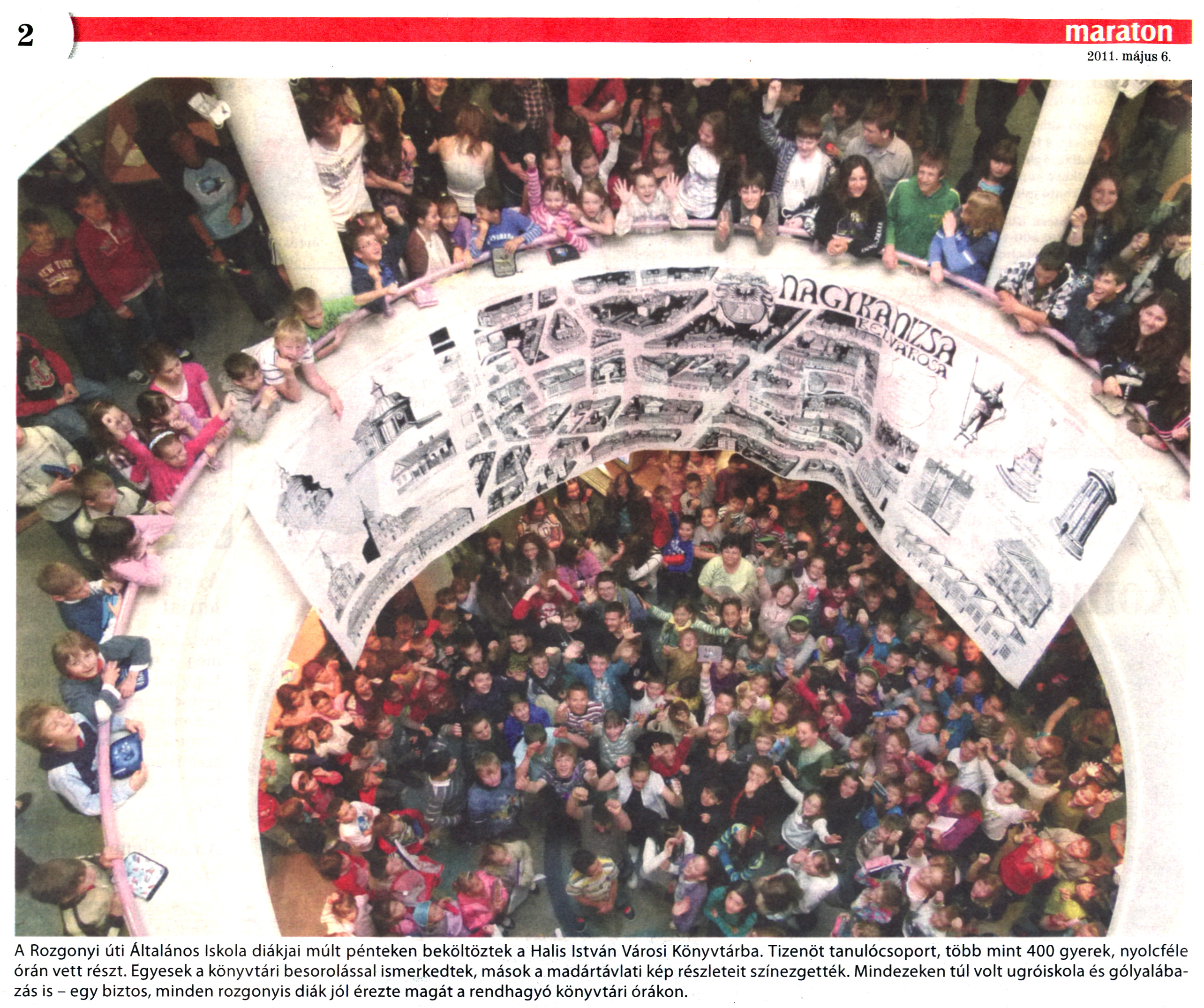 Nyilvános 2046 | 7558 | Nagykanizsai Maraton 2011. május 6. 18. szám 2. oldal - Rozgonyi úti Általános Iskola | A cikk szövege: A Rozgonyi úti Általános Iskola diákjai múlt pénteken beköltöztek a Halis István Városi Könyvtárba. Tizenöt tanulócsoport, több mint 400 gyerek, nyolcféle órán vett részt. Egyesek a könyvtári besorolással ismerkedtek, mások a madártávlati kép részleteit színezgették. Mindezeken túl volt ugróiskola és gólyalábazás is - egy biztos, minden rozgonyis diák jól érezte magát a rendhagyó könyvtári órákon. |