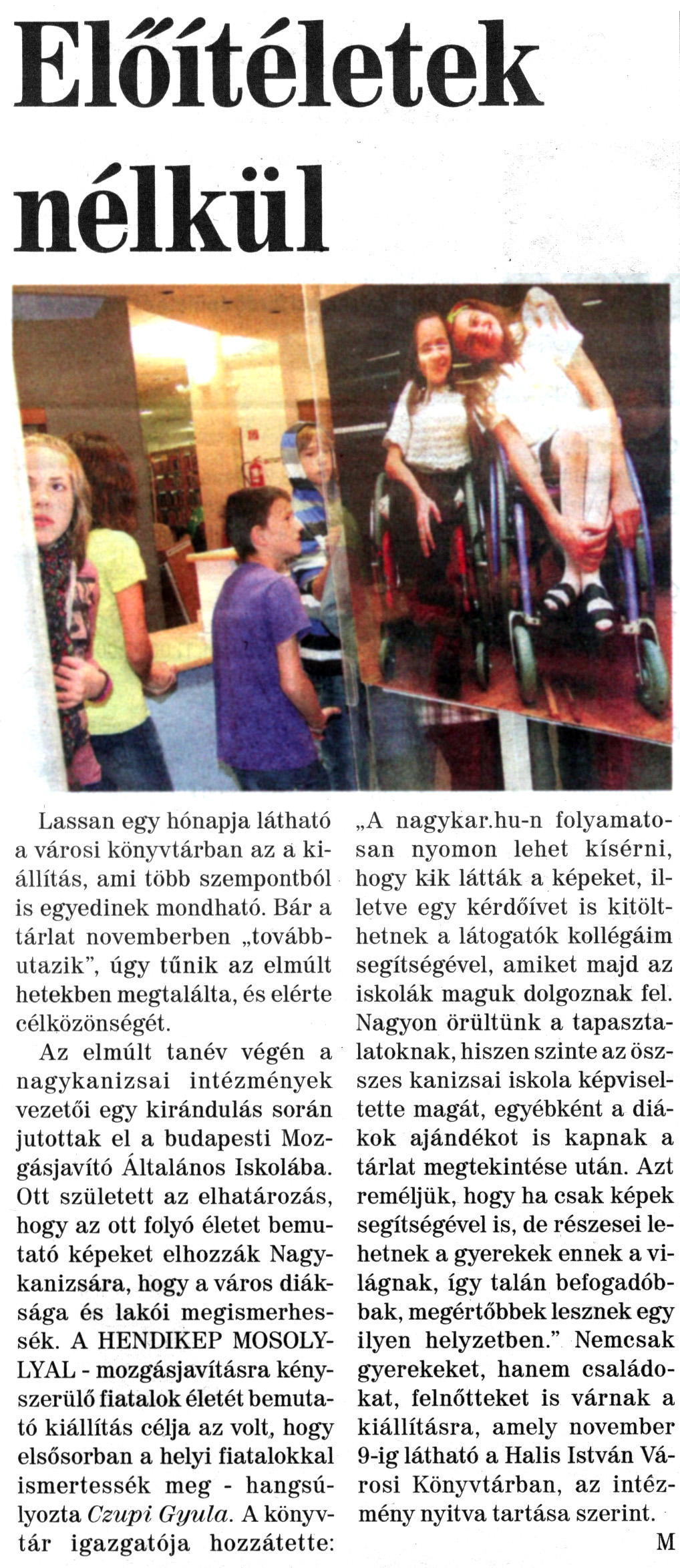 Nyilvános 2201 | 7202 | Nagykanizsai Maraton 2011. október 28. 43. szám 4. oldal - Előítéletek nélkül | A cikk szövege: Előítéletek nélkül Lassan egy hónapja látható a városi könyvtárban az a kiállítás, ami több szempontból is egyedinek mondható. Bár a tárlat novemberben „továbbutazik", úgy tűnik az elmúlt hetekben megtalálta, és elérte célközönségét. Az elmúlt tanév végén a nagykanizsai intézmények vezetői egy kirándulás során jutottak el a budapesti Mozgásjavító Általános Iskolába. Ott született az elhatározás, hogy az ott folyó életet bemutató képeket elhozzák Nagykanizsára, hogy a város diáksága és lakói megismerhessék. A HENDIKEP MOSOLLYAL - mozgásjavításra kényszerülő fiatalok életét bemutató kiállítás célja az volt, hogy elsősorban a helyi fiatalokkal ismertessék meg - hangsúlyozta Czupi Gyula. A könyvtár igazgatója hozzátette: „A nagykar.hu-n folyamatosan nyomon lehet kísérni, hogy kik látták a képeket, illetve egy kérdőívet is kitölthetnek a látogatók kollégáim segítségével, amiket majd az iskolák maguk dolgoznak fel. Nagyon örültünk a tapasztalatoknak, hiszen szinte az összes kanizsai iskola képviseltette magát, egyébként a diákok ajándékot is kapnak a tárlat megtekintése után. Azt reméljük, hogy ha csak képek segítségével is, de részesei lehetnek a gyerekek ennek a világnak, így talán befogadóbbak, megértőbbek lesznek egy ilyen helyzetben." Nemcsak gyerekeket, hanem családokat, felnőtteket is várnak a kiállításra, amely november 9-ig látható a Halis István Városi Könyvtárban, az intézmény nyitva tartása szerint. M |