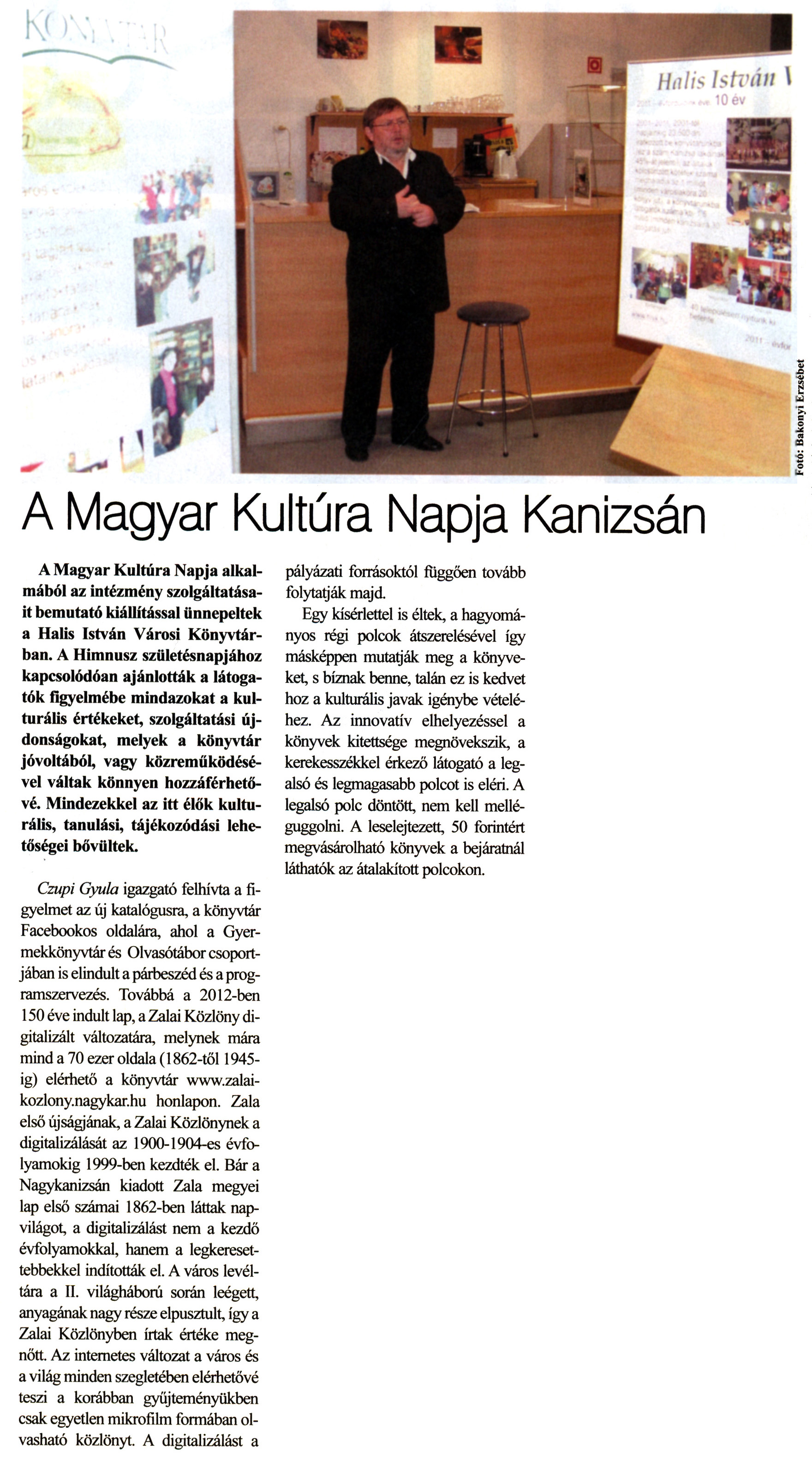 Nyilvános 2345 | 7518 | Kanizsa 2012. január 26. 3. szám 2. oldal - A Magyar Kultúra Napja Kanizsán | A Magyar Kultúra Napja Kanizsán A Magyar Kultúra Napja alkalmából az intézmény szolgáltatásait bemutató kiállítással ünnepeltek a Halis István Városi Könyvtárban. A Himnusz születésnapjához kapcsolódóan ajánlották a látogatók figyelmébe mindazokat a kulturális értékeket, szolgáltatási újdonságokat, melyek a könyvtár jóvoltából, vagy közreműködésével váltak könnyen hozzáférhetővé. Mindezekkel az itt élők kulturális, tanulási, tájékozódási lehetőségei bővültek. Czupi Gyula igazgató felhívta a figyelmet az új katalógusra, a könyvtár Facebookos oldalára, ahol a Gyermekkönyvtár és Olvasótábor csoportjában is elindult a párbeszéd és a programszervezés. Továbbá a 2012-ben 150 éve indult lap, a Zalai Közlöny digitalizált változatára, melynek mára mind a 70 ezer oldala (1862-től 1945-ig) elérhető a könyvtár www.zalai-kozlony.nagykar.hu honlapon. Zala első újságjának, a Zalai Közlönynek a digitalizálását az 1900-1904-es évfolyamokig 1999-ben kezdték el. Bár a Nagykanizsán kiadott Zala megyei lap első számai 1862-ben láttak napvilágot, a digitalizálást nem a kezdő évfolyamokkal, hanem a legkeresettebbekkel indították el. A város levéltára a II. világháború során leégett, anyagának nagy része elpusztult, így a Zalai Közlönyben írtak értéke megnőtt. Az internetes változat a város és a világ minden szegletében elérhetővé teszi a korábban gyűjteményükben csak egyetlen mikrofilm formában olvasható közlönyt. A digitalizálást a pályázati forrásoktól függően tovább folytatják majd. Egy kísérlettel is éltek, a hagyományos régi polcok átszerelésével így másképpen mutatják meg a könyveket, s bíznak benne, talán ez is kedvet hoz a kulturális javak igénybe vételéhez. Az innovatív elhelyezéssel a könyvek kitettsége megnövekszik, a kerekesszékkel érkező látogató a legalsó és legmagasabb polcot is eléri. A legalsó polc döntött, nem kell melléguggolni. A leselejtezett, 50 forintért megvásárolható könyvek a bejáratnál láthatók az átalakított polcokon. |