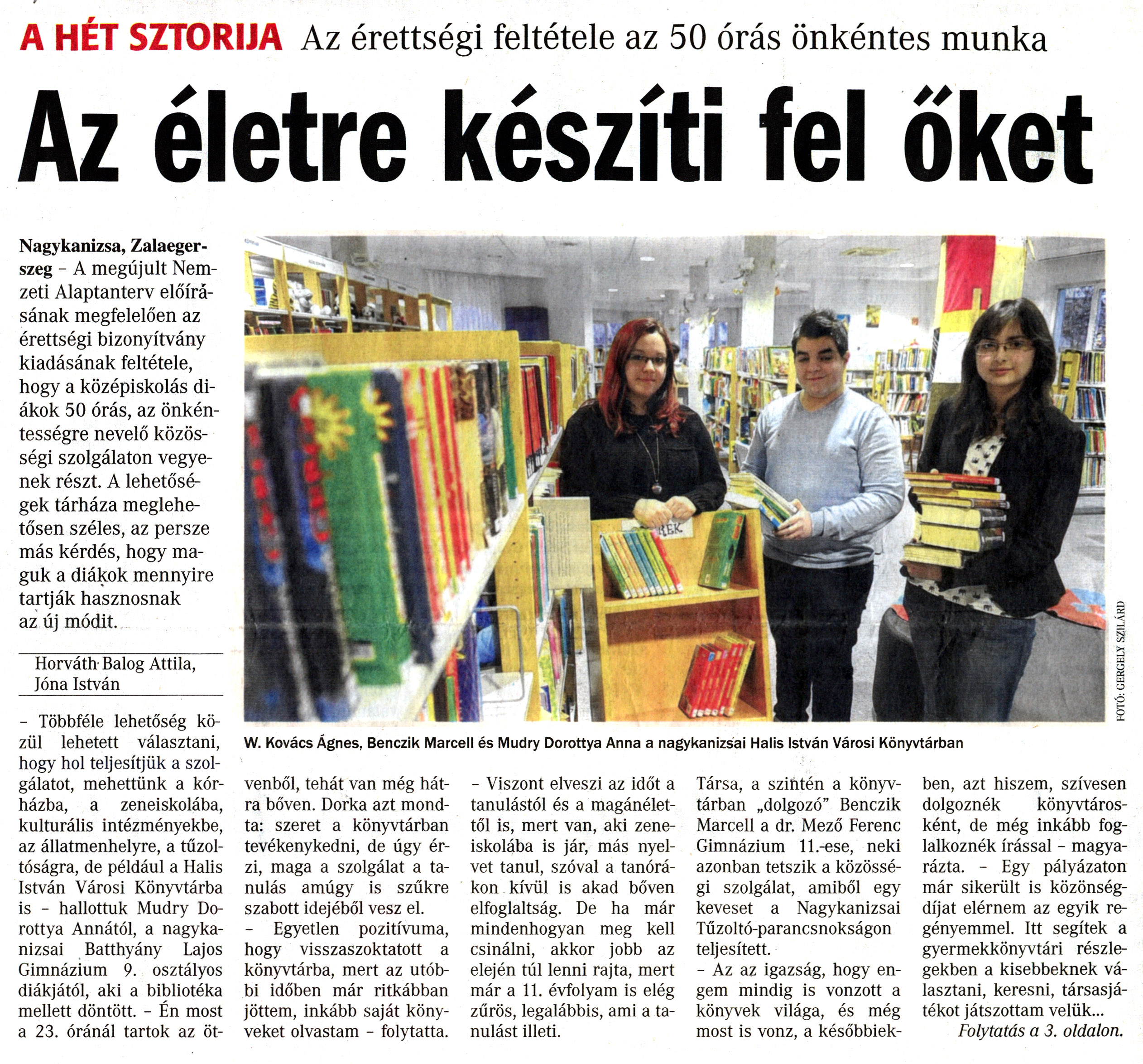 Nyilvános 1681 | 3597 | Vasárnapi Zalai Hírlap 2015. február 1. 5. szám 1. oldal - Az életre készíti fel őket | A cikk folytatása: http://www.nagykar.hu/keptar/7307/60359.html A HÉT SZTORIJA Az érettségi feltétele az 50 órás önkéntes munka Az életre készíti fel őket W. Kovács Ágnes, Benczik Marcell és Mudry Dorottya Anna a nagykanizsai Halis István Városi Könyvtárban Nagykanizsa, Zalaegerszeg - A megújult Nemzeti Alaptanterv előírásának megfelelően az érettségi bizonyítvány kiadásának feltétele, hogy a középiskolás diákok 50 órás, az önkéntességre nevelő közösségi szolgálaton vegyenek részt. A lehetőségek tárháza meglehetősen széles, az persze más kérdés, hogy maguk a diákok mennyire tartják hasznosnak az új módit. Horváth-Balog Attila, Jóna István_ - Többféle lehetőség közül lehetett választani, hogy hol teljesítjük a szolgálatot, mehettünk a kórházba, a zeneiskolába, kulturális intézményekbe, az állatmenhelyre, a tűzoltóságra, de például a Halis István Városi Könyvtárba is - hallottuk Mudry Dorottya Annától, a nagykanizsai Batthyány Lajos Gimnázium 9. osztályos diákjától, aki a bibliotéka mellett döntött. - Én most a 23. óránál tartok az öt- venből, tehát van még hátra bőven. Dorka azt mondta: szeret a könyvtárban tevékenykedni, de úgy érzi, maga a szolgálat a tanulás amúgy is szűkre szabott idejéből vesz el. - Egyetlen pozitívuma, hogy visszaszoktatott a könyvtárba, mert az utóbbi időben már ritkábban jöttem, inkább saját könyveket olvastam - folytatta. - Viszont elveszi az időt a tanulástól és a magánélettől is, mert van, aki zeneiskolába is jár, más nyelvet tanul, szóval a tanórákon kívül is akad bőven elfoglaltság. De ha már mindenhogyan meg kell csinálni, akkor jobb az elején túl lenni rajta, mert már a 11. évfolyam is elég zűrös, legalábbis, ami a tanulást illeti. Társa, a szintén a könyvtárban „dolgozó" Benczik Marcell a dr. Mező Ferenc Gimnázium ll.-ese, neki azonban tetszik a közösségi szolgálat, amiből egy keveset a Nagykanizsai Tűzoltó-parancsnokságon teljesített. - Az az igazság, hogy engem mindig is vonzott a könyvek világa, és még most is vonz, a későbbiek- ben, azt hiszem, szívesen dolgoznék könyvtárosként, de még inkább foglalkoznék írással - magyarázta. - Egy pályázaton már sikerült is közönségdíjat elérnem az egyik regényemmel. Itt segítek a gyermekkönyvtári részlegekben a kisebbeknek választani, keresni, társasjátékot játszottam velük... Folytatás a 3. oldalon. |