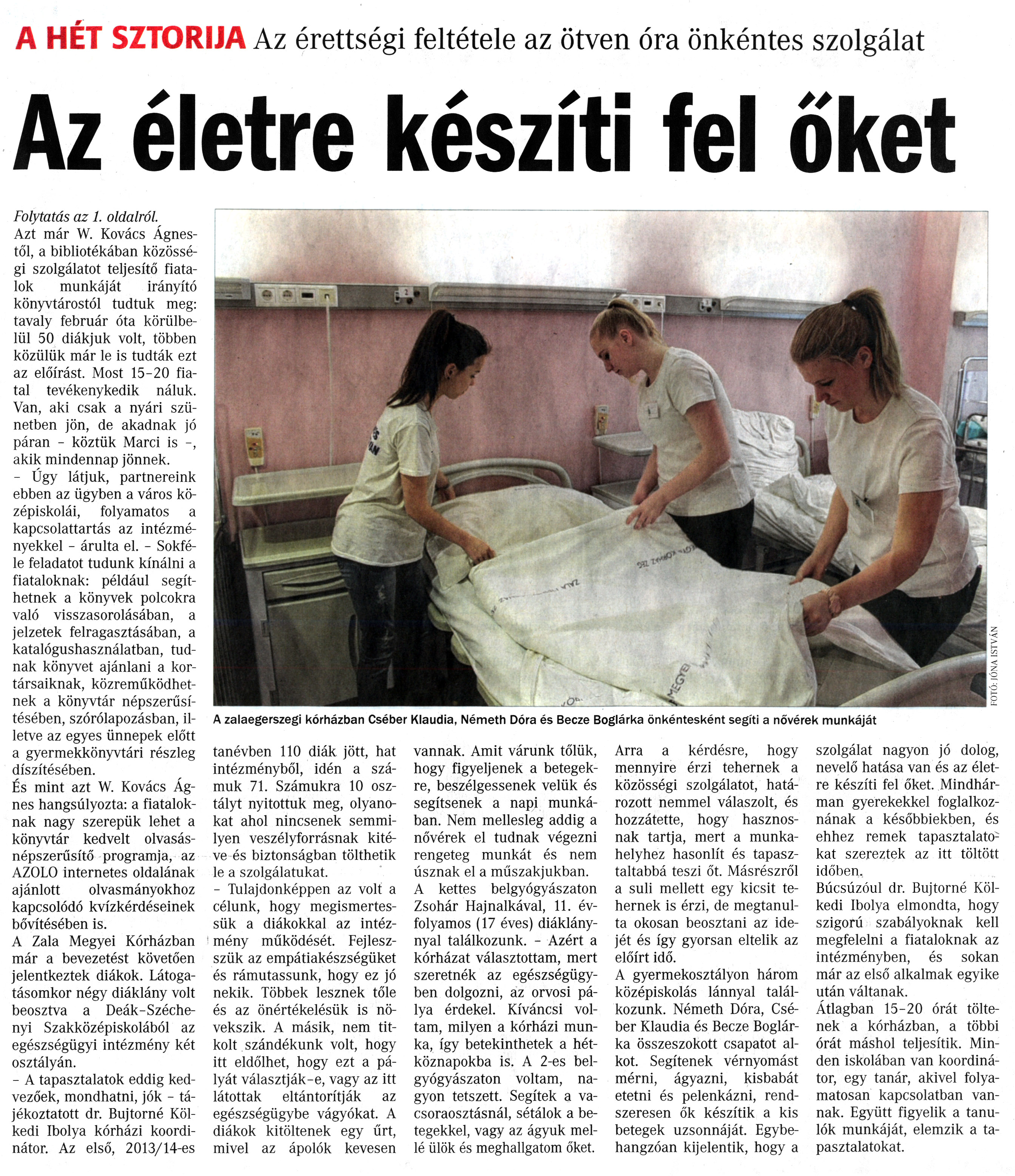 Nyilvános 1794 | 4413 | Vasárnapi Zalai Hírlap 2015. február 1. 5. szám 3. oldal - Az életre készíti fel őket | A cikk előzménye: http://www.nagykar.hu/keptar/7307/60358.html m' A HET SZTORIJA Az érettségi feltétele az ötven óra önkéntes szolgálat Az életre készíti fel őket A zalaegerszegi kórházban Cséber Klaudia, Németh Dóra és Becze Boglárka önkéntesként segíti a nővérek munkáját Folytatás az 1. oldalról. Azt már W. Kovács Ágnestől, a bibliotékában közösségi szolgálatot teljesítő fiatalok munkáját irányító könyvtárostól tudtuk meg: tavaly február óta körülbelül 50 diákjuk volt, többen közülük már le is tudták ezt az előírást. Most 15-20 fiatal tevékenykedik náluk. Van, aki csak a nyári szünetben jön, de akadnak jó páran - köztük Marci is -, akik mindennap jönnek. - Úgy látjuk, partnereink ebben az ügyben a város középiskolái, folyamatos a kapcsolattartás az intézményekkel - árulta el. - Sokféle feladatot tudunk kínálni a fiataloknak: például segíthetnek a könyvek polcokra való visszasorolásában, a jelzetek felragasztásában, a katalógushasználatban, tudnak könyvet ajánlani a kortársaiknak, közreműködhetnek a könyvtár népszerűsítésében, szórólapozásban, illetve az egyes ünnepek előtt a gyermekkönyvtári részleg díszítésében. És mint azt W. Kovács Ágnes hangsúlyozta: a fiataloknak nagy szerepük lehet a könyvtár kedvelt olvasásnépszerűsítő programja, az AZOLO internetes oldalának ajánlott olvasmányokhoz kapcsolódó kvízkérdéseinek bővítésében is. A Zala Megyei Kórházban már a bevezetést követően jelentkeztek diákok. Látogatásomkor négy diáklány volt beosztva a Deák-Széchenyi Szakközépiskolából az egészségügyi intézmény két osztályán. - A tapasztalatok eddig kedvezőek, mondhatni, jók - tájékoztatott dr. Bujtorné Köl-kedi Ibolya kórházi koordinátor. Az első, 2013/14-es tanévben 110 diák jött, hat intézményből, idén a számuk 71. Számukra 10 osztályt nyitottuk meg, olyanokat ahol nincsenek semmilyen veszélyforrásnak kitéve és biztonságban tölthetik le a szolgálatukat. - Tulajdonképpen az volt a célunk, hogy megismertessük a diákokkal az intézmény működését. Fejlesz-szük az empátiakészségüket és rámutassunk, hogy ez jó nekik. Többek lesznek tőle és az önértékelésük is növekszik. A másik, nem titkolt szándékunk volt, hogy itt eldőlhet, hogy ezt a pályát választják-e, vagy az itt látottak eltántorítják az egészségügybe vágyókat. A diákok kitöltenek egy űrt, mivel az ápolók kevesen vannak. Amit várunk tőlük, hogy figyeljenek a betegekre, beszélgessenek velük és segítsenek a napi munkában. Nem mellesleg addig a nővérek el tudnak végezni rengeteg munkát és nem úsznak el a műszakjukban. A kettes belgyógyászaton Zsohár Hajnalkával, 11. évfolyamos (17 éves) diáklánynyal találkozunk. - Azért a kórházat választottam, mert szeretnék az egészségügyben dolgozni, az orvosi pálya érdekel. Kíváncsi voltam, milyen a kórházi munka, így betekinthetek a hétköznapokba is. A 2-es belgyógyászaton voltam, nagyon tetszett. Segítek a vacsoraosztásnál, sétálok a betegekkel, vagy az ágyuk mellé ülök és meghallgatom őket. Arra a kérdésre, hogy mennyire érzi tehernek a közösségi szolgálatot, határozott nemmel válaszolt, és hozzátette, hogy hasznosnak tartja, mert a munkahelyhez hasonlít és tapasztaltabbá teszi őt. Másrészről a suli mellett egy kicsit tehernek is érzi, de megtanulta okosan beosztani az idejét és így gyorsan eltelik az előírt idő. A gyermekosztályon három középiskolás lánnyal találkozunk. Németh Dóra, Cséber Klaudia és Becze Boglárka összeszokott csapatot alkot. Segítenek vérnyomást mérni, ágyazni, kisbabát etetni és pelenkázni, rendszeresen ők készítik a kis betegek uzsonnáját. Egybehangzóan kijelentik, hogy a > szolgálat nagyon jó dolog, nevelő hatása van és az életre készíti fel őket. Mindhárman gyerekekkel foglalkoznának a későbbiekben, és ehhez remek tapasztalatokat szereztek az itt töltött időben. Búcsúzóul dr. Bujtorné Köl-kedi Ibolya elmondta, hogy szigorú szabályoknak kell megfelelni a fiataloknak az intézményben, és sokan már az első alkalmak egyike után váltanak. Átlagban 15-20 órát töltenek a kórházban, a többi órát máshol teljesítik. Minden iskolában van koordinátor, egy tanár, akivel folyamatosan kapcsolatban vannak. Együtt figyelik a tanulók munkáját, elemzik a tapasztalatokat. |