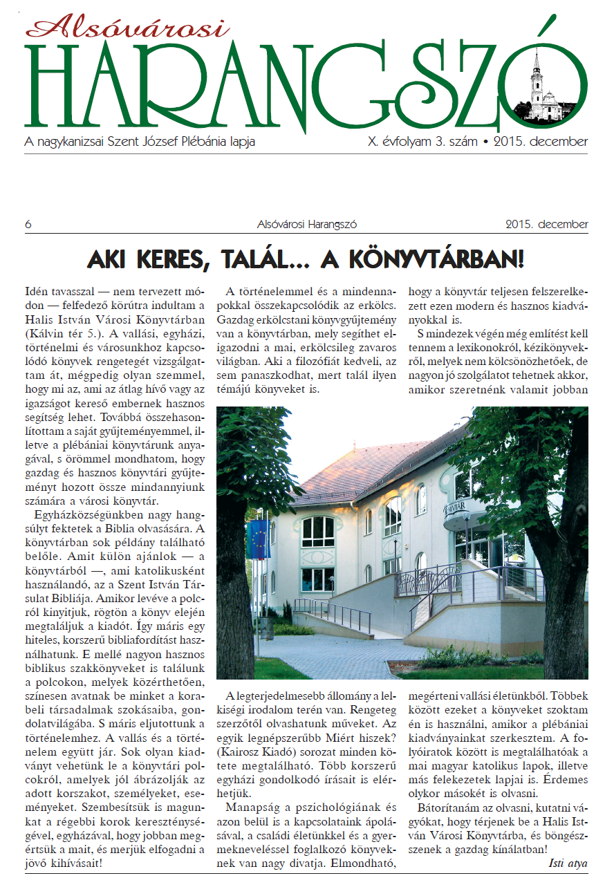 Nyilvános 2181 | 4997 | AKI KERES, TALÁL... A KÖNYVTÁRBAN! | Idén tavasszal — nem tervezett módon — felfedezõ körútra indultam a Halis István Városi Könyvtárban (Kálvin tér 5.). A vallási, egyházi, történelmi és városunkhoz kapcsolódó könyvek rengetegét vizsgálgattam át, mégpedig olyan szemmel, hogy mi az, ami az átlag hívõ vagy az igazságot keresõ embernek hasznos segítség lehet. Továbbá összehasonlítottam a saját gyûjteményemmel, illetve a plébániai könyvtárunk anyagával, s örömmel mondhatom, hogy gazdag és hasznos könyvtári gyûjteményt hozott össze mindannyiunk számára a városi könyvtár. Egyházközségünkben nagy hangsúlyt fektetek a Biblia olvasására. A könyvtárban sok példány található belõle. Amit külön ajánlok — a könyvtárból —, ami katolikusként használandó, az a Szent István Társulat Bibliája. Amikor levéve a polcról kinyitjuk, rögtön a könyv elején megtaláljuk a kiadót. Így máris egy hiteles, korszerû bibliafordítást használhatunk. E mellé nagyon hasznos biblikus szakkönyveket is találunk a polcokon, melyek közérthetõen, színesen avatnak be minket a korabeli társadalmak szokásaiba, gondolatvilágába. S máris eljutottunk a történelemhez. A vallás és a történelem együtt jár. Sok olyan kiadványt vehetünk le a könyvtári polcokról, amelyek jól ábrázolják az adott korszakot, személyeket, eseményeket. Szembesítsük is magunkat a régebbi korok kereszténységével, egyházával, hogy jobban megértsük a mait, és merjük elfogadni a jövõ kihívásait! A történelemmel és a mindennapokkal összekapcsolódik az erkölcs. Gazdag erkölcstani könyvgyûjtemény van a könyvtárban, mely segíthet eligazodni a mai, erkölcsileg zavaros világban. Aki a filozófiát kedveli, az sem panaszkodhat, mert talál ilyen témájú könyveket is. A legterjedelmesebb állomány a lelkiségi irodalom terén van. Rengeteg szerzõtõl olvashatunk mûveket. Az egyik legnépszerûbb Miért hiszek? (Kairosz Kiadó) sorozat minden kötete megtalálható. Több korszerû egyházi gondolkodó írásait is elérhetjük. Manapság a pszichológiának és azon belül is a kapcsolataink ápolásával, a családi életünkkel és a gyermekneveléssel foglalkozó könyveknek van nagy divatja. Elmondható, hogy a könyvtár teljesen felszerelkezett ezen modern és hasznos kiadványokkal is. S mindezek végén még említést kell tennem a lexikonokról, kézikönyvekrõl, melyek nem kölcsönözhetõek, de nagyon jó szolgálatot tehetnek akkor, amikor szeretnénk valamit jobban megérteni vallási életünkbõl. Többek között ezeket a könyveket szoktam én is használni, amikor a plébániai kiadványainkat szerkesztem. A folyóiratok között is megtalálhatóak a mai magyar katolikus lapok, illetve más felekezetek lapjai is. Érdemes olykor másokét is olvasni. Bátorítanám az olvasni, kutatni vágyókat, hogy térjenek be a Halis István Városi Könyvtárba, és böngészszenek a gazdag kínálatban! Isti atya |