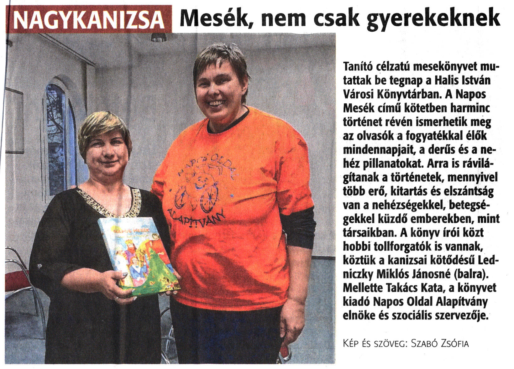 Nyilvános 1614 | 3260 | Zalai Hírlap 2018. március 24. 70. szám 4. oldal | Mesék, nem csak gyerekeknek Tanító célzatú mesekönyvet mutattak be tegnap a Halis István Városi Könyvtárban. A Napos Mesék című kötetben harminc történet révén ismerhetik meg az olvasók a fogyatékkal élők mindennapjait, a derűs és a nehéz pillanatokat. Arra is rávilágítanak a történetek, mennyivel több erő, kitartás és elszántság van a nehézségekkel, betegségekkel küzdő emberekben, mint társaikban. A könyv írói közt hobbi tollforgatók is vannak, köztük a kanizsai kötődésű Ledniczky Miklós Jánosné (balra). Mellette Takács Kata, a könyvet kiadó Napos Oldal Alapítvány elnöke és szociális szervezője. Kép és szöveg: Szabó Zsófia |