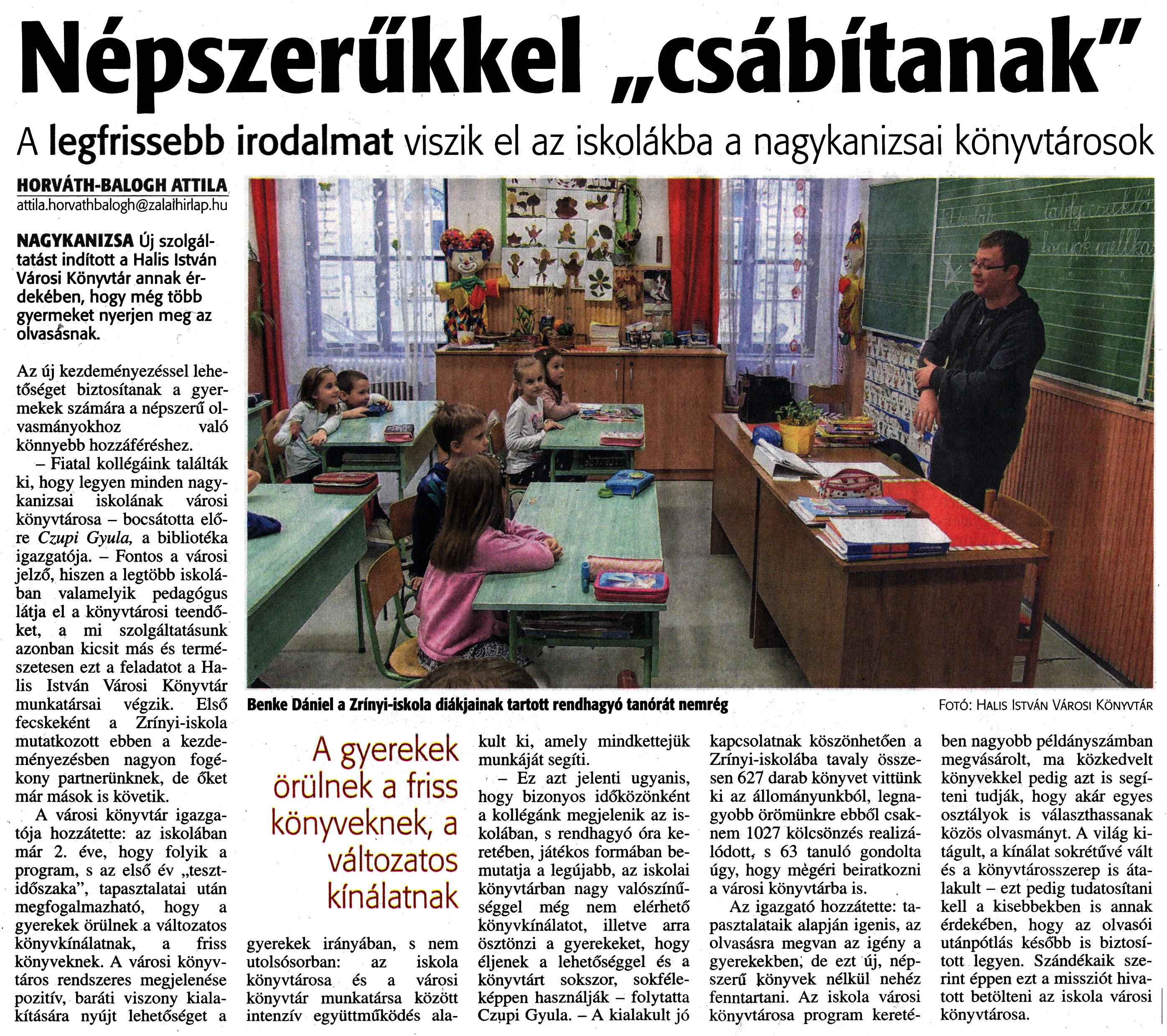 Nyilvános 1566 | 2808 | Zalai Hírlap 2018. május 15. 111. szám 3. oldal | Népszerűkkel „csábítanak" A legfrissebb irodalmat viszik el az iskolákba a nagykanizsai könyvtárosok Benke Dániel a Zrínyi-iskola diákjainak tartott rendhagyó tanórát nemrég Fotó: Halis István Városi Könyvtár HORVÁTH-BALOGH ATTILA attila.horvathbalogh@zalathirlap.hu NAGYKANIZSA Új szolgáltatást indított a Halis István Városi Könyvtár annak érdekében, hogy még több gyermeket nyerjen meg az olvasásnak. Az új kezdeményezéssel lehetőséget biztosítanak a gyermekek számára a népszerű olvasmányokhoz való könnyebb hozzáféréshez. - Fiatal kollégáink találták ki, hogy legyen minden nagykanizsai iskolának városi könyvtárosa - bocsátotta előre Czupi Gyula, a bibliotéka igazgatója. - Fontos a városi jelző, hiszen a legtöbb iskolában valamelyik pedagógus látja el a könyvtárosi teendőket, a mi szolgáltatásunk azonban kicsit más és természetesen ezt a feladatot a Halis István Városi Könyvtár munkatársai végzik. Első fecskeként a Zrínyi-iskola mutatkozott ebben a kezdeményezésben nagyon fogékony partnerünknek, de őket már mások is követik. A városi könyvtár igazgatója hozzátette: az iskolában már 2. éve, hogy folyik a program, s az első év „tesztidőszaka", tapasztalatai után megfogalmazható, hogy a gyerekek örülnek a változatos könyvkínálatnak, a friss könyveknek. A városi könyvtáros rendszeres megjelenése pozitív, baráti viszony kialakítására nyújt lehetőséget a gyerekek irányában, s nem utolsósorban: az iskola könyvtárosa és a városi könyvtár munkatársa között intenzív együttműködés alakult ki, amely mindkettejük munkáját segíti. - Ez azt jelenti ugyanis, hogy bizonyos időközönként a kollégánk megjelenik az iskolában, s rendhagyó óra keretében, játékos formában bemutatja a legújabb, az iskolai könyvtárban nagy valószínűséggel még nem elérhető könyvkínálatot, illetve arra ösztönzi a gyerekeket, hogy éljenek a lehetőséggel és a könyvtárt sokszor, sokféleképpen használják - folytatta Czupi Gyula. - A kialakult jó kapcsolatnak köszönhetően a Zrínyi-iskolába tavaly összesen 627 darab könyvet vittünk ki az állományunkból, legnagyobb örömünkre ebből csaknem 1027 kölcsönzés realizálódott, s 63 tanuló gondolta úgy, hogy mégéri beiratkozni a városi könyvtárba is. Az igazgató hozzátette: tapasztalataik alapján igenis, az olvasásra megvan az igény a gyerekekben, de ezt új, népszerű könyvek nélkül nehéz fenntartani. Az iskola városi könyvtárosa program keretében nagyobb példányszámban megvásárolt, ma közkedvelt könyvekkel pedig azt is segíteni tudják, hogy akár egyes osztályok is választhassanak közös olvasmányt. A világ kitágult, a kínálat sokrétűvé vált és a könyvtárosszerep is átalakult - ezt pedig tudatosítani kell a kisebbekben is annak érdekében, hogy az olvasói utánpótlás később is biztosított legyen. Szándékaik szerint éppen ezt a missziót hivatott betölteni az iskola városi könyvtárosa. |