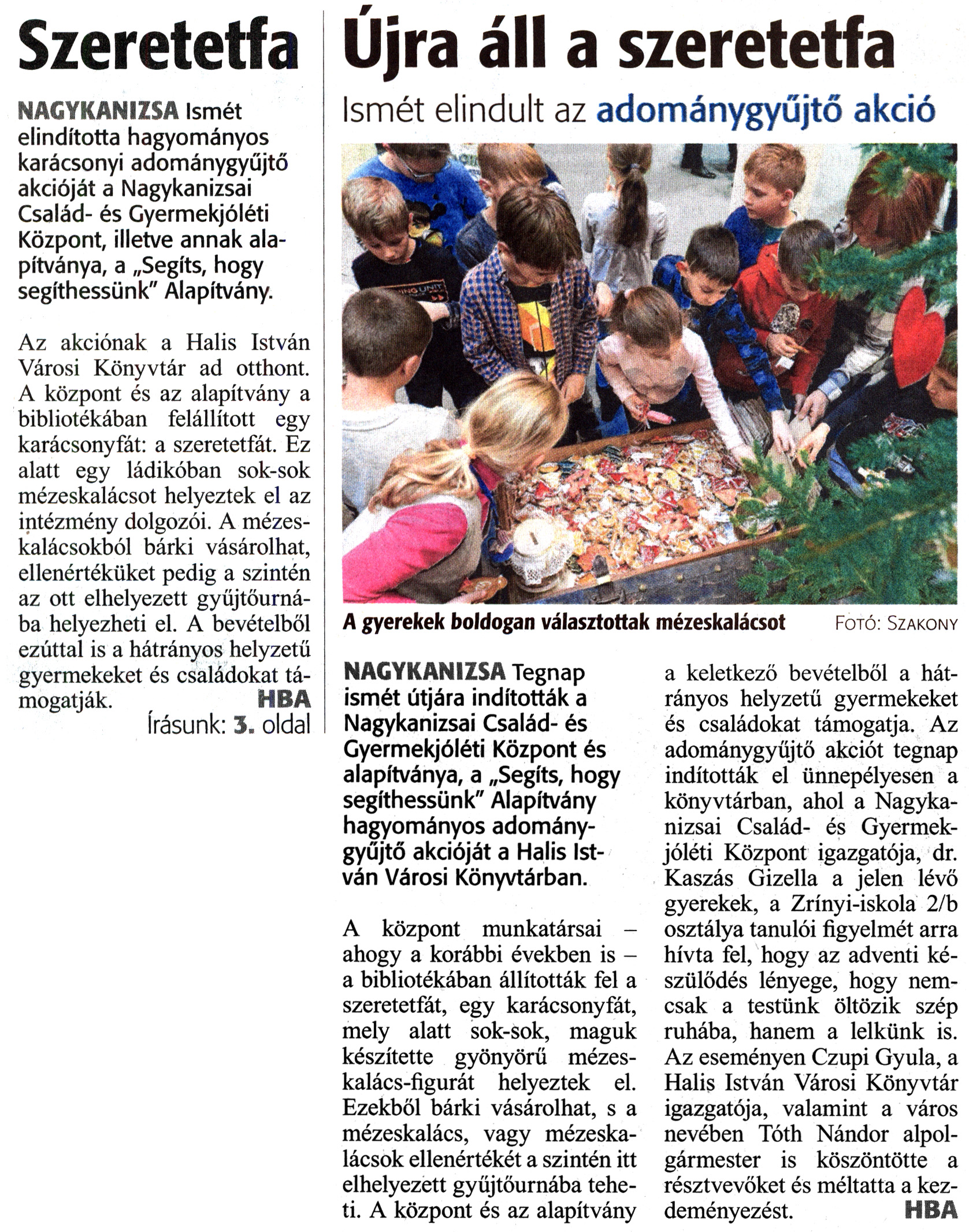Nyilvános 1409 | 2529 | Zalai Hírlap 2018. december 4. 281. szám 1, 3. oldal | Szeretetfa Újra áll a szeretetfa Ismét elindult az adománygyűjtő akció A gyerekek boldogan választottak mézeskalácsot Fotó: Szakony NAGYKANIZSA Ismét elindította hagyományos karácsonyi adománygyűjtő akcióját a Nagykanizsai Család- és Gyermekjóléti Központ, illetve annak alapítványa, a „Segíts, hogy segíthessünk" Alapítvány. Az akciónak a Halis István Városi Könyvtár ad otthont. A központ és az alapítvány a bibliotékában felállított egy karácsonyfát: a szeretetfát. Ez alatt egy ládikóban sok-sok mézeskalácsot helyeztek el az intézmény dolgozói. A mézeskalácsokból bárki vásárolhat, ellenértéküket pedig a szintén az ott elhelyezett gyűjtőurná-ba helyezheti el. A bevételből ezúttal is a hátrányos helyzetű gyermekeket és családokat támogatják. HBA írásunk: 3. oldal NAGYKANIZSA Tegnap ismét útjára indították a Nagykanizsai Család- és Gyermekjóléti Központ és alapítványa, a „Segíts, hogy segíthessünk" Alapítvány hagyományos adománygyűjtő akcióját a Halis István Városi Könyvtárban. A központ munkatársai -ahogy a korábbi években is -a bibliotékában állították fel a szeretetfát, egy karácsonyfát, mely alatt sok-sok, maguk készítette gyönyörű mézeskalács-figurát helyeztek el. Ezekből bárki vásárolhat, s a mézeskalács, vagy mézeskalácsok ellenértékét a szintén itt elhelyezett gyűjtőurnába teheti. A központ és az alapítvány a keletkező bevételből a hátrányos helyzetű gyermekeket és családokat támogatja. Az adománygyűjtő akciót tegnap indították el ünnepélyesen a könyvtárban, ahol a Nagykanizsai Család- és Gyermekjóléti Központ igazgatója, dr. Kaszás Gizella a jelen lévő gyerekek, a Zrínyi-iskola 2/b osztálya tanulói figyelmét arra hívta fel, hogy az adventi készülődés lényege, hogy nemcsak a testünk öltözik szép ruhába, hanem a lelkünk is. Az eseményen Czupi Gyula, a Halis István Városi Könyvtár igazgatója, valamint a város nevében Tóth Nándor alpolgármester is köszöntötte a résztvevőket és méltatta a kezdeményezést. HBA |