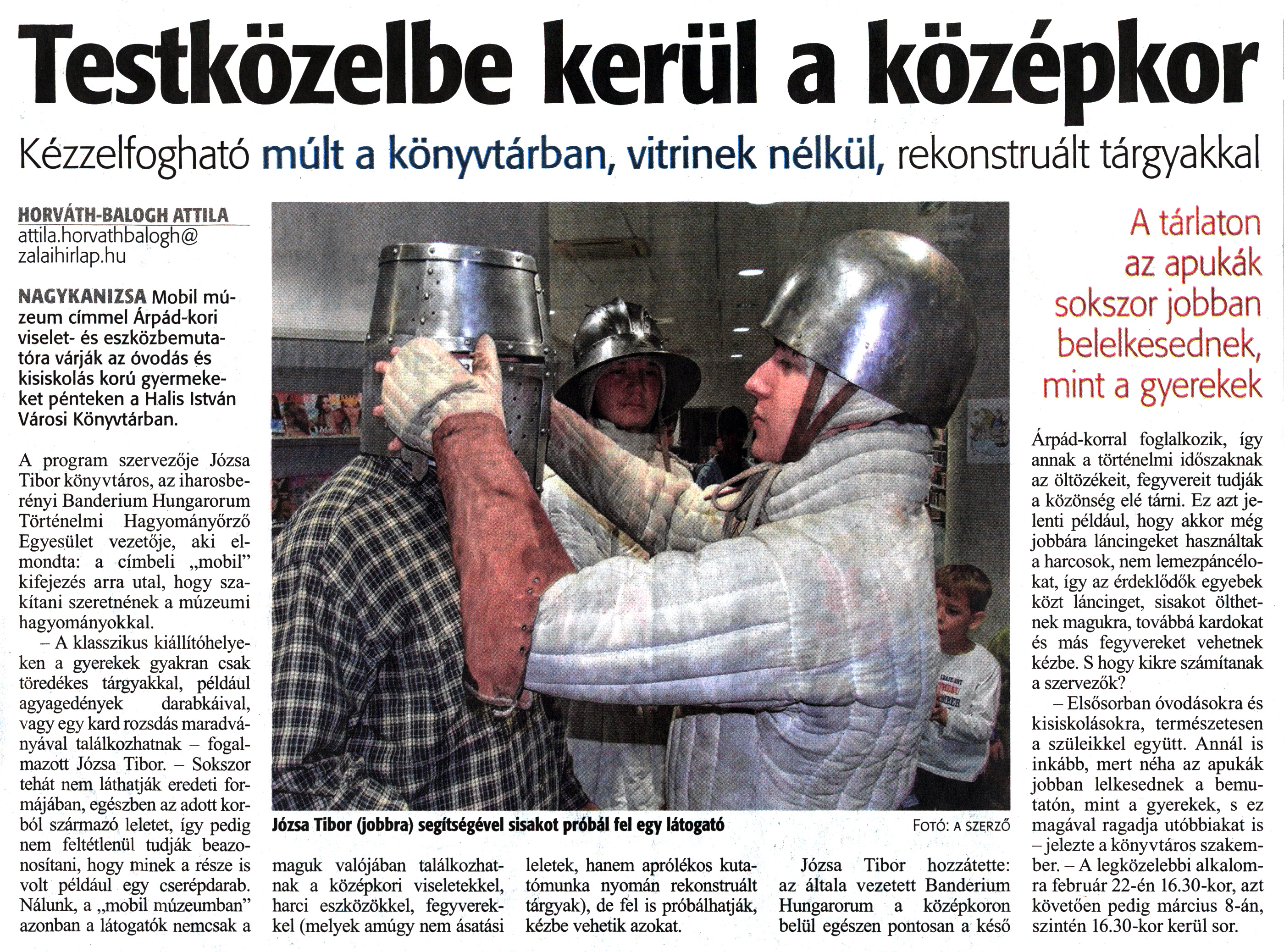 Nyilvános 1558 | 2485 | Zalai Hírlap 2019. február 20. 43. szám 13. oldal | Testközelbe kerül a középkor Kézzelfogható múlt a könyvtárban, vitrinek nélkül, rekonstruált tárgyakkal HORVÁTH BALOGH ATTILA attila.horvathbalogh@ zalaihirlap.hu NAGYKANIZSA Mobil múzeum címmel Árpád-kori viselet- és eszközbemutatóra várják az óvodás és kisiskolás korú gyermekeket pénteken a Halis István Városi Könyvtárban. A program szervezője Józsa Tibor könyvtáros, az iharosberényi Banderium Hungarorum Történelmi Hagyományőrző Egyesület vezetője, aki elmondta: a címbeli „mobil" kifejezés arra utal, hogy szakítani szeretnének a múzeumi hagyományokkal. - A klasszikus kiállítóhelyeken a gyerekek gyakran csak töredékes tárgyakkal, például agyagedények darabkáival, vagy egy kard rozsdás maradványával találkozhatnak - fogalmazott Józsa Tibor. - Sokszor tehát nem láthatják eredeti formájában, egészben az adott korból származó leletet, így pedig nem feltétlenül tudják beazonosítani, hogy minek a része is volt például egy cserépdarab. Nálunk, a „mobil múzeumban" azonban a látogatók nemcsak a maguk valójában találkozhatnak a középkori viseletekkel, harci eszközökkel, fegyverekkel (melyek amúgy nem ásatási leletek, hanem aprólékos kutatómunka nyomán rekonstruált tárgyak), de fel is próbálhatják, kézbe vehetik azokat. Józsa Tibor hozzátette: az általa vezetett Banderium Hungarorum a középkoron belül egészen pontosan a késő Árpád-korral foglalkozik, így annak a történelmi időszaknak az öltözékeit, fegyvereit tudják a közönség elé tárni. Ez azt jelenti például, hogy akkor még jobbára láncingeket használtak a harcosok, nem lemezpáncélokat, így az érdeklődők egyebek közt láncinget, sisakot ölthetnek magukra, továbbá kardokat és más fegyvereket vehetnek kézbe. S hogy kikre számítanak a szervezők? - Elsősorban óvodásokra és kisiskolásokra, természetesen a szüleikkel együtt. Annál is inkább, mert néha az apukák jobban lelkesednek a bemutatón, mint a gyerekek, s ez magával ragadja utóbbiakat is - jelezte a könyvtáros szakember. - A legközelebbi alkalomra február 22-én 16.30-kor, azt követően pedig március 8-án, szintén 16.30-kor kerül sor. Józsa Tibor (jobbra) segítségével sisakot próbál fel egy látogató Fotó: a szerző A tárlaton az apukák sokszor jobban belelkesednek, mint a gyerekek |