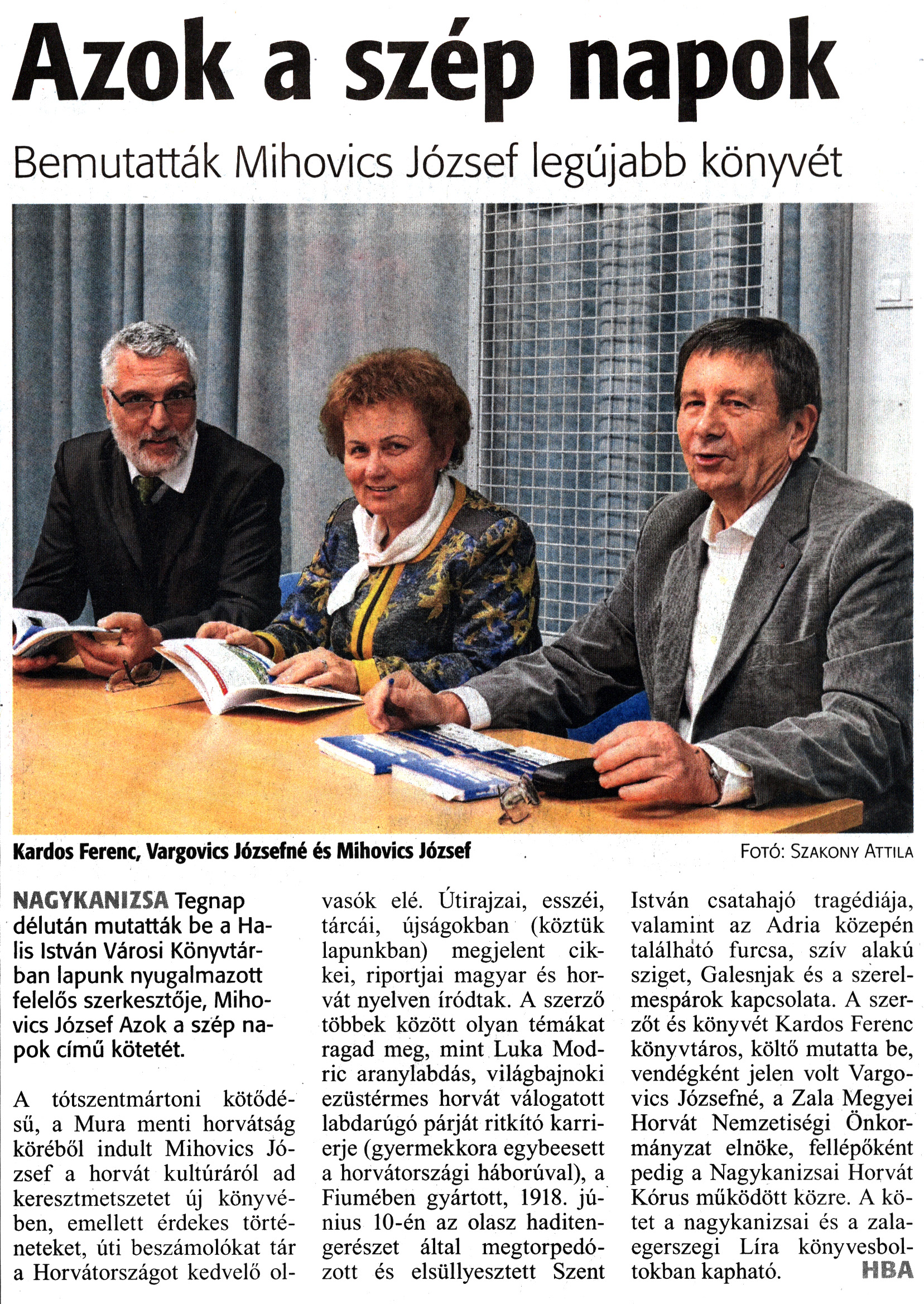 Nyilvános 1235 | 1891 | Zalai Hírlap 2019. október 31. 253. szám 16. oldal - Azok a szép napok | Azok a szép napok Bemutatták Mihovics József legújabb könyvét Kardos Ferenc, Vargovics Józsefné és Mihovics József Fotó: Szakony Attila NAGYKANIZSA Tegnap délután mutatták be a Halis István Városi Könyvtárban lapunk nyugalmazott felelős szerkesztője, Mihovics József Azok a szép napok című kötetét. A tótszentmártoni kötődésű, a Mura menti horvátság köréből indult Mihovics József a horvát kultúráról ad keresztmetszetet új könyvében, emellett érdekes történeteket, úti beszámolókat tár a Horvátországot kedvelő olvasók elé. Útirajzai, esszéi, tárcái, újságokban (köztük lapunkban) megjelent cikkei, riportjai magyar és horvát nyelven íródtak. A szerző többek között olyan témákat ragad meg, mint Luka Modric aranylabdás, világbajnoki ezüstérmes horvát válogatott labdarúgó párját ritkító karrierje (gyermekkora egybeesett a horvátországi háborúval), a Fiumében gyártott, 1918. június 10-én az olasz haditengerészet által megtorpedózott és elsüllyesztett Szent István csatahajó tragédiája, valamint az Adria közepén található furcsa, szív alakú sziget, Galesnjak és a szerelmespárok kapcsolata. A szerzőt és könyvét Kardos Ferenc könyvtáros, költő mutatta be, vendégként jelen volt Vargovics Józsefné, a Zala Megyei Horvát Nemzetiségi Önkormányzat elnöke, fellépőként pedig a Nagykanizsai Horvát Kórus működött közre. A kötet a nagykanizsai és a zalaegerszegi Líra könyvesboltokban kapható. HBA |