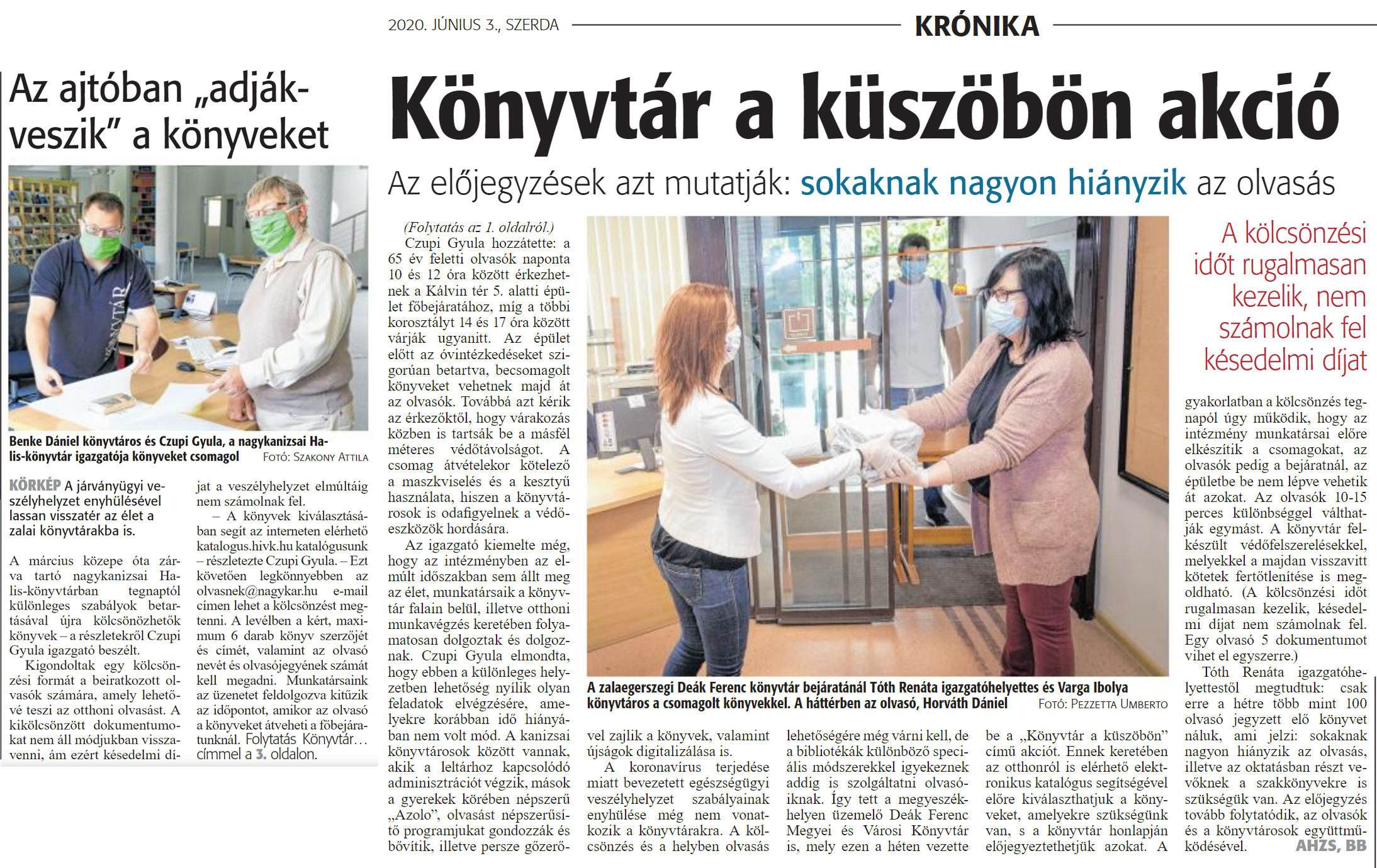 Nyilvános 1183 | 1967 | Zalai Hírlap 2020. június 3. 128. szám 1,3 oldal - Könyvtár a küszöbön akció | A járványügyi veszélyhelyzet enyhülésével lassan visszatér az élet a zalai könyvtárakba is. A március közepe óta zárva tartó nagykanizsai Halis-könyvtárban tegnaptól különleges szabályok betartásával újra kölcsönözhetők könyvek - a részletekről Czupi Gyula igazgató beszélt. Kigondoltak egy kölcsönzési formát a beiratkozott olvasók számára, amely lehetővé teszi az otthoni olvasást. A kikölcsönzött dokumentumokat nem áll módjukban visszavenni, ám ezért késedelmi díjat a veszélyhelyzet elmúltáig nem számolnak fel. - A könyvek kiválasztásában segít az interneten elérhető katalogus.hivk.hu katalógusunk - részletezte Czupi Gyula. - Ezt követően legkönnyebben az olvasnek@nagykar.hu e-mail címen lehet a kölcsönzést megtenni. A levélben a kért, maximum 6 darab könyv szerzőjét és címét, valamint az olvasó nevét és olvasójegyének számát kell megadni. Munkatársaink az üzenetet feldolgozva kitűzik az időpontot, amikor az olvasó a könyveket átveheti a főbejáratunknál. Czupi Gyula hozzátette: a 65 év feletti olvasók naponta 10 és 12 óra között érkezhetnek a Kálvin tér 5. alatti épület főbejáratához, míg a többi korosztályt 14 és 17 óra között várják ugyanitt. Az épület előtt az óvintézkedéseket szigorúan betartva, becsomagolt könyveket vehetnek majd át az olvasók. Továbbá azt kérik az érkezőktől, hogy várakozás közben is tartsák be a másfél méteres védőtávolságot. A csomag átvételekor kötelező a maszkviselés és a kesztyű használata, hiszen a könyvtárosok is odafigyelnek a védőeszközök hordására. Az igazgató kiemelte még, hogy az intézményben az elmúlt időszakban sem állt meg az élet, munkatársaik a könyvtár falain belül, illetve otthoni munkavégzés keretében folyamatosan dolgoztak és dolgoznak. Czupi Gyula elmondta, hogy ebben a különleges helyzetben lehetőség nyílik olyan feladatok elvégzésére, amelyekre korábban idő hiányában nem volt mód. A kanizsai könyvtárosok között vannak, akik a leltárhoz kapcsolódó adminisztrációt végzik, mások a gyerekek körében népszerű „Azolo" olvasást népszerűsítő programjukat gondozzák és bővítik, illetve persze gőzerővel zajlik a könyvek, valamint újságok digitalizálása is. A koronavírus terjedése miatt bevezetett egészségügyi veszélyhelyzet szabályainak enyhülése még nem vonatkozik a könyvtárakra. A kölcsönzés és a helyben olvasás lehetőségére még várni kell, de a bibliotékák különböző speciális módszerekkel igyekeznek addig is szolgáltatni olvasóiknak. így tett a megyeszékhelyen üzemelő Deák Ferenc Megyei és Városi Könyvtár is, mely ezen a héten vezette be a „Könyvtár a küszöbön" című akciót. Ennek keretében az otthonról is elérhető elektronikus katalógus segítségével előre kiválaszthatjuk a könyveket, amelyekre szükségünk van, s a könyvtár honlapján előjegyeztethetjük azokat. A gyakorlatban a kölcsönzés tegnapól úgy működik, hogy az intézmény munkatársai előre elkészítik a csomagokat, az olvasók pedig a bejáratnál, az épületbe be nem lépve vehetik át azokat. Az olvasók 10-15 perces különbséggel válthatják egymást. A könyvtár felkészült védőfelszerelésekkel, melyekkel a majdan visszavitt kötetek fertőtlenítése is megoldható. (A kölcsönzési időt rugalmasan kezelik, késedelmi díjat nem számolnak fel. Egy olvasó 5 dokumentumot vihet el egyszerre.) Tóth Renáta igazgatóhelyettestől megtudtuk: csak erre a hétre több mint 100 olvasó jegyzett elő könyvet náluk, ami jelzi: sokaknak nagyon hiányzik az olvasás, illetve az oktatásban részt vevőknek a szakkönyvekre is szükségük van. Az előjegyzés tovább folytatódik, az olvasók és a könyvtárosok együttműködésével. AHZS, BB |