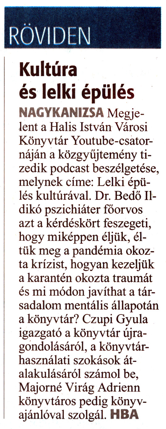 Nyilvános 1099 | 1708 | Zalai Hírlap 2021. június 1. 124. szám 3. oldal | RÖVIDEN Kultúra és lelki épülés NAGYKANIZSA Megjelent a Halis István Városi Könyvtár Youtube-csatornáján a közgyűjtemény tizedik podcast beszélgetése, melynek címe: Lelki épülés kultúrával. Dr. Bedő Ildikó pszichiáter főorvos azt a kérdéskört feszegeti, hogy miképpen éljük, éltük meg a pandémia okozta krízist, hogyan kezeljük a karantén okozta traumát és mi módon javíthat a társadalom mentális állapotán a könyvtár? Czupi Gyula igazgató a könyvtár újragondolásáról, a könyvtárhasználati szokások átalakulásáról számol be, Majomé Virág Adrienn könyvtáros pedig könyvajánlóval szolgál. HBA |