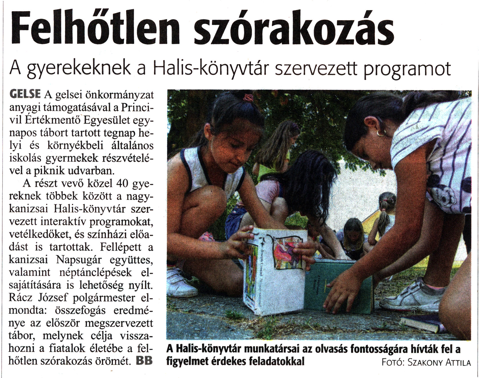 Nyilvános 1155 | 1664 | Zalai Hírlap 2021. július 8. 156. szám 16. oldal | Felhőtlen szórakozás A gyerekeknek a Halis-könyvtár szervezett programot GELSE A gelsei önkormányzat anyagi támogatásával a Princivil Értékmentő Egyesület egynapos tábort tartott tegnap helyi és környékbeli általános iskolás gyermekek részvételével a piknik udvarban. A Halis-könyvtár munkatársai az olvasás fontosságára hívták fel a figyelmet érdekes feladatokkal Fotó: Szakony Attila A részt vevő közel 40 gyereknek többek között a nagykanizsai Halis-könyvtár szervezett interaktív programokat, vetélkedőket, és színházi előadást is tartottak. Fellépett a kanizsai Napsugár együttes, valamint néptánclépések elsajátítására is lehetőség nyílt. Rácz József polgármester elmondta: összefogás eredménye az először megszervezett tábor, melynek célja visszahozni a fiatalok életébe a felhőtlen szórakozás örömét. BB |
