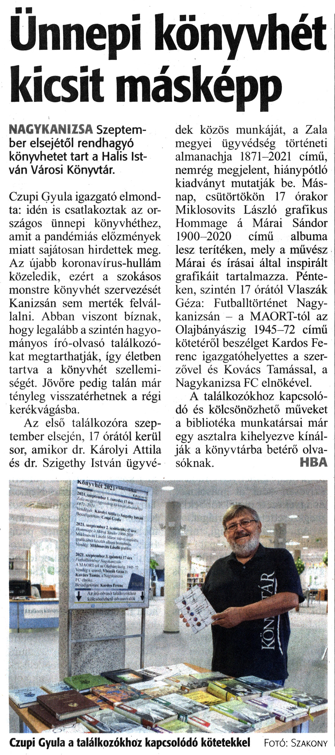 Nyilvános 1070 | 1491 | Zalai Hírlap 2021. augusztus 27. 198. szám 3. oldal | Ünnepi könyvhét kicsit másképp NAGYKANIZSA Szeptember elsejétől rendhagyó könyvhetet tart a Halis István Városi Könyvtár. Czupi Gyula igazgató elmondta: idén is csatlakoztak az országos ünnepi könyvhéthez, amit a pandémiás előzmények miatt sajátosan hirdettek meg. Az újabb koronavírus-hullám közeledik, ezért a szokásos monstre könyvhét szervezését Kanizsán sem merték felvállalni. Abban viszont bíznak, hogy legalább a szintén hagyományos író-olvasó találkozókat megtarthatják, így életben tartva a könyvhét szellemiségét. Jövőre pedig talán már tényleg visszatérhetnek a régi kerékvágásba. Az első találkozóra szeptember elsején, 17 órától kerül sor, amikor dr. Károlyi Attila és dr. Szigethy István ügyvédek közös munkáját, a Zala megyei ügyvédség történeti almanachja 1871-2021 című, nemrég megjelent, hiánypótló kiadványt mutatják be. Másnap, csütörtökön 17 órakor Miklosovits László grafikus Hommage á Márai Sándor 1900-2020 című albuma lesz terítéken, mely a művész Márai és írásai által inspirált grafikáit tartalmazza. Pénteken, szintén 17 órától Vlaszák Géza: Futballtörténet Nagykanizsán - a MAORT-tól az Olajbányászig 1945-72 című kötetéről beszélget Kardos Ferenc igazgatóhelyettes a szerzővel és Kovács Tamással, a Nagykanizsa FC elnökével. A találkozókhoz kapcsolódó és kölcsönözhető műveket a bibliotéka munkatársai már egy asztalra kihelyezve kínálják a könyvtárba betérő olvasóknak. HBA Czupi Gyula a találkozókhoz kapcsolódó kötetekkel Fotó: Szakony |