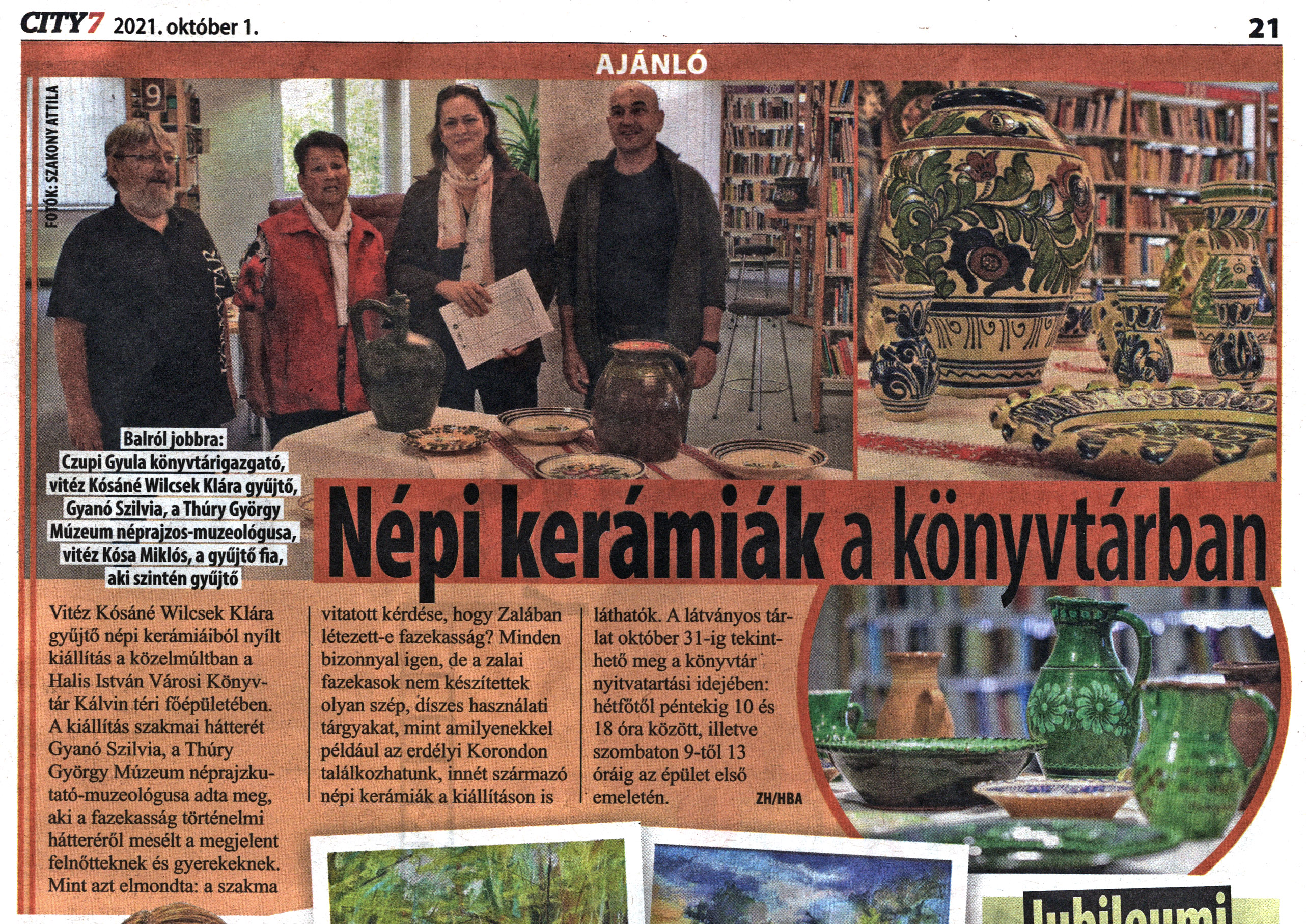 Nyilvános 1527 | 2435 | City7 Magazin 2021. október 1. 28. szám 21. oldal | Népi kerámiák a könyvtárban Vitéz Kósáné Wilcsek Klára gyűjtő népi kerámiáiból nyílt kiállítás a közelmúltban a Halis István Városi Könyvtár Kálvin téri főépületében. A kiállítás szakmai hátterét Gyanó Szilvia, a Thúry György Múzeum néprajzkutató-muzeológusa adta meg, aki a fazekasság történelmi hátteréről mesélt a megjelent felnőtteknek és gyerekeknek. Mint azt elmondta: a szakma vitatott kérdése, hogy Zalában létezett-e fazekasság? Minden bizonnyal igen, de a zalai fazekasok nem készítettek olyan szép, díszes használati tárgyakat, mint amilyenekkel például az erdélyi Korondon találkozhatunk, innét származó népi kerámiák a kiállításon is láthatók. A látványos tárlat október 31-ig tekinthető meg a könyvtár nyitvatartási idejében: hétfőtől péntekig 10 és 18 óra között, illetve szombaton 9-től 13 óráig az épület első emeletén. ZH/HBA Balról jobbra: Czupi Gyula könyvtárigazgató, vitéz Kósáné Wilcsek Klára gyűjtő, Gyanó Szilvia, a Thúry György Múzeum néprajzos-muzeológusa, vitéz Kósa Miklós, a gyűjtő fia, aki szintén gyűjtő |