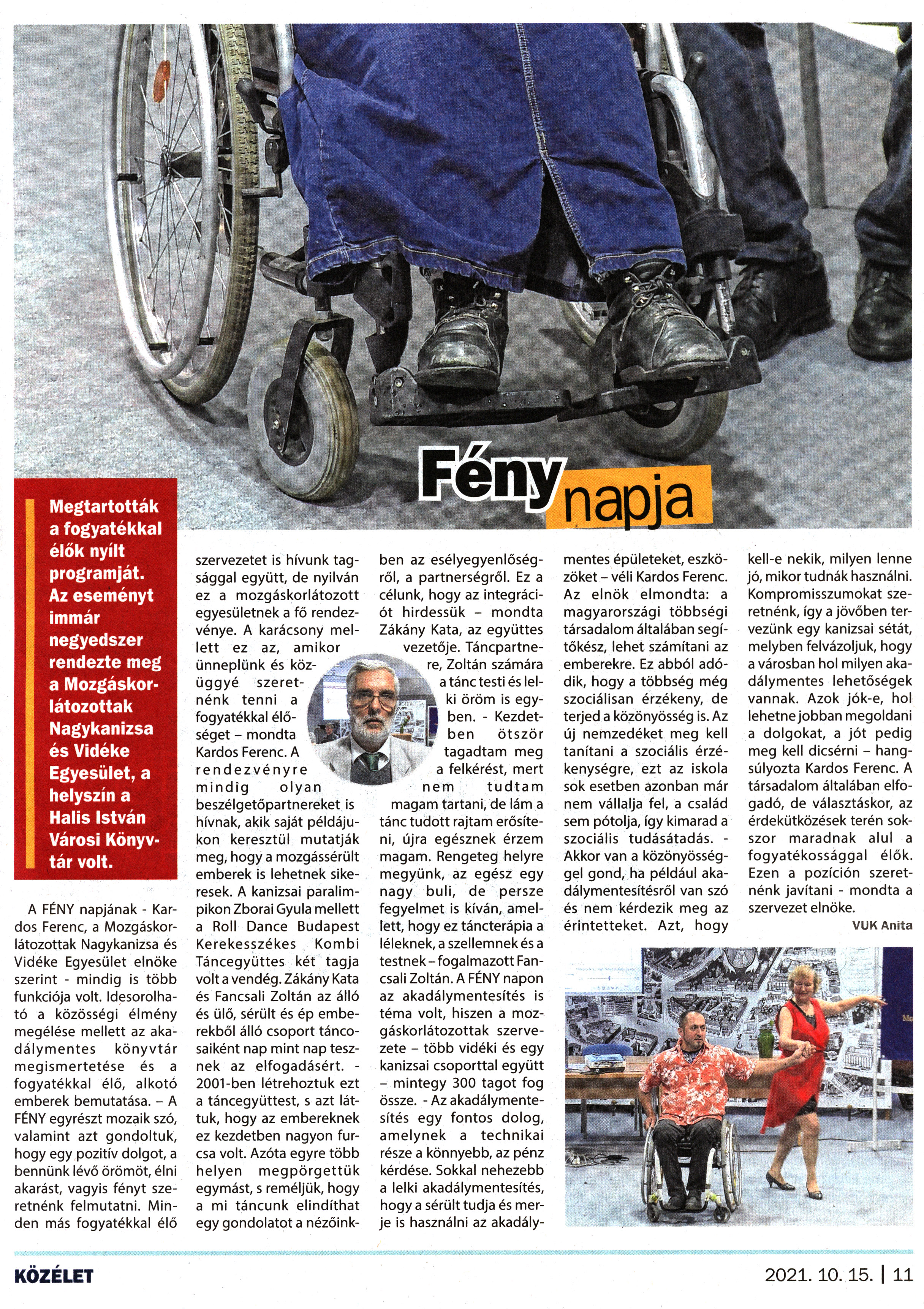 Nyilvános 1181 | 1736 | Kanizsa 2021. október 15. 18. szám 11. oldal | Fény napja Megtartották a fogyatékkal élők nyílt programját. Az eseményt immár negyedszer rendezte meg a Mozgáskorlátozottak Nagykanizsa és Vidéke Egyesület, a helyszín a Halis István Városi Könyvtár volt. A FÉNY napjának - Kardos Ferenc, a Mozgáskorlátozottak Nagykanizsa és Vidéke Egyesület elnöke szerint - mindig is több funkciója volt. Idesorolható a közösségi élmény megélése mellett az akadálymentes könyvtár megismertetése és a fogyatékkal élő, alkotó emberek bemutatása. - A FÉNY egyrészt mozaik szó, valamint azt gondoltuk, hogy egy pozitív dolgot, a bennünk lévő örömöt, élni akarást, vagyis fényt szeretnénk felmutatni. Minden más fogyatékkal élő szervezetet is hívunk tagsággal együtt, de nyilván ez a mozgáskorlátozott egyesületnek a fő rendezvénye. A karácsony mellett ez az, amikor ünneplünk és közüggyé szeretnénk tenni a fogyatékkal élőséget - mondta Kardos Ferenc. A rendezvényre mindig olyan beszélgetőpartnereket is hívnak, akik saját példájukon keresztül mutatják meg, hogy a mozgássérült emberek is lehetnek sikeresek. A kanizsai paralimpikon Zborai Gyula mellett a Roll Dance Budapest Kerekesszékes Kombi Táncegyüttes két tagja volt a vendég. Zákány Kata és Fancsali Zoltán az álló és ülő, sérült és ép emberekből álló csoport táncosaiként nap mint nap tesznek az elfogadásért. -2001-ben létrehoztuk ezt a táncegyüttest, s azt láttuk, hogy az embereknek ez kezdetben nagyon furcsa volt. Azóta egyre több helyen megpörgettük egymást, s reméljük, hogy a mi táncunk elindíthat egy gondolatot a nézőinkben az esélyegyenlőségről, a partnerségről. Ez a célunk, hogy az integrációt hirdessük - mondta Zákány Kata, az együttes vezetője. Táncpartnere, Zoltán számára a tánc testi és lelki öröm is egyben. - Kezdetben ötször tagadtam meg a felkérést, mert nem tudtam magam tartani, de lám a tánc tudott rajtam erősíteni, újra egésznek érzem magam. Rengeteg helyre megyünk, az egész egy nagy buli, de persze fegyelmet is kíván, amellett, hogy ez táncterápia a léleknek, a szellemnek és a testnek-fogalmazott Fancsali Zoltán. A FÉNY napon az akadálymentesítés is téma volt, hiszen a mozgáskorlátozottak szervezete - több vidéki és egy kanizsai csoporttal együtt - mintegy 300 tagot fog össze. - Az akadálymentesítés egy fontos dolog, amelynek a technikai része a könnyebb, az pénz kérdése. Sokkal nehezebb a lelki akadálymentesítés, hogy a sérült tudja és merje is használni az akadálymentes épületeket, eszközöket - véli Kardos Ferenc. Az elnök elmondta: a magyarországi többségi társadalom általában segítőkész, lehet számítani az emberekre. Ez abból adódik, hogy a többség még szociálisan érzékeny, de terjed a közönyösség is. Az új nemzedéket meg kell tanítani a szociális érzékenységre, ezt az iskola sok esetben azonban már nem vállalja fel, a család sem pótolja, így kimarad a szociális tudásátadás. - Akkor van a közönyösséggel gond, ha például akadálymentesítésről van szó és nem kérdezik meg az érintetteket. Azt, hogy kell-e nekik, milyen lenne jó, mikor tudnák használni. Kompromisszumokat szeretnénk, így a jövőben tervezünk egy kanizsai sétát, melyben felvázoljuk, hogy a városban hol milyen akadálymentes lehetőségek vannak. Azok jók-e, hol lehetne jobban megoldani a dolgokat, a jót pedig meg kell dicsérni - hangsúlyozta Kardos Ferenc. A társadalom általában elfogadó, de választáskor, az érdekütközések terén sokszor maradnak alul a fogyatékossággal élők. Ezen a pozíción szeretnénk javítani - mondta a szervezet elnöke. VUK Anita |