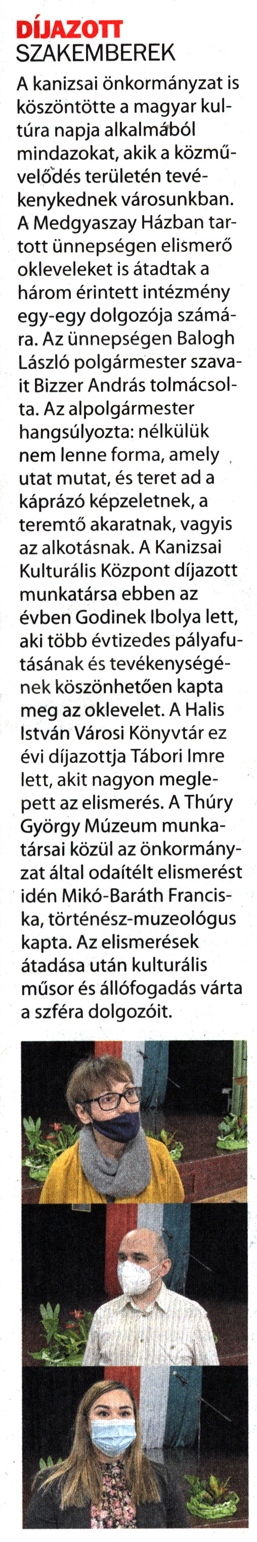 Nyilvános 1171 | 1523 | Kanizsa 2022. január 28. 2. szám 3. oldal | DÍJAZOTT SZAKEMBEREK A kanizsai önkormányzat is köszöntötte a magyar kultúra napja alkalmából mindazokat, akik a közművelődés területén tevékenykednek városunkban. A Medgyaszay Házban tartott ünnepségen elismerő okleveleket is átadtak a három érintett intézmény egy-egy dolgozója számára. Az ünnepségen Balogh László polgármester szavait Bizzer András tolmácsolta. Az alpolgármester hangsúlyozta: nélkülük nem lenne forma, amely utat mutat, és teret ad a káprázó képzeletnek, a teremtő akaratnak, vagyis az alkotásnak. A Kanizsai Kulturális Központ díjazott munkatársa ebben az évben Gödinek Ibolya lett, aki több évtizedes pályafutásának és tevékenységének köszönhetően kapta meg az oklevelet. A Halis István Városi Könyvtár ez évi díjazottja Tábori Imre lett, akit nagyon meglepett az elismerés. A Thúry György Múzeum munkatársai közül az önkormányzat által odaítélt elismerést idén Mikó-Baráth Franciska, történész-muzeológus kapta. Az elismerések átadása után kulturális műsor és állófogadás várta a szféra dolgozóit. |