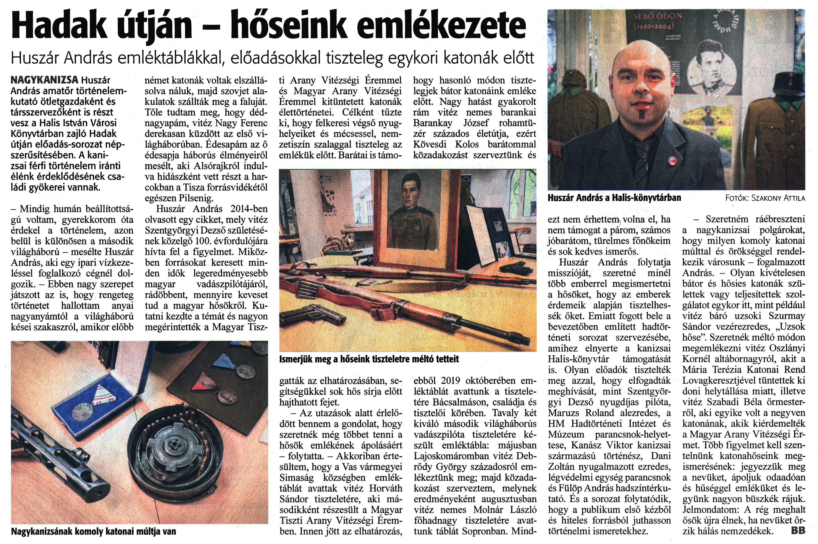 Nyilvános 984 | 1350 | Zalai Hírlap 2023. február 8. 33. szám 4. oldal | Hadak útján - hőseink emlékezete Huszár András emléktáblákkal, előadásokkal tiszteleg egykori katonák előtt NAGYKANIZSA Huszár András amatőr történelemkutató ötletgazdaként és társszervezőként is részt vesz a Halis István Városi Könyvtárban zajló Hadak útján előadás-sorozat népszerűsítésében. A kanizsai férfi történelem iránti élénk érdeklődésének családi gyökerei vannak. - Mindig humán beállítottságú voltam, gyerekkorom óta érdekel a történelem, azon belül is különösen a második világháború - mesélte Huszár András, aki egy ipari vízkezeléssel foglalkozó cégnél dolgozik. - Ebben nagy szerepet játszott az is, hogy rengeteg történetet hallottam anyai nagyanyámtól a világháború kései szakaszról, amikor előbb német katonák voltak elszállásolva náluk, majd szovjet alakulatok szállták meg a faluját. Tőle tudtam meg, hogy dédnagyapám, vitéz Nagy Ferenc derekasan küzdött az első világháborúban. Édesapám az ő édesapja háborús élményeiről mesélt, aki Alsórajkról indulva hidászként vett részt a harcokban a Tisza forrásvidékétől egészen Pilsenig. Huszár András 2014-ben olvasott egy cikket, mely vitéz Szentgyörgyi Dezső születésének közelgő 100. évfordulójára hívta fel a figyelmet. Miközben forrásokat keresett minden idők legeredményesebb magyar vadászpilótájáról, rádöbbent, mennyire keveset tud a magyar hősökről. Kutatni kezdte a témát és nagyon megérintették a Magyar Tiszti Arany Vitézségi Éremmel és Magyar Arany Vitézségi Éremmel kitüntetett katonák élettörténetei. Célként tűzte ki, hogy felkeresi végső nyughelyeiket és mécsessel, nemzetiszín szalaggal tiszteleg az emlékük előtt. Barátai is támogatták az elhatározásában, segítségükkel sok hős sírja előtt hajthatott fejet. - Az utazások alatt érlelődött bennem a gondolat, hogy szeretnék még többet tenni a hősök emlékének ápolásáért - folytatta. - Akkoriban értesültem, hogy a Vas vármegyei Simaság községben emléktáblát avattak vitéz Horváth Sándor tiszteletére, aki másodikként részesült a Magyar Tiszti Arany Vitézségi Éremben. Innen jött az elhatározás, hogy hasonló módon tisztelegjek bátor katonáink emléke előtt. Nagy hatást gyakorolt rám vitéz nemes barankai Barankay József rohamtüzér százados életútja, ezért Kövesdi Kolos barátommal közadakozást szerveztünk és ebből 2019 októberében emléktáblát avattunk a tiszteletére Bácsalmáson, családja és tisztelői körében. Tavaly két kiváló második világháborús vadászpilóta tiszteletére készült emléktábla: májusban Lajoskomáromban vitéz Debrődy György századosról emlékeztünk meg; majd közadakozást szerveztem, melynek eredményeként augusztusban vitéz nemes Molnár László főhadnagy tiszteletére avattunk táblát Sopronban. Mindezt nem érhettem, volna el, ha nem támogat a párom, számos jóbarátom, türelmes főnökeim és sok kedves ismerős. Huszár András folytatja misszióját, szeretné minél több emberrel megismertetni a hősöket, hogy az emberek érdemeik alapján tisztelhessék őket. Emiatt fogott bele a bevezetőben említett hadtörténeti sorozat szervezésébe, amihez elnyerte a kanizsai Halis-könyvtár támogatását is. Olyan előadók tisztelték meg azzal, hogy elfogadták meghívását, mint Szentgyörgyi Dezső nyugdíjas pilóta, Maruzs Roland alezredes, a HM Hadtörténeti Intézet és Múzeum parancsnok-helyet-tese, Kanász Viktor kanizsai származású történész, Dani Zoltán nyugalmazott ezredes, légvédelmi egység parancsnok és Fülöp András hadszíntérkutató. És a sorozat folytatódik, hogy a publikum első kézből és hiteles forrásból juthasson történelmi ismeretekhez. Fotók: Szakony Attila - Szeretném ráébreszteni a nagykanizsai polgárokat, hogy milyen komoly katonai múlttal és örökséggel rendelkezik városunk - fogalmazott András. - Olyan kivételesen bátor és hősies katonák születtek vagy teljesítettek szolgálatot egykor itt, mint például vitéz báró uzsoki Szurmay Sándor vezérezredes, „Uzsok hőse". Szeretnék méltó módon megemlékezni vitéz Oszlányi Kornél altábornagyról, akit a Mária Terézia Katonai Rend Lovagkeresztjével tüntettek ki doni helytállása miatt, illetve vitéz Szabadi Béla őrmesterről, aki egyike volt a negyven katonának, akik kiérdemelték a Magyar Arany Vitézségi Érmet. Több figyelmet kell szentelnünk katonahőseink megismerésének: jegyezzük meg a nevüket, ápoljuk odaadóan és hűséggel emléküket és legyünk nagyon büszkék rájuk. Jelmondatom: A rég meghalt ősök újra élnek, ha nevüket őrzik hálás nemzedékek. BB Nagykanizsának komoly katonai múltja van Ismerjük meg a hőseink tiszteletre méltó tetteit |
