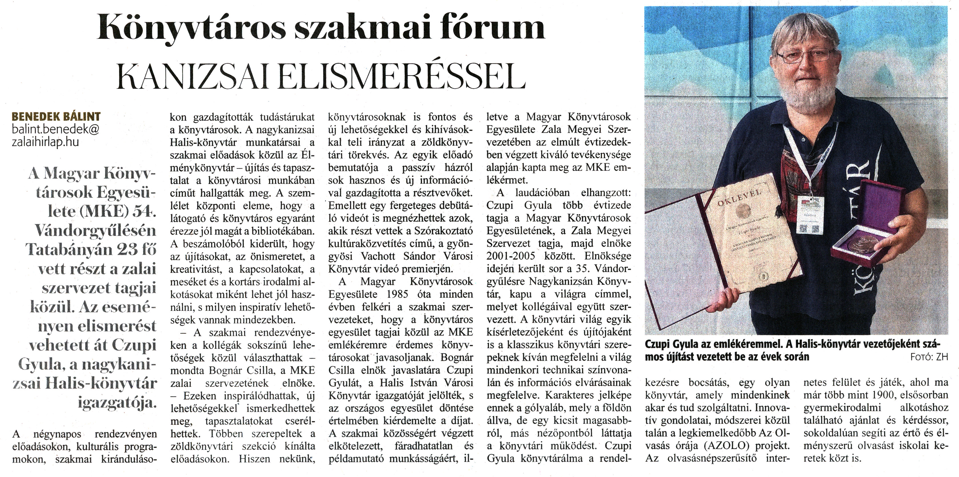 Nyilvános 1133 | 1678 | Zalai Hírlap 2023. augusztus 12. 87. szám 4. oldal | Könyvtáros szakmai fórum KANIZSAI ELISMERÉSSEL Czupi Gyula az emlékéremmel. A Halis-könyvtár vezetőjeként számos újítást vezetett be az évek során Fotó: ZM BENEDEK BÁLINT balint.benedek@ zalaihirlap.hu A Magyar Könyvtárosok Egyesülete (MKE) 54. Vándorgyűlésén Tatabányán 23 fő vett részt a zalai szervezet tagjai közül. Az eseményen elismerést vehetett át Czupi Gyula, a nagykanizsai Halis-könyvtár igazgatója. A négynapos rendezvényen előadásokon, kulturális programokon, szakmai kirándulásokon gazdagították tudástárukat a könyvtárosok. A nagykanizsai Halis-könyvtár munkatársai a szakmai előadások közül az Élménykönyvtár - újítás és tapasztalat a könyvtárosi munkában címűt hallgatták meg. A szemlélet központi eleme, hogy a látogató és könyvtáros egyaránt érezze jól magát a bibliotékában. A beszámolóból kiderült, hogy az újításokat, az önismeretet, a kreativitást, a kapcsolatokat, a meséket és a kortárs irodalmi alkotásokat miként lehet jól használni, s milyen inspiratív lehetőségek vannak mindezekben. - A szakmai rendezvényeken a kollégák sokszínű lehetőségek közül választhattak - mondta Bognár Csilla, a MKE zalai szervezetének elnöke. - Ezeken inspirálódhattak, új lehetőségekkel ismerkedhettek meg, tapasztalatokat cserélhettek. Többen szerepeltek a zöldkönyvtári szekció kínálta előadásokon. Hiszen nekünk, könyvtárosoknak is fontos és új lehetőségekkel és kihívásokkal teli irányzat a zöldkönyvtári törekvés. Az egyik előadó bemutatója a passzív házról sok hasznos és új információval gazdagította a résztvevőket. Emellett egy fergeteges debütáló videót is megnézhettek azok, akik részt vettek a Szórakoztató kultúraközvetítés című, a gyöngyösi Vachott Sándor Városi Könyvtár videó premierjén. A Magyar Könyvtárosok Egyesülete 1985 óta minden évben felkéri a szakmai szervezeteket, hogy a könyvtáros egyesület tagjai közül az MKE emlékéremre érdemes könyvtárosokat javasoljanak. Bognár Csilla elnök javaslatára Czupi Gyulát, a Halis István Városi Könyvtár igazgatóját jelölték, s az országos egyesület döntése értelmében kiérdemelte a díjat. A szakmai közösségért végzett elkötelezett, fáradhatatlan és példamutató munkásságáért, illetve a Magyar Könyvtárosok Egyesülete Zala Megyei Szervezetében az elmúlt évtizedekben végzett kiváló tevékenysége alapján kapta meg az MKE emlékérmet. A laudációban elhangzott: Czupi Gyula több évtizede tagja a Magyar Könyvtárosok Egyesületének, a Zala Megyei Szervezet tagja, majd elnöke 2001-2005 között. Elnöksége idején került sor a 35. Vándorgyűlésre Nagykanizsán Könyvtár, kapu a világra címmel, melyet kollégáival együtt szervezett. A könyvtári világ egyik kísérletezőjeként és újítójaként is a klasszikus könyvtári szerepeknek kíván megfelelni a világ mindenkori technikai színvonalán és információs elvárásainak megfelelve. Karakteres jelképe ennek a gólyaláb, mely a földön állva, de egy kicsit magasabbról, más nézőpontból láttatja a könyvtári működést. Czupi Gyula könyvtárálma a rendelkezésre bocsátás, egy olyan könyvtár, amely mindenkinek akar és tud szolgáltatni. Innovatív gondolatai, módszerei közül talán a legkiemelkedőbb Az Olvasás órája (AZOLO) projekt. Az olvasásnépszerűsítő internetes felület és játék, ahol ma már több mint 1900, elsősorban gyermekirodalmi alkotáshoz található ajánlat és kérdéssor, sokoldalúan segíti az értő és élményszerű olvasást iskolai keretek közt is. |