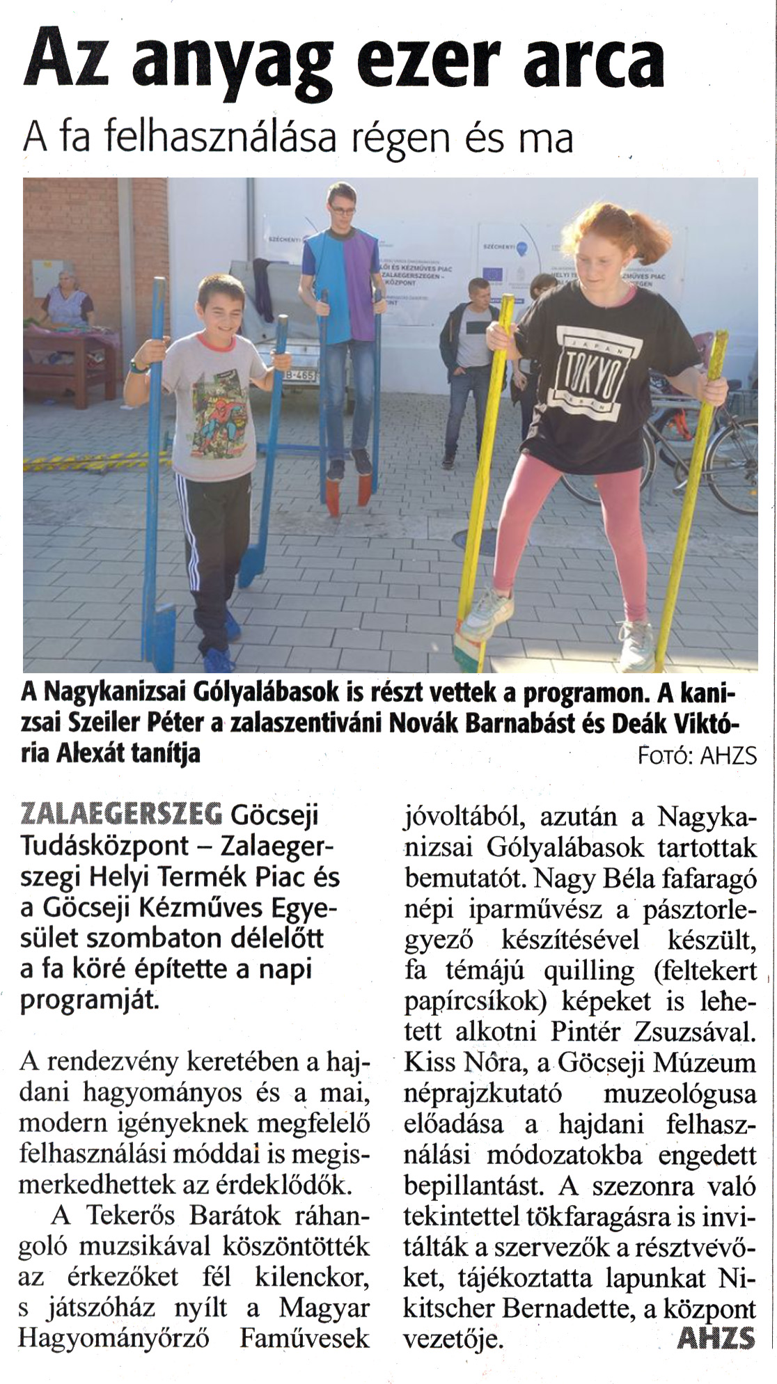 Nyilvános 1167 | 1380 | Zalai Hírlap 2023. október 17. 243. szám 16. oldal - Az anyag ezer arca | Az anyag ezer arca A fa felhasználása régen és ma A Nagykanizsai Gólyalábasok is részt vettek a programon. A kanizsai Szeiler Péter a zalaszentiváni Nóvák Barnabást és Deák Viktória Alexát tanítja Fotó: AHZS ZALAEGERSZEG Göcseji Tudásközpont - Zalaegerszegi Helyi Termék Piac és a Göcseji Kézműves Egyesület szombaton délelőtt a fa köré építette a napi programját. A rendezvény keretében a hajdani hagyományos és a mai, modern igényeknek megfelelő felhasználási móddal is megismerkedhettek az érdeklődők. A Tekerős Barátok ráhangoló muzsikával köszöntötték az érkezőket fél kilenckor, s játszóház nyílt a Magyar Hagyományőrző Faművesek jóvoltából, azután a Nagykanizsai Gólyalábasok tartottak bemutatót. Nagy Béla fafaragó népi iparművész a pásztorlegyező készítésével készült, fa témájú quilling (feltekert papírcsíkok) képeket is lehetett alkotni Pintér Zsuzsával. Kiss Nóra, a Göcseji Múzeum néprajzkutató muzeológusa előadása a hajdani felhasználási módozatokba engedett bepillantást. A szezonra való tekintettel tökfaragásra is invitálták a szervezők a résztvevőket, tájékoztatta lapunkat Nikitscher Bernadette, a központ vezetője. AHZS |
