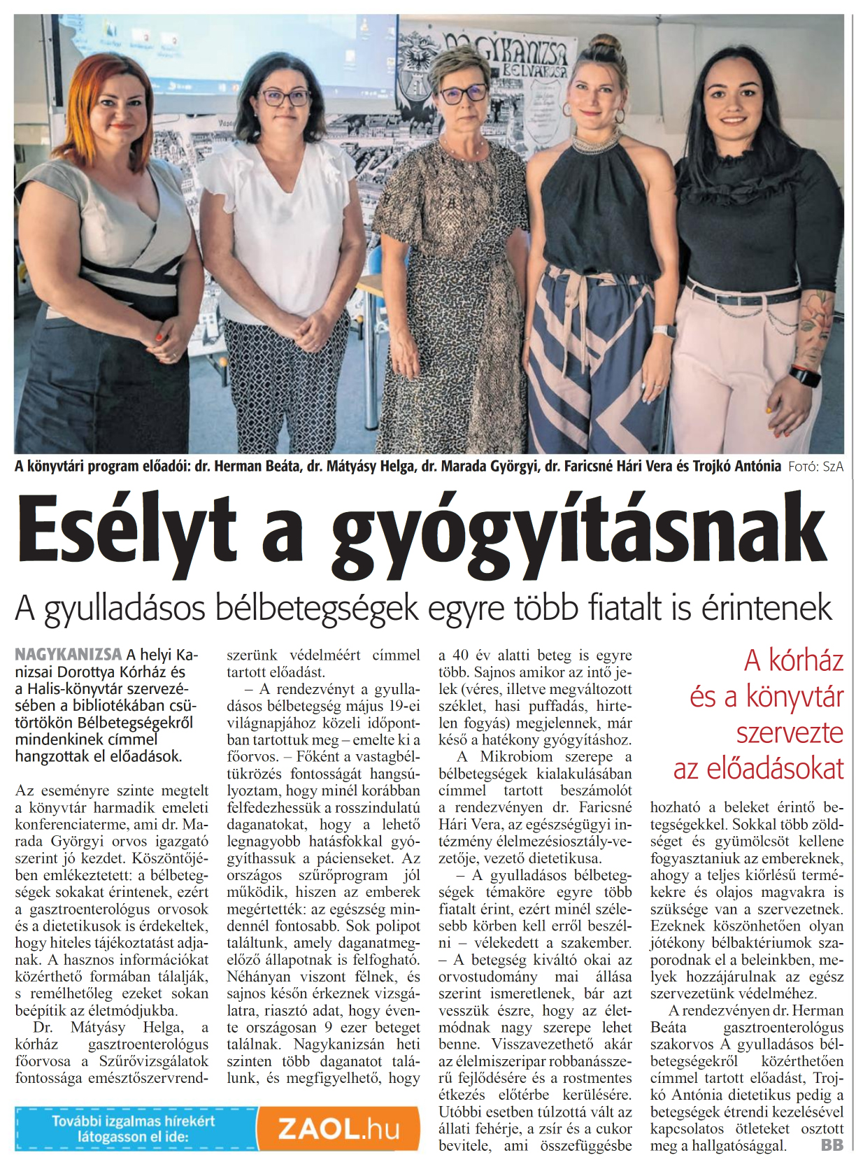 Nyilvános 1069 | 1040 | Zalai Hírlap 2024. június 22. 144. szám 2. oldal | A könyvtári program előadói: dr. Hermán Beáta, dr. Mátyásy Helga, dr. Marada Györgyi, dr. Faricsné Hári Vera és Trojkó Antónia Fotó: SzA Esélyt a gyógyításnak A gyulladásos bélbetegségek egyre több fiatalt is érintenek NAGYKANIZSA A helyi Kanizsai Dorottya Kórház és a Halis-könyvtár szervezésében a bibliotékában csütörtökön Bélbetegségekről mindenkinek címmel hangzottak el előadások. Az eseményre szinte megtelt a könyvtár harmadik emeleti konferenciaterme, ami dr. Marada Györgyi orvos igazgató szerint jó kezdet. Köszöntőjében emlékeztetett: a bélbetegségek sokakat érintenek, ezért a gasztroenterológus orvosok és a dietetikusok is érdekeltek, hogy hiteles tájékoztatást adjanak. A hasznos információkat közérthető formában tálalják, s remélhetőleg ezeket sokan beépítik az életmódjukba. Dr. Mátyásy Helga, a kórház gasztroenterológus főorvosa a Szűrővizsgálatok fontossága emésztőszervrendszerünk védelméért címmel tartott előadást. - A rendezvényt a gyulladásos bélbetegség május 19-ei világnapjához közeli időpontban tartottuk meg - emelte ki a főorvos. - Főként a vastagbéltükrözés fontosságát hangsúlyoztam, hogy minél korábban felfedezhessük a rosszindulatú daganatokat, hogy a lehető legnagyobb hatásfokkal gyógyíthassuk a pácienseket. Az országos szürőprogram jól működik, hiszen az emberek megértették: az egészség mindennél fontosabb. Sok polipot találtunk, amely daganatmegelőző állapotnak is felfogható. Néhányan viszont félnek, és sajnos későn érkeznek vizsgálatra, riasztó adat, hogy évente országosan 9 ezer beteget találnak. Nagykanizsán heti szinten több daganatot találunk, és megfigyelhető, hogy a 40 év alatti beteg is egyre több. Sajnos amikor az intő jelek (véres, illetve megváltozott széklet, hasi puffadás, hirtelen fogyás) megjelennek, már késő a hatékony gyógyításhoz. A Mikrobiom szerepe a bélbetegségek kialakulásában címmel tartott beszámolót a rendezvényen dr. Faricsné Hári Vera, az egészségügyi intézmény élelmezésiosztály-vezetője, vezető dietetikusa. - A gyulladásos bélbetegségek témaköre egyre több fiatalt érint, ezért minél szélesebb körben kell erről beszélni - vélekedett a szakember. - A betegség kiváltó okai az orvostudomány mai állása szerint ismeretlenek, bár azt vesszük észre, hogy az életmódnak nagy szerepe lehet benne. Visszavezethető akár az élelmiszeripar robbanásszerű fejlődésére és a rostmentes étkezés előtérbe kerülésére. Utóbbi esetben túlzottá vált az állati fehérje, a zsír és a cukor bevitele, ami összefüggésbe hozható a beleket érintő betegségekkel. Sokkal több zöldséget és gyümölcsöt kellene fogyasztaniuk az embereknek, ahogy a teljes kiőrlésű termékekre és olajos magvakra is szüksége van a szervezetnek. Ezeknek köszönhetően olyan jótékony bélbaktériumok szaporodnak el a beleinkben, melyek hozzájárulnak az egész szervezetünk védelméhez. A rendezvényen dr. Hermán Beáta gasztroenterológus szakorvos A gyulladásos bélbetegségekről közérthetően címmel tartott előadást, Trojkó Antónia dietetikus pedig a betegségek étrendi kezelésével kapcsolatos ötleteket osztott meg a hallgatósággal. BB |