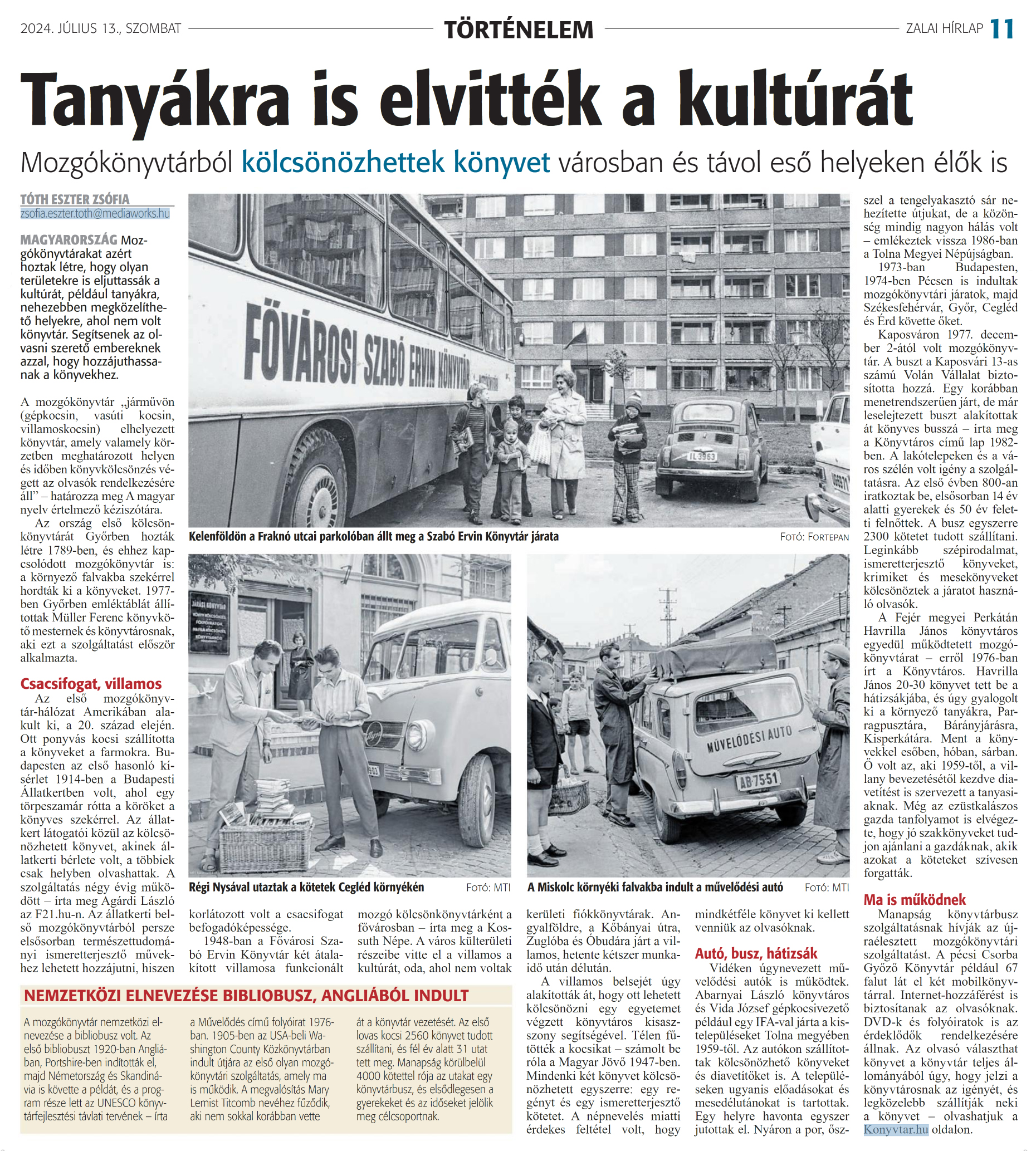 Nyilvános 835 | 1068 | Zalai Hírlap 2024. július 13. 162. szám 11. oldal | Tanyákra is elvitték a kultúrát Mozgókönyvtárból kölcsönözhettek könyvet városban és távol eső helyeken élők is TÓTH ESZTER ZSÓFIA zsofia.eszter.toth@mediaworks.hu MAGYARORSZÁG Mozgókönyvtárakat azért hoztak létre, hogy olyan területekre is eljuttassák a kultúrát, például tanyákra, nehezebben megközelíthető helyekre, ahol nem volt könyvtár. Segítsenek az olvasni szerető embereknek azzal, hogy hozzájuthassanak a könyvekhez. A mozgókönyvtár „járművön (gépkocsin, vasúti kocsin, villamoskocsin) elhelyezett könyvtár, amely valamely körzetben meghatározott helyen és időben könyvkölcsönzés végett az olvasók rendelkezésére áll" - határozza meg A magyar nyelv értelmező kéziszótára. Az ország első kölcsön-könyvtárát Győrben hozták létre 1789-ben, és ehhez kapcsolódott mozgókönyvtár is: a környező falvakba szekérrel hordták ki a könyveket. 1977-ben Győrben emléktáblát állítottak Müller Ferenc könyvkötő mesternek és könyvtárosnak, aki ezt a szolsáltatást először alkalmazta. Az első mozgókönyvtár-hálózat Amerikában alakult ki, a 20. század elején. Ott ponyvás kocsi szállította a könyveket a farmokra. Budapesten az első hasonló kísérlet 1914-ben a Budapesti Állatkertben volt, ahol egy törpeszamár rótta a köröket a könyves szekérrel. Az állatkert látogatói közül az kölcsönözhetett könyvet, akinek állatkerti bérlete volt, a többiek csak helyben olvashattak. A szolgáltatás négy évig működött - írta meg Agárdi László az F21.hu-n. Az állatkerti belső mozgókönyvtárból persze elsősorban természettudományi ismeretterjesztő müvekhez lehetett hozzájutni, hiszen korlátozott volt a csacsifogat befogadóképessége. 1948-ban a Fővárosi Szabó Ervin Könyvtár két átalakított villamosa funkcionált mozgó kölcsönkönyvtárként a fővárosban - írta meg a Kossuth Népe. A város külterületi részeibe vitte el a villamos a kultúrát, oda, ahol nem voltak kerületi fiókkönyvtárak. Angyalföldre, a Kőbányai útra, Zuglóba és Óbudára járt a villamos, hetente kétszer munkaidő után délután. A villamos belsejét úgy alakították át, hogy ott lehetett kölcsönözni egy egyetemet végzett könyvtáros kisasszony segítségével. Télen fűtötték a kocsikat - számolt be róla a Magyar Jövő 1947-ben. Mindenki két könyvet kölcsönözhetett egyszerre: egy regényt és egy ismeretterjesztő kötetet. A népnevelés miatti érdekes feltétel volt, hogy mindkétféle könyvet ki kellett venniük az olvasóknak. Vidéken úgynevezett művelődési autók is működtek. Abarnyai László könyvtáros és Vida József gépkocsivezető például egy IFA-val járta a kistelepüléseket Tolna megyében 1959-től. Az autókon szállítottak kölcsönözhető könyveket és diavetítőket is. A településeken ugyanis előadásokat és mesedélutánokat is tartottak. Egy helyre havonta egyszer jutottak el. Nyáron a por, ősszel a tengelyakasztó sár nehezítette útjukat, de a közönség mindig nagyon hálás volt - emlékeztek vissza 1986-ban a Tolna Megyei Népújságban. 1973-ban Budapesten, 1974-ben Pécsen is indultak mozgókönyvtári járatok, majd Székesfehérvár, Győr, Cegléd és Érd követte őket. Kaposváron 1977. december 2-ától volt mozgókönyvtár. A buszt a Kaposvári 13-as számú Volán Vállalat biztosította hozzá. Egy korábban menetrendszerűen járt, de már leselejtezett buszt alakítottak át könyves busszá - írta meg a Könyvtáros című lap 1982-ben. A lakótelepeken és a város szélén volt igény a szolgáltatásra. Az első évben 800-an iratkoztak be, elsősorban 14 év alatti gyerekek és 50 év feletti felnőttek. A busz egyszerre 2300 kötetet tudott szállítani. Leginkább szépirodalmat, ismeretterjesztő könyveket, krimiket és mesekönyveket kölcsönöztek a járatot használó olvasók. A Fejér megyei Perkátán Havrilla János könyvtáros egyedül működtetett mozgókönyvtárat - erről 1976-ban írt a Könyvtáros. Havrilla János 20-30 könyvet tett be a hátizsákjába, és úgy gyalogolt ki a környező tanyákra, Parragpusztára, Bárányjárásra, Kisperkátára. Ment a könyvekkel esőben, hóban, sárban. Ő volt az, aki 1959-től, a villany bevezetésétől kezdve diavetítést is szervezett a tanyasiaknak. Még az ezüstkalászos gazda tanfolyamot is elvégezte, hogy jó szakkönyveket tudjon ajánlani a gazdáknak, akik azokat a köteteket szívesen forgatták. Ma is működnek Manapság könyvtárbusz szolgáltatásnak hívják az újraélesztett mozgókönyvtári szolgáltatást. A pécsi Csorba Győző Könyvtár például 67 falut lát el két mobilkönyvtárral. Internet-hozzáférést is biztosítanak az olvasóknak. DVD-k és folyóiratok is az érdeklődők rendelkezésére állnak. Az olvasó választhat könyvet a könyvtár teljes állományából úgy, hogy jelzi a könyvtárosnak az igényét, és legközelebb szállítják neki a könyvet - olvashatjuk a Konyvtar.hu oldalon. NEMZETKÖZI ELNEVEZÉSE BIBLIOBUSZ, ANGLIÁBÓL INDULT A mozgókönyvtár nemzetközi elnevezése a bibliobusz volt. Az első bibliobuszt 1920-ban Angliában, Portshire-ben indították el, majd Németország és Skandinávia is követte a példát, és a program része lett az UNESCO könyvtárfejlesztési távlati tervének - írta a Művelődés című folyóirat 1976-ban. 1905-ben az USA-beli Washington County Közkönyvtárban indult útjára az első olyan mozgókönyvtári szolgáltatás, amely ma is működik. A megvalósítás Mary Lemist Titcomb nevéhez fűződik, aki nem sokkal korábban vette át a könyvtár vezetését. Az első lovas kocsi 2560 könyvet tudott szállítani, és fél év alatt 31 utat tett meg. Manapság körülbelül 4000 kötettel rója az utakat egy könyvtárbus